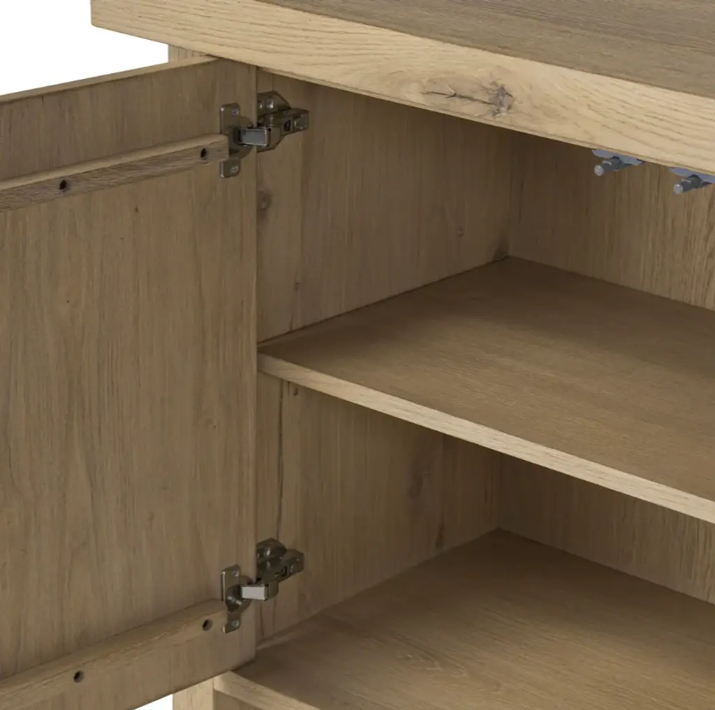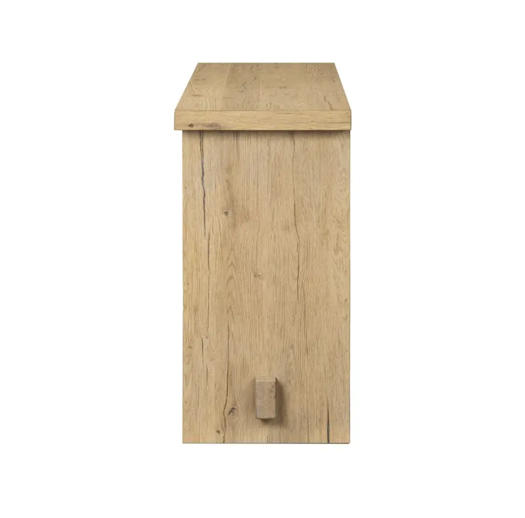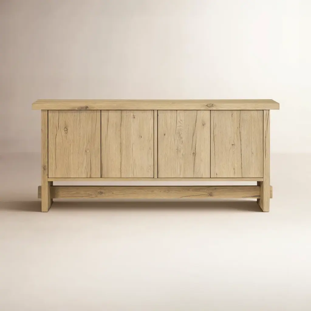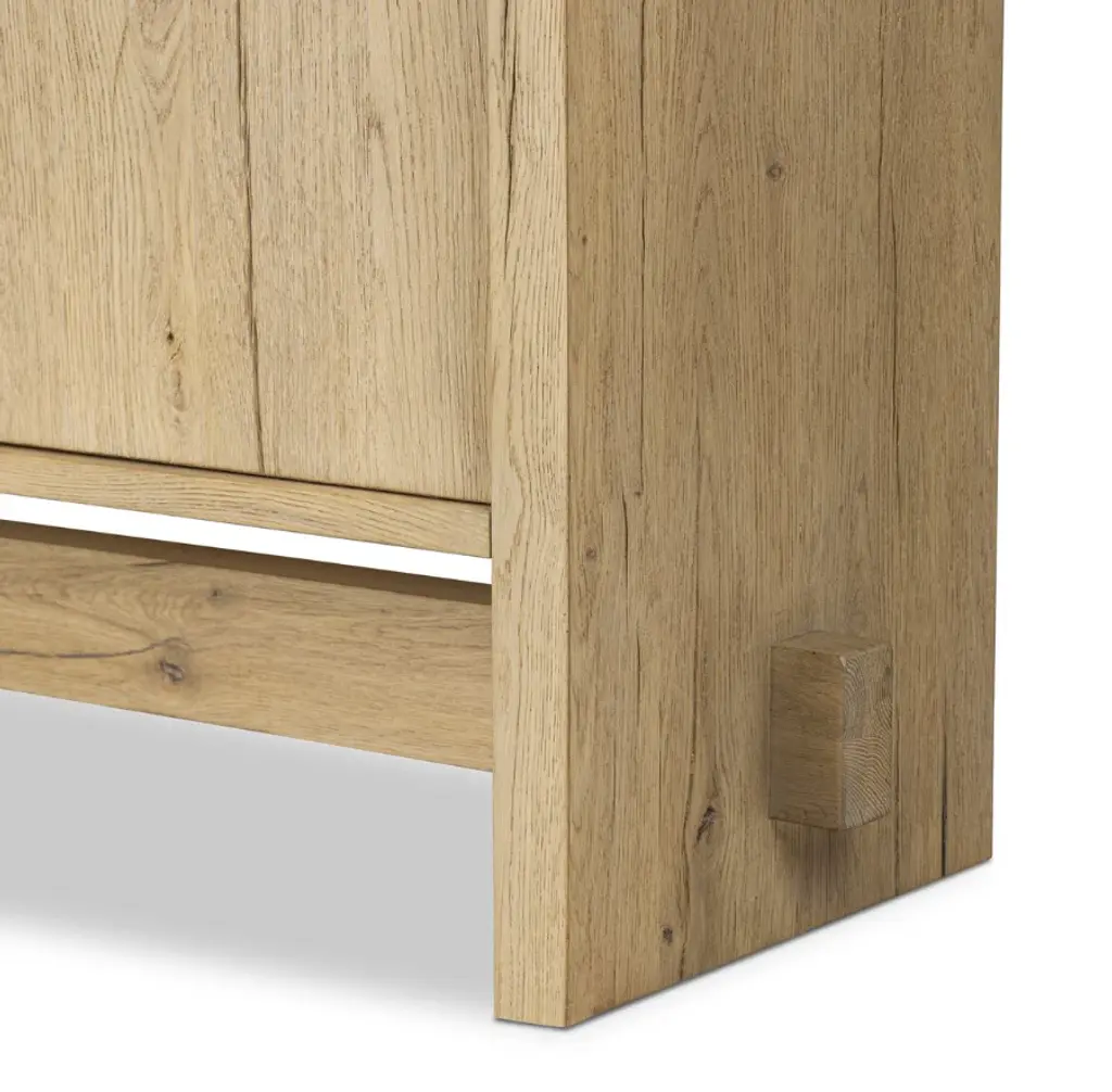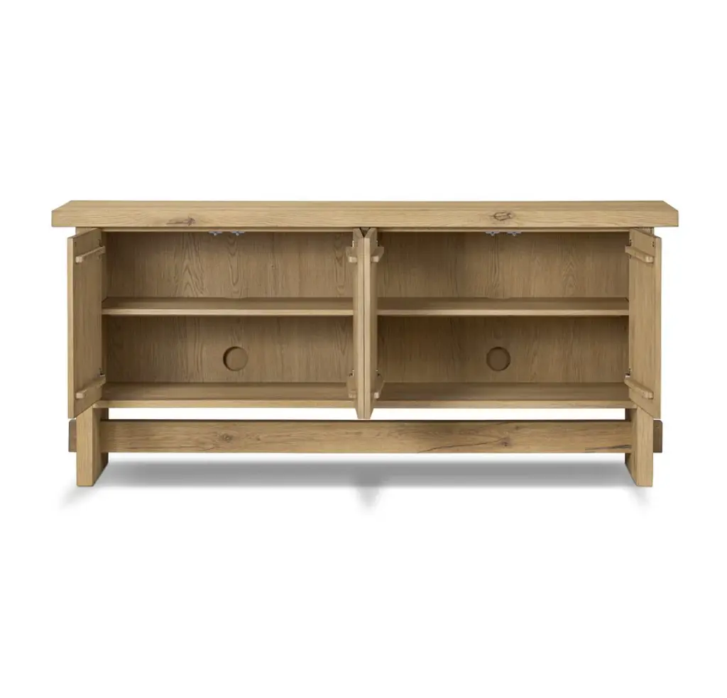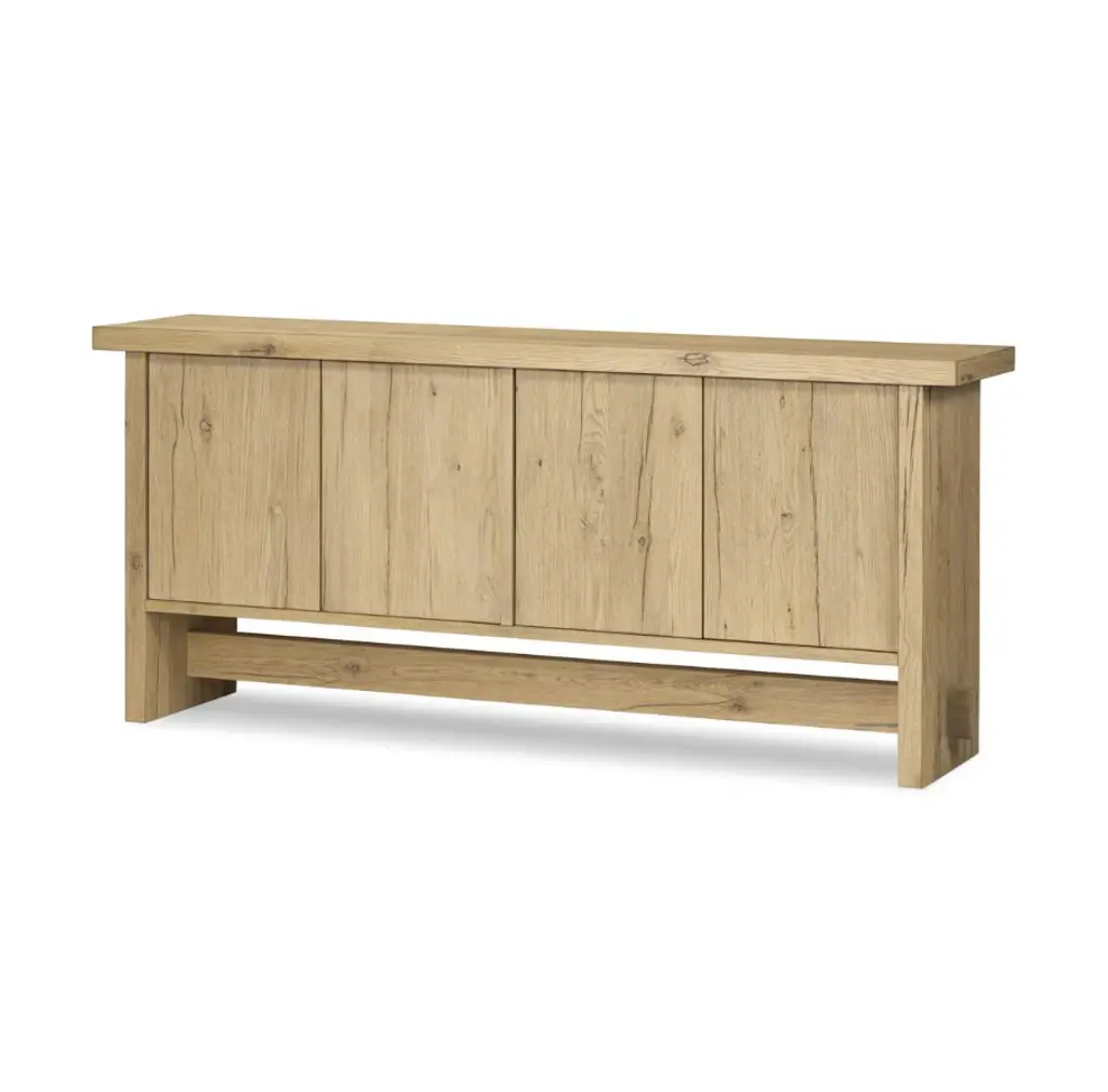 The timeless Norely sideboard is the product of a design collaboration between Amber Lewis and Four Hands. It showcases a light blonde oak finish with an overhanging top and stretcher details that emphasize the wood’s natural qualities.