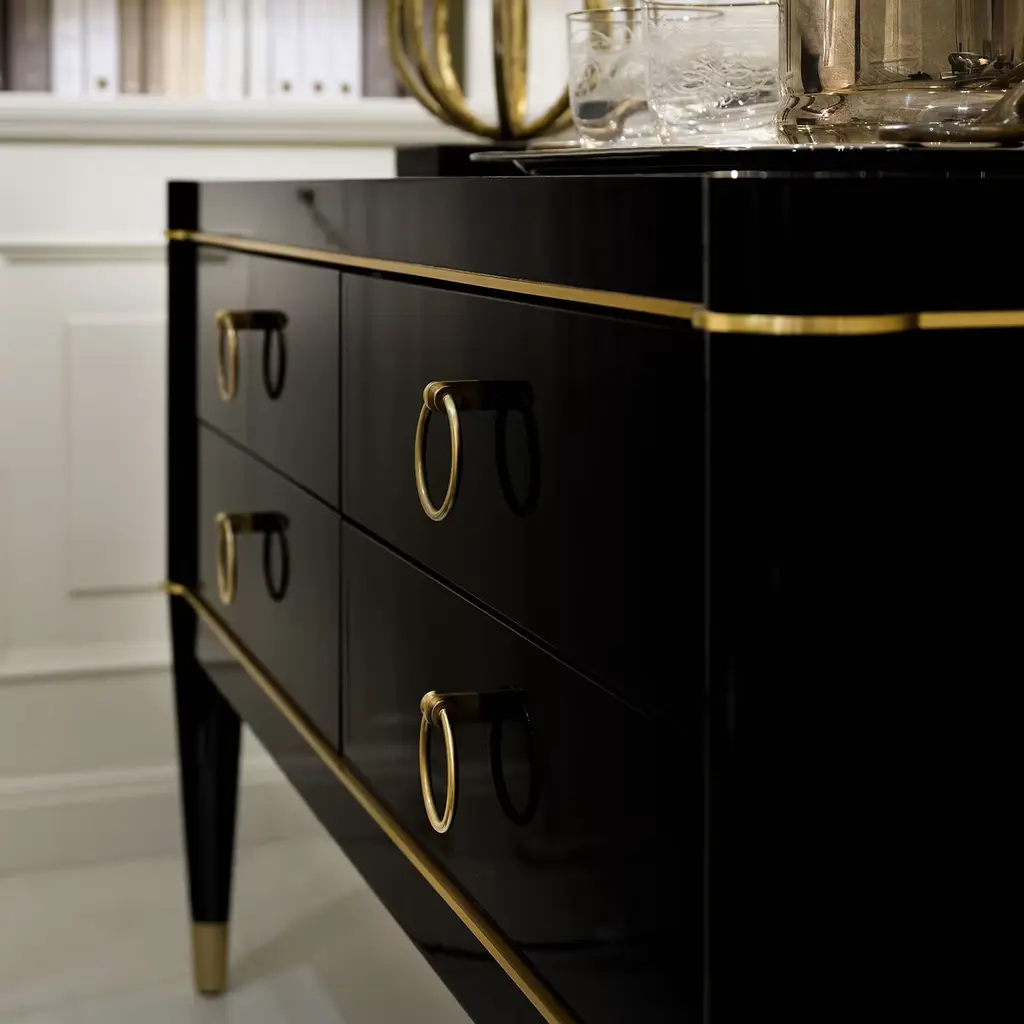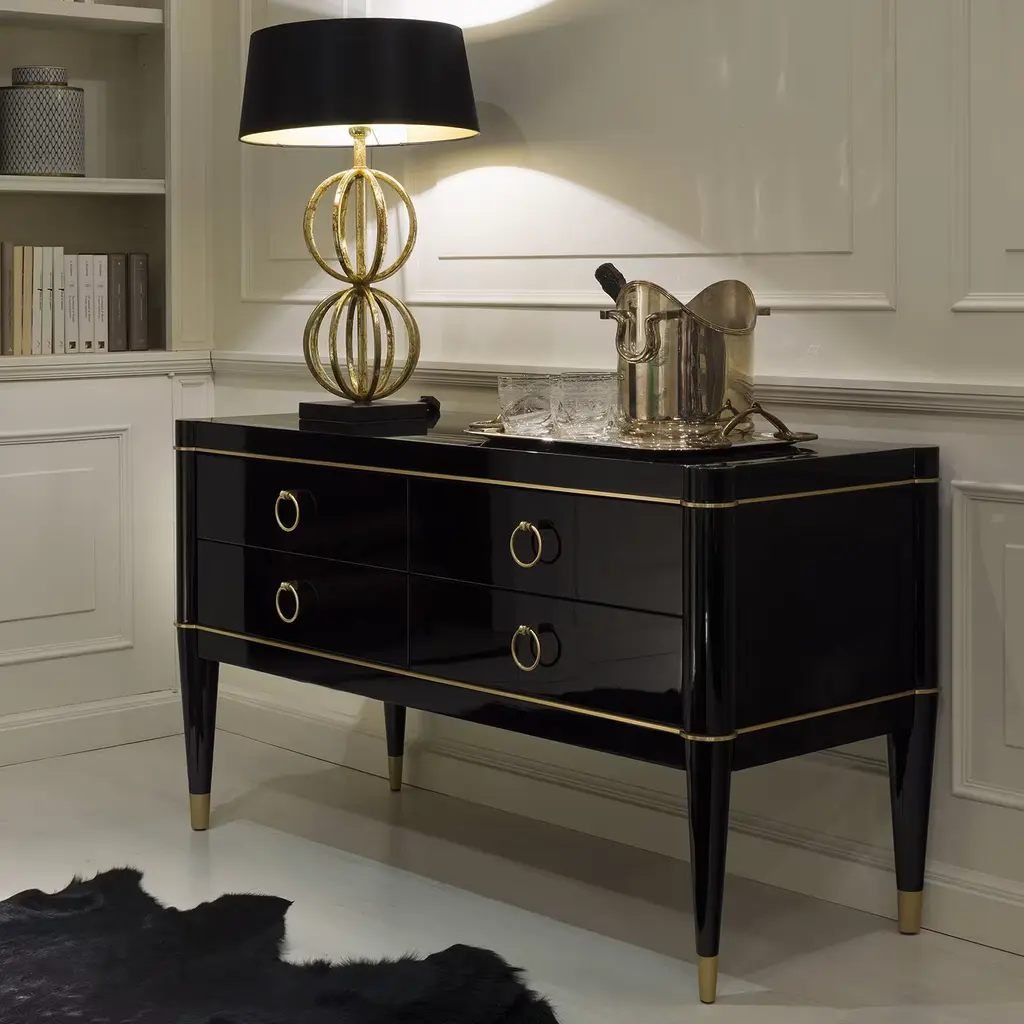 This stunning sideboard will add a glamorous, retro-chic charm to a classic or modern interior, used as console in an entryway or as a display or storage space in a living room, private study or dining room. Its linear shape is crafted of solid wood with inserts in brass with a satin finish around the perimeter, on the feet and on the handles of the four drawers. The solid wood alternates with lacquered wood to create a distinctive dynamic texture. The drawers are equipped with Bluemotion guides and feature a back in faux-leather. The metal can have a bronze finish.