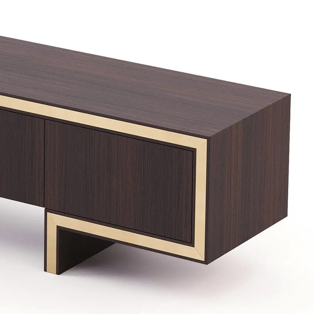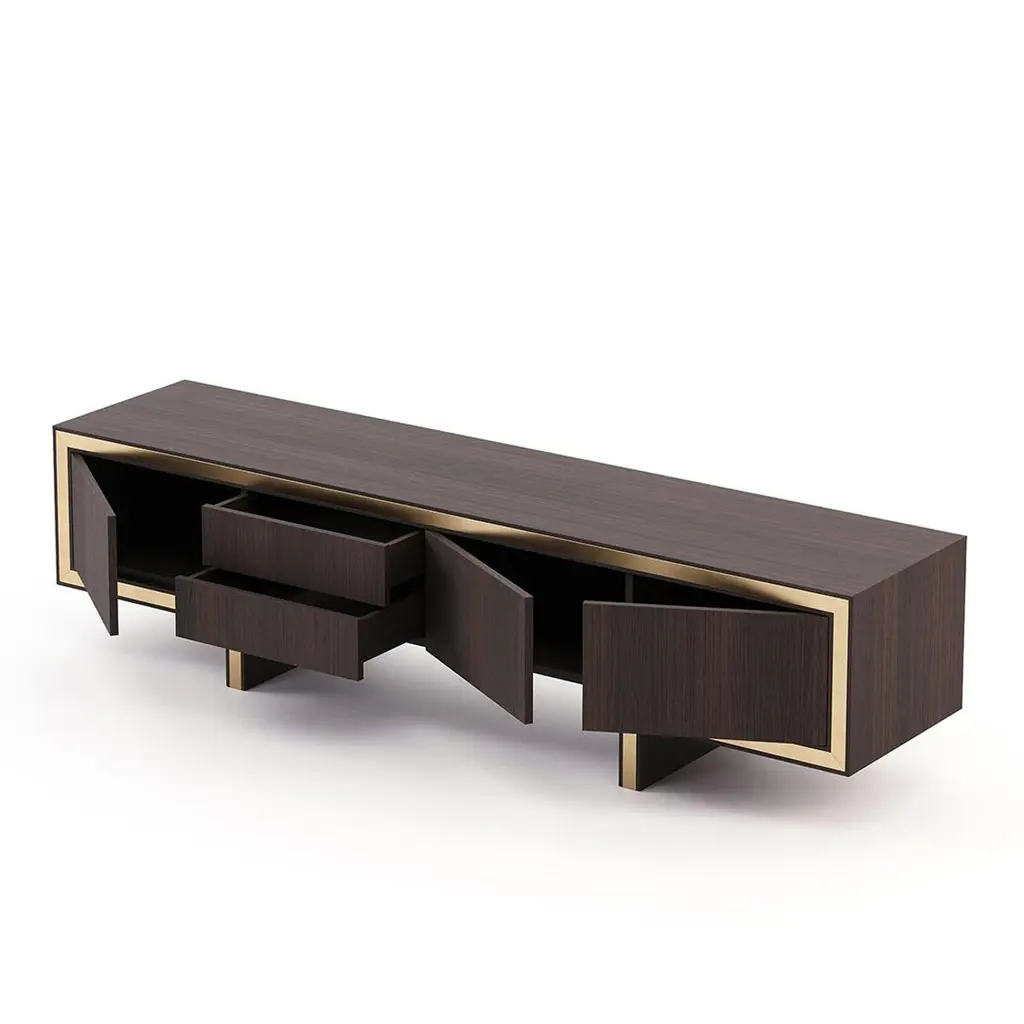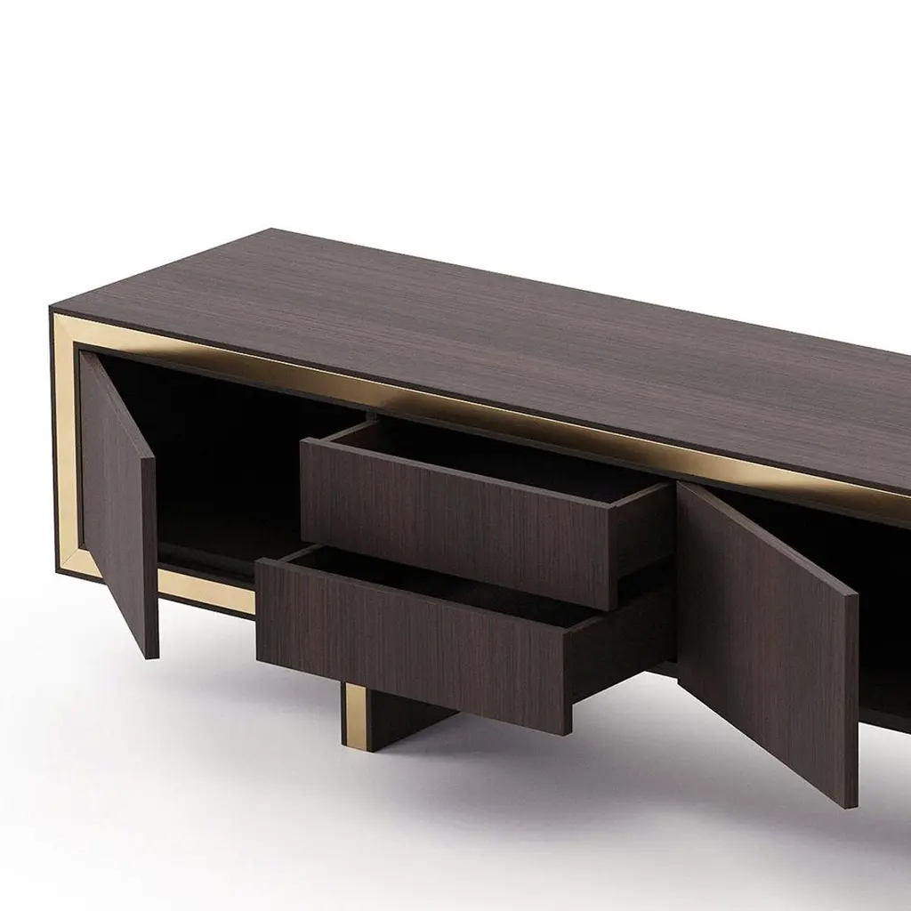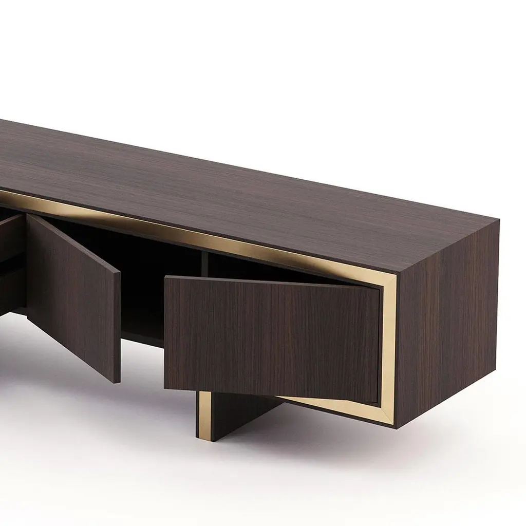 Sideboard Andora TV with structure in smocked eucalyptus veneeredwood in matte finish, with polished stainless steel trim in gold finish.With 3 doors and 2 drawers with easy glide system.Also available in ebony matte finish, or grey oak matte finish,or natural oak finish, or rosewood matte finish, or in walnutmatte finish, on request.