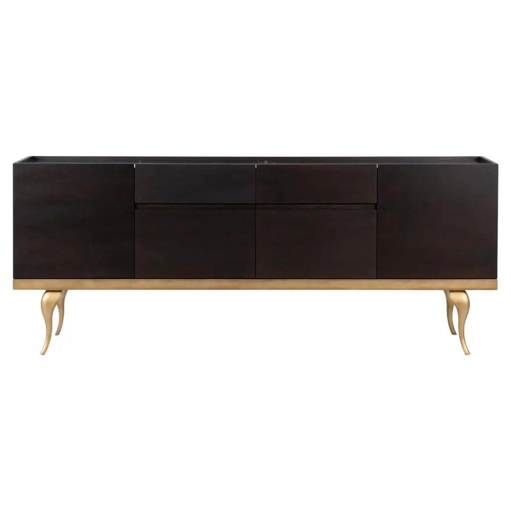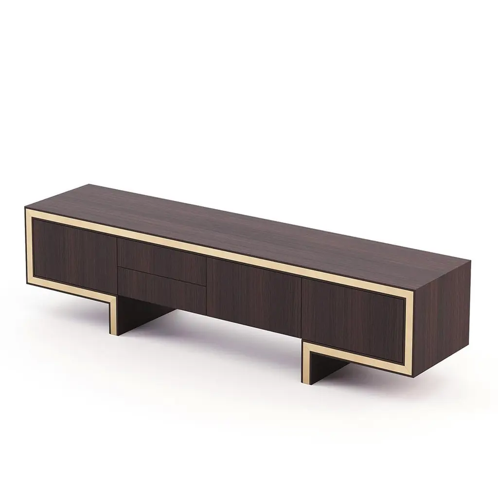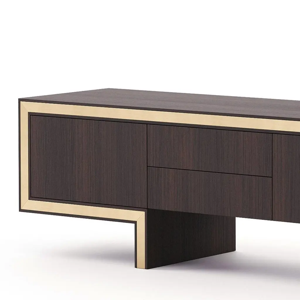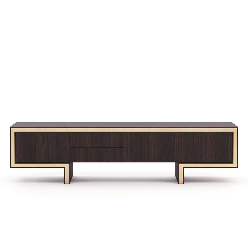 Sideboard Andora TV with structure in smocked eucalyptus veneeredwood in matte finish, with polished stainless steel trim in gold finish.With 3 doors and 2 drawers with easy glide system.Also available in ebony matte finish, or grey oak matte finish,or natural oak finish, or rosewood matte finish, or in walnutmatte finish, on request.