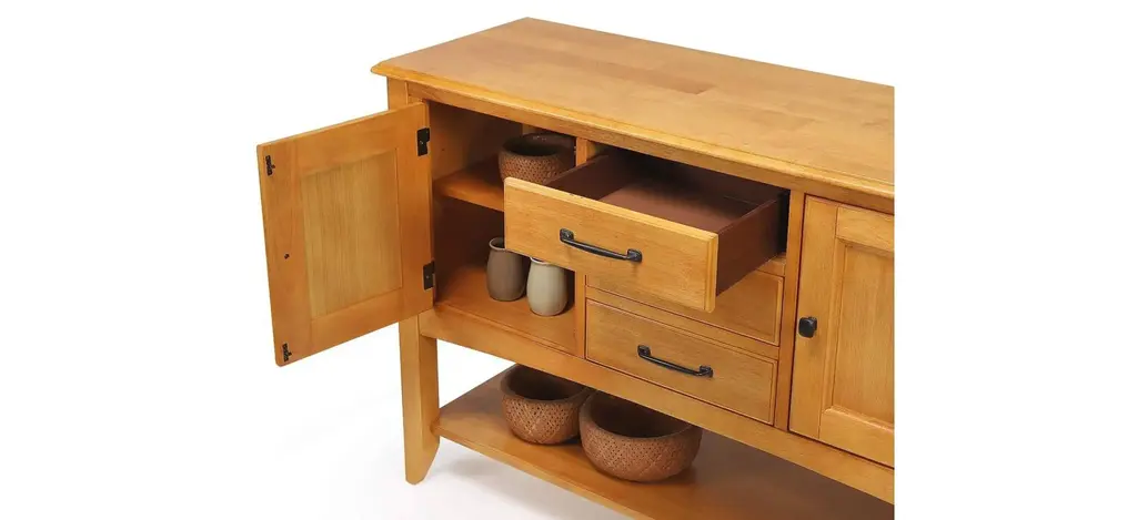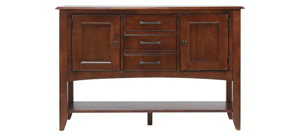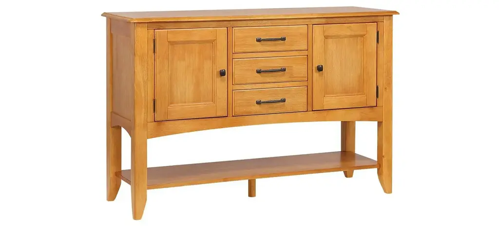 Traditional, farmhouse, mission and more the Andrews Sideboard has it all. This transitional sideboard delivers rustic charm while providing organization in your kitchen, office, entryway or home bar. Ideal storage and display solution with three spacious drawers, two closed door cabinets and a large open shelf for baskets, books, dishes and serving plates. Perfect for your before, during and after dinner party needs.