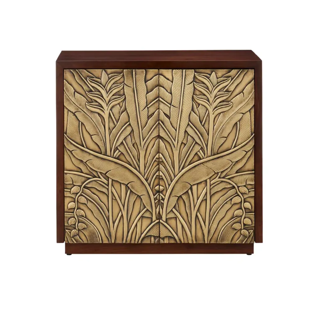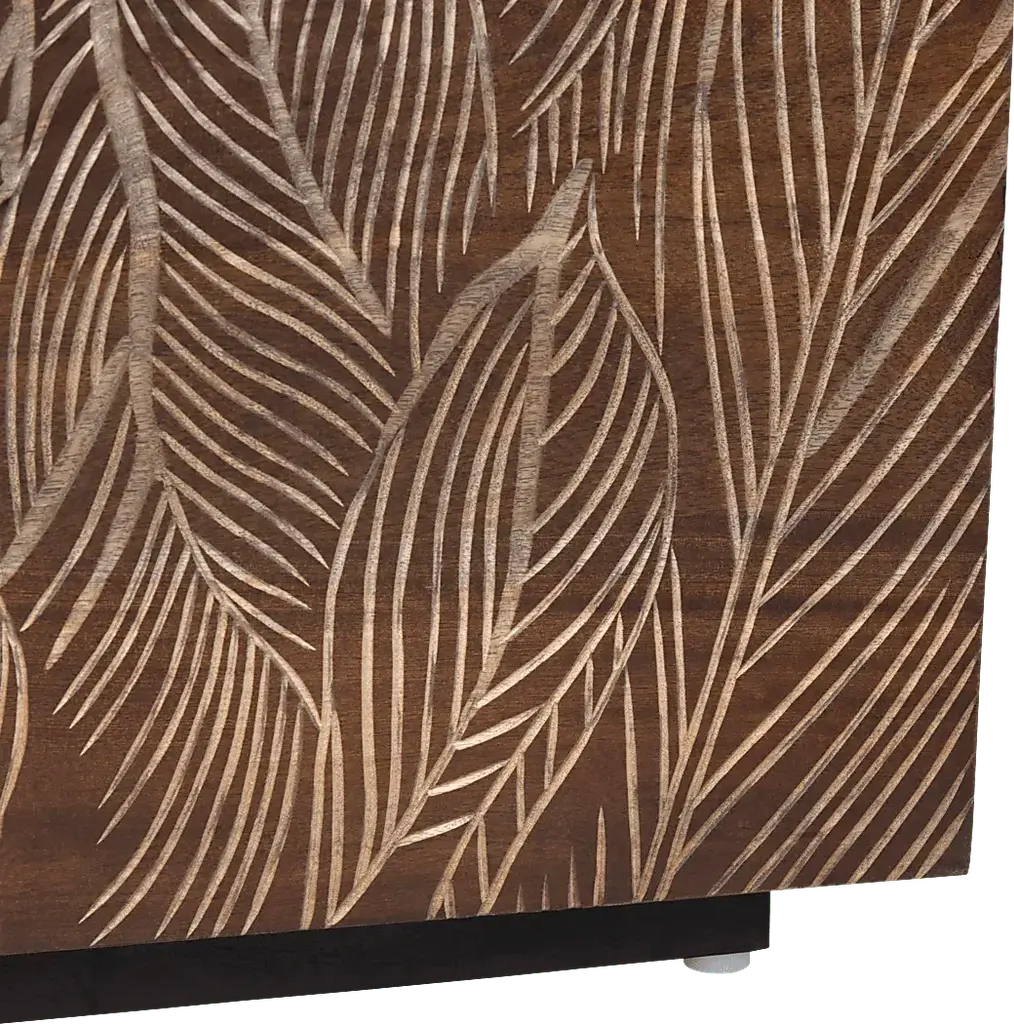 Elevate your space with the Angelicoa brown sideboard, crafted from durable mango wood with a rich brown finish that highlights its natural wood grain. The front features intricate tan banana leaf carvings for a unique touch. With four solid wood doors on European hinges, it opens to reveal two removable shelves and two cord management holes, making it perfect for storage or media setups. Equipped with floor levelers and protective glides, this piece is ready to use and blends functionality with elegance.