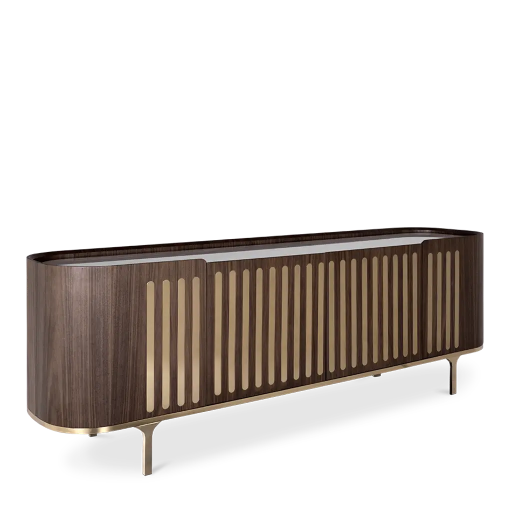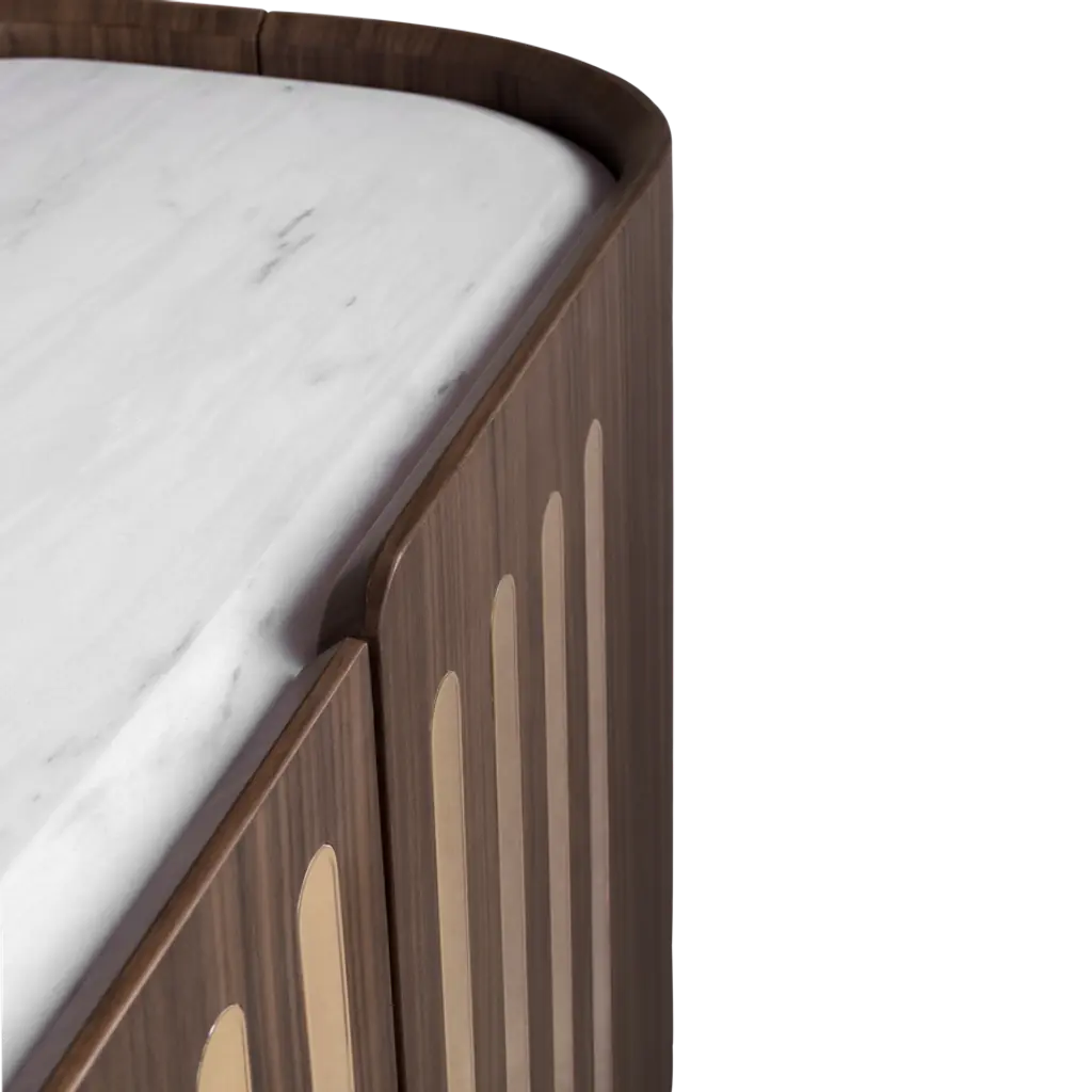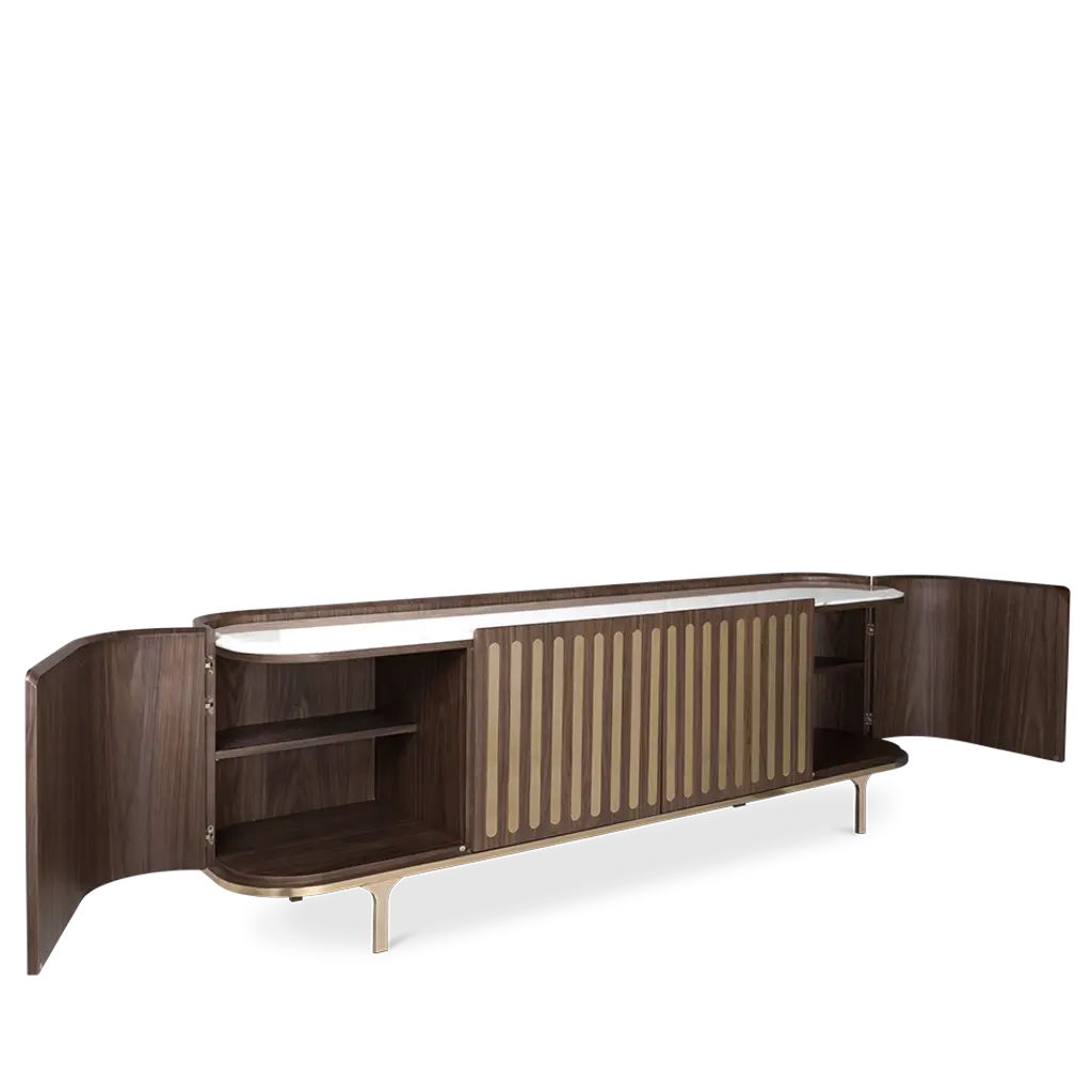Retro met contemporary and created a mid-century modern sideboard, stylish in any house design. Produced in solid walnut wood, topped by a white polished marble and supported by brass square feet. Brings a playful geometric pattern on its doors, accented by the brass trim all over the body.