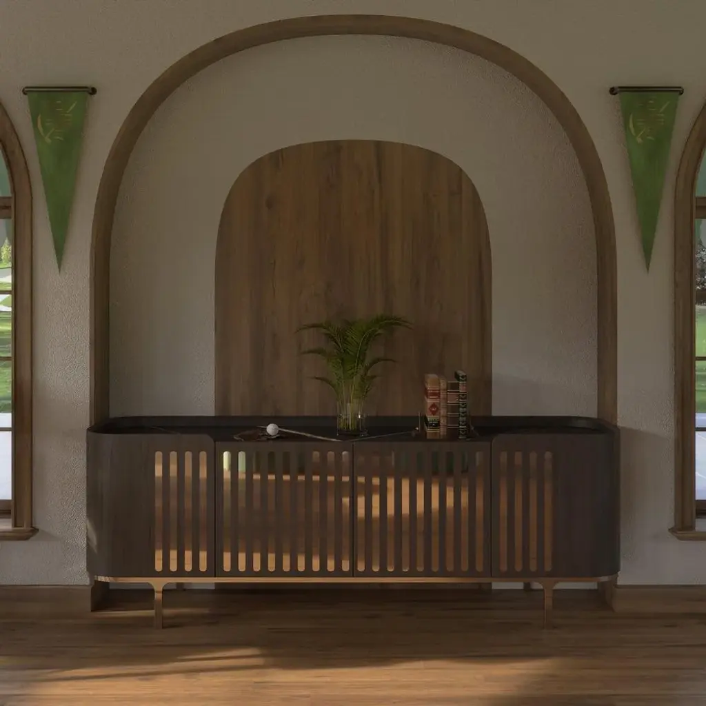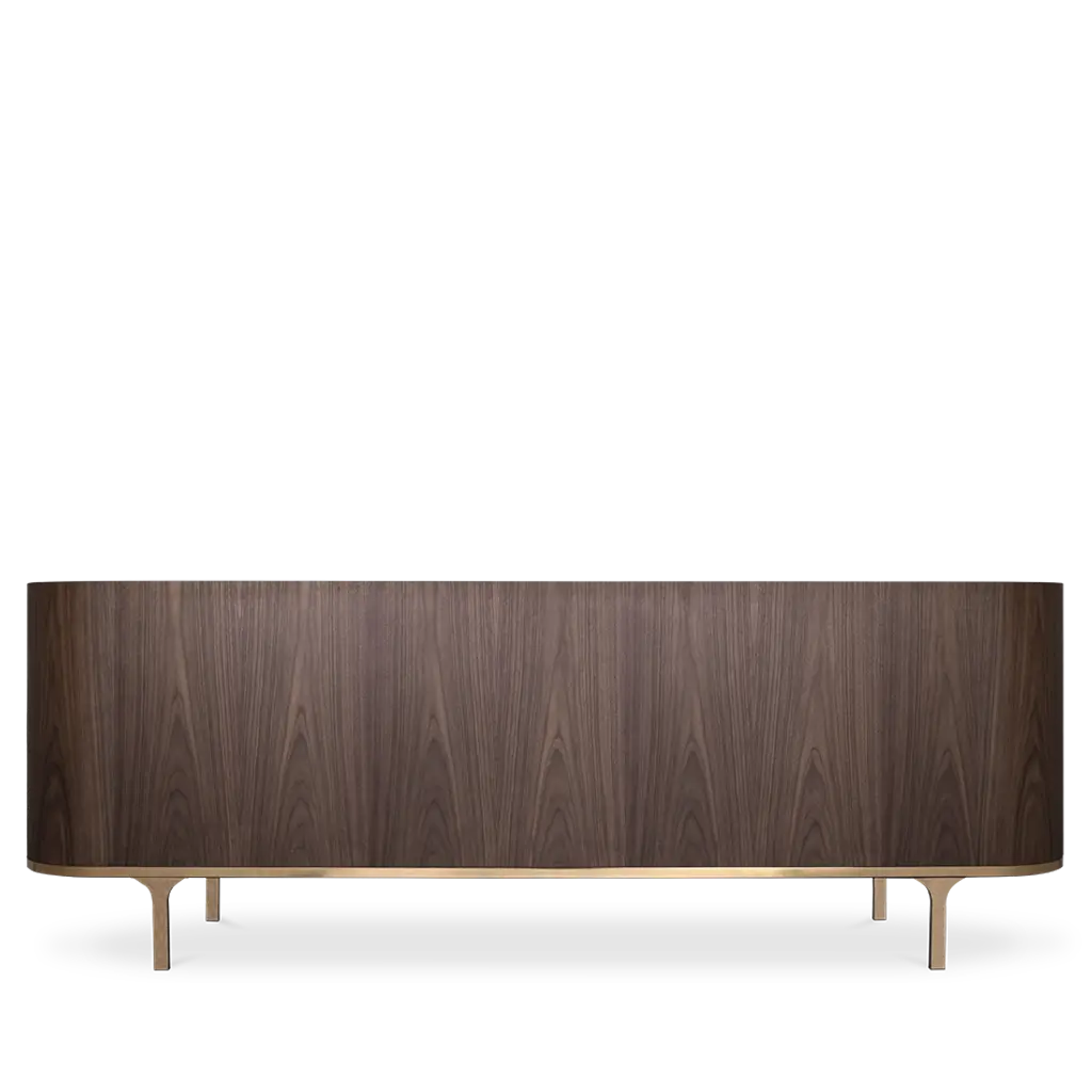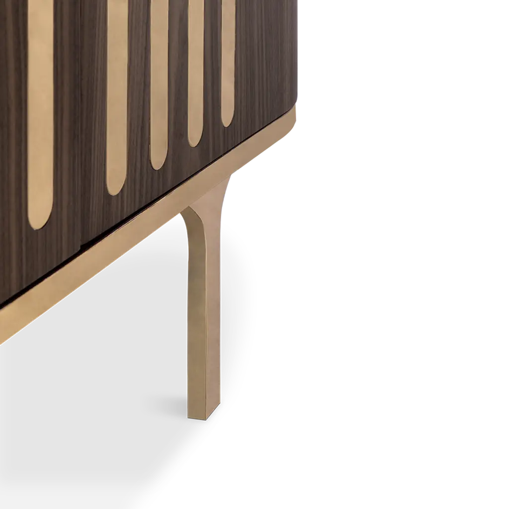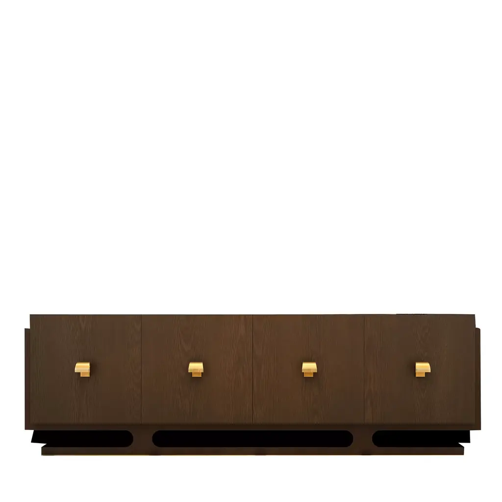 Retro met contemporary and created a mid-century modern sideboard, stylish in any house design. Produced in solid walnut wood, topped by a white polished marble and supported by brass square feet. Brings a playful geometric pattern on its doors, accented by the brass trim all over the body.