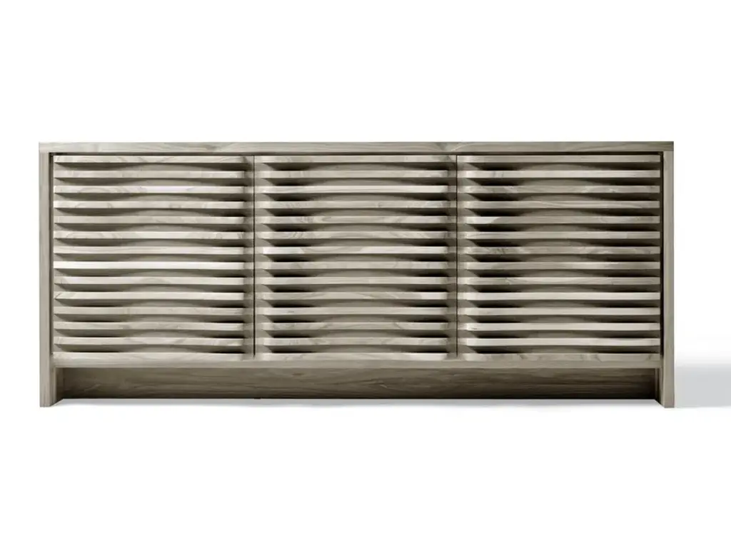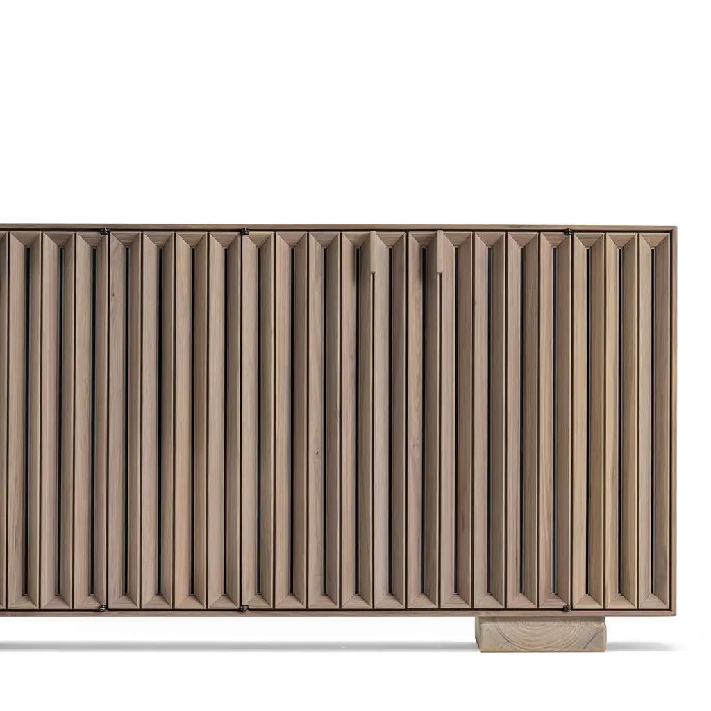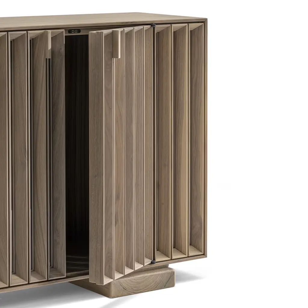 Four doors container, composed of windowed elements joined together by hidden joints. This sideboard is mounted on two feet.