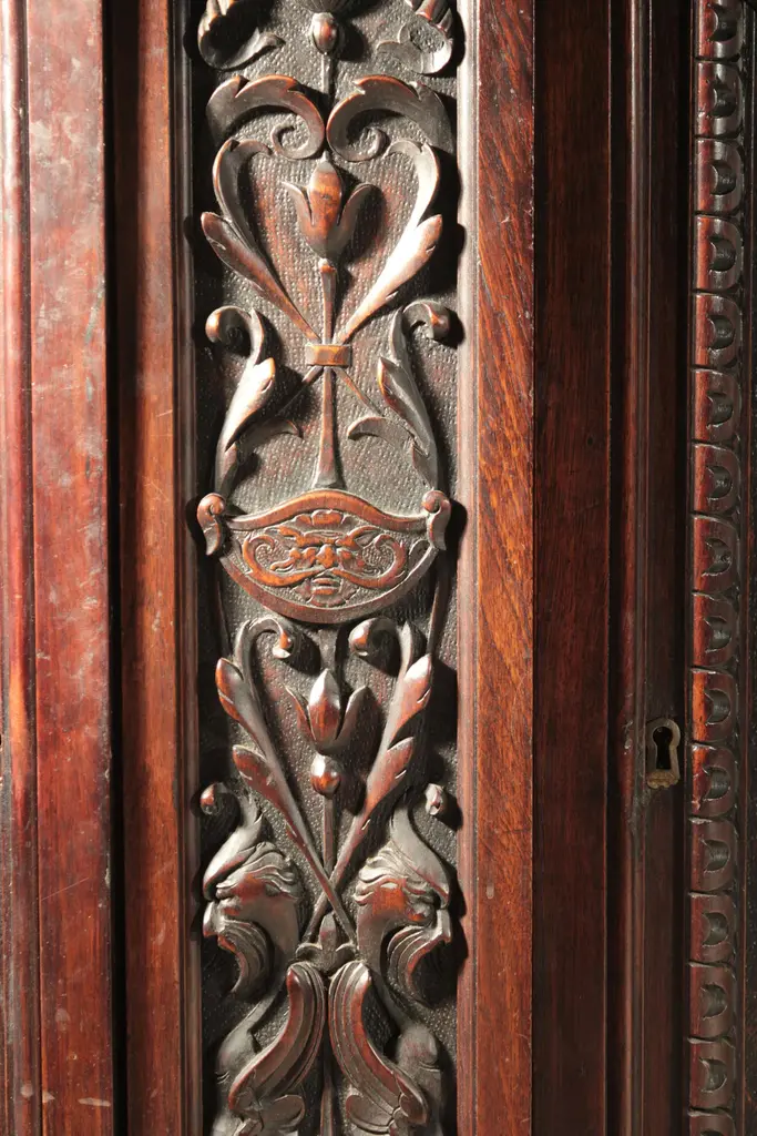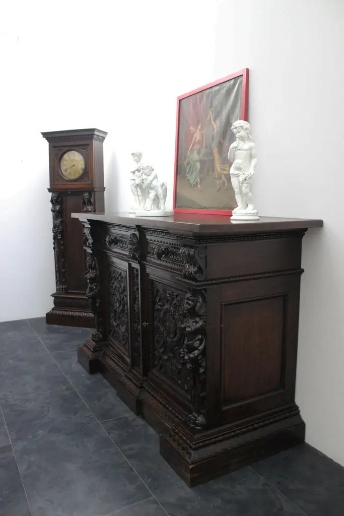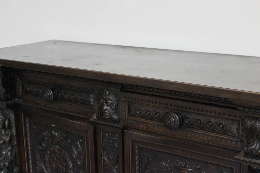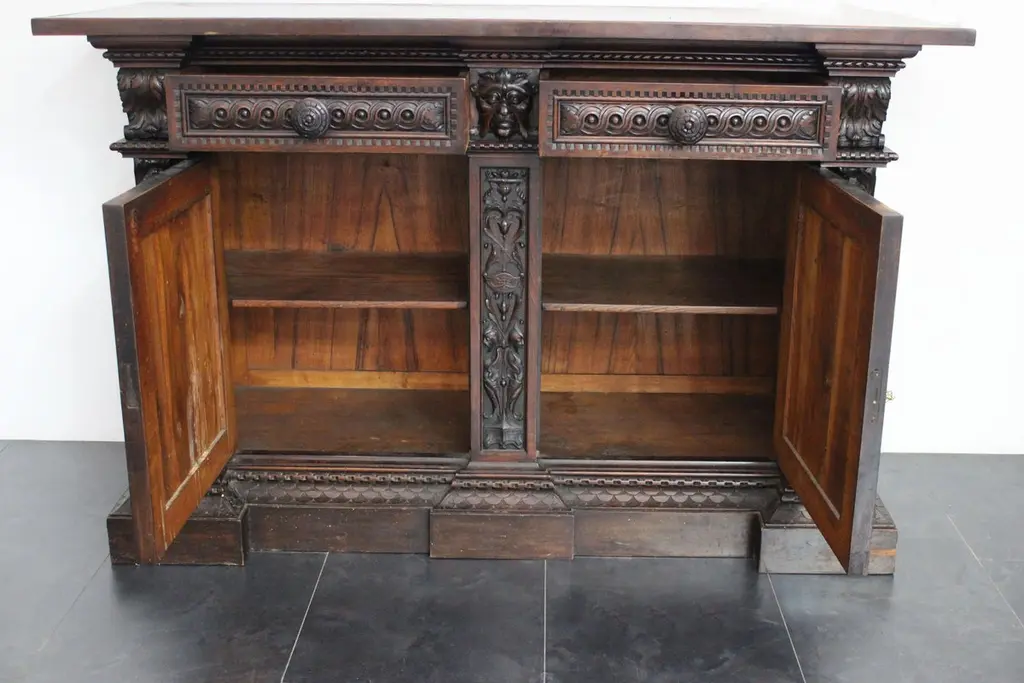 Neo-Renaissance style sideboard, solid walnut wood, dating back to the turn of the 19th and 20th centuries, richly handmade with anthropomorphic sculptures and bas-reliefs, finely carved with geometric and floral motifs. Packaging with bubble wrap and cardboard boxes is included. If the wooden packaging is needed (fumigated crates or boxes) for US and International Shipping, it's required a separate cost (will be quoted separately).