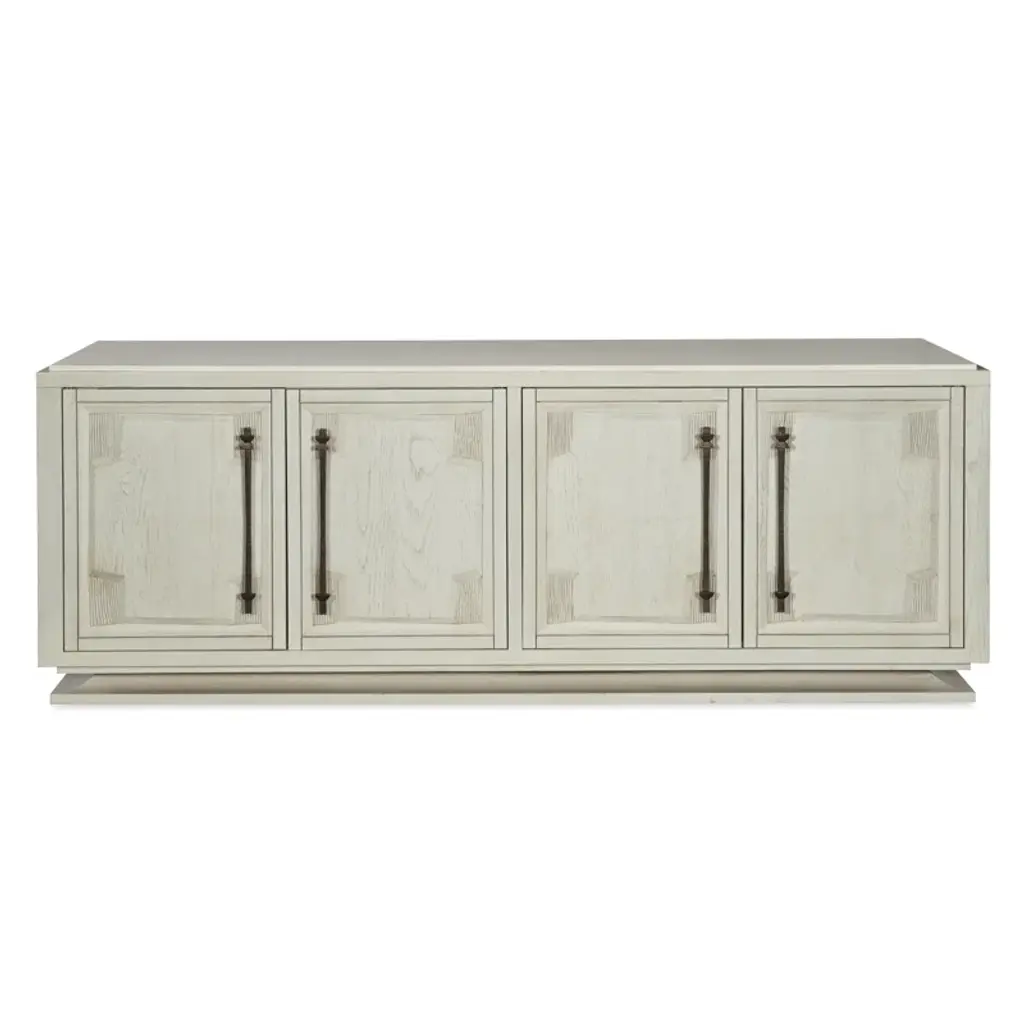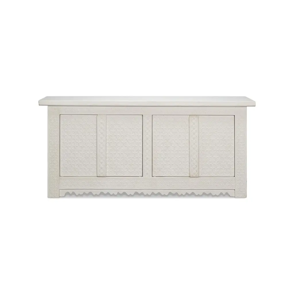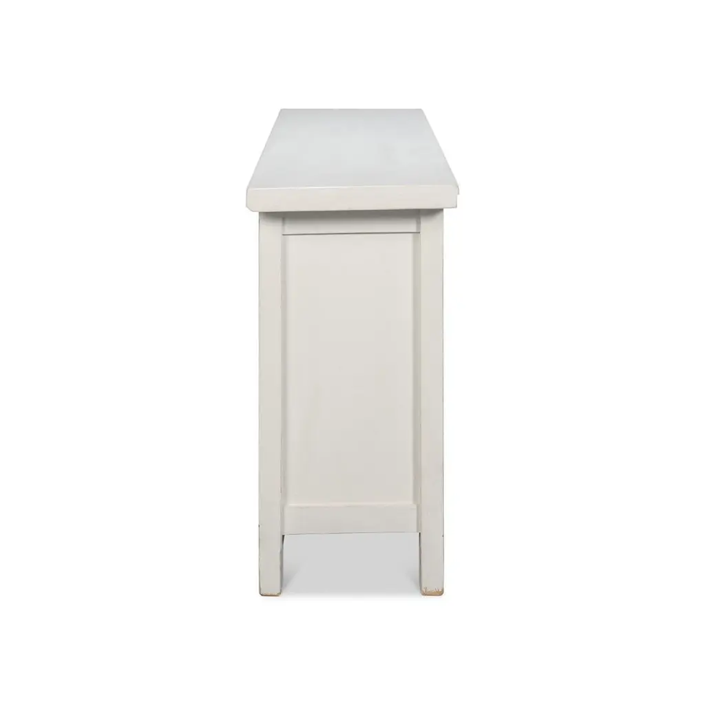 A dynamic piece of furniture suitable for use in a large hallway, in the den, or the dining room. With four doors that open to a painted interior with shelves and made with carved pine and a hand-rubbed antique white finish.Dimensions: 79" W x 19" D x 35" H