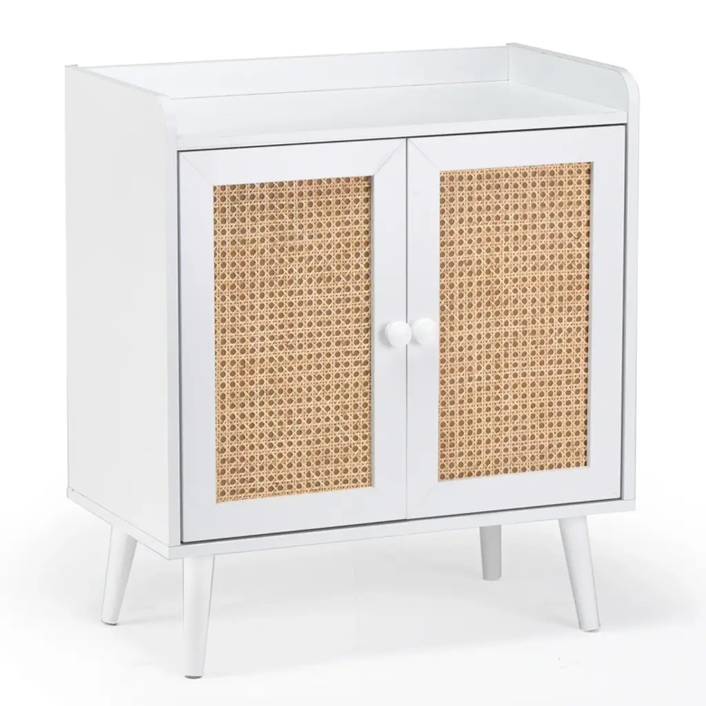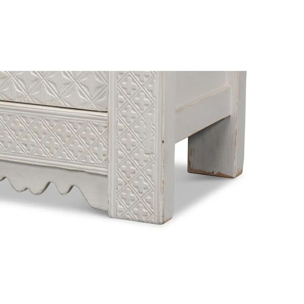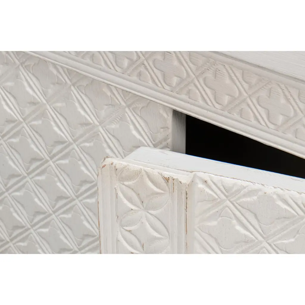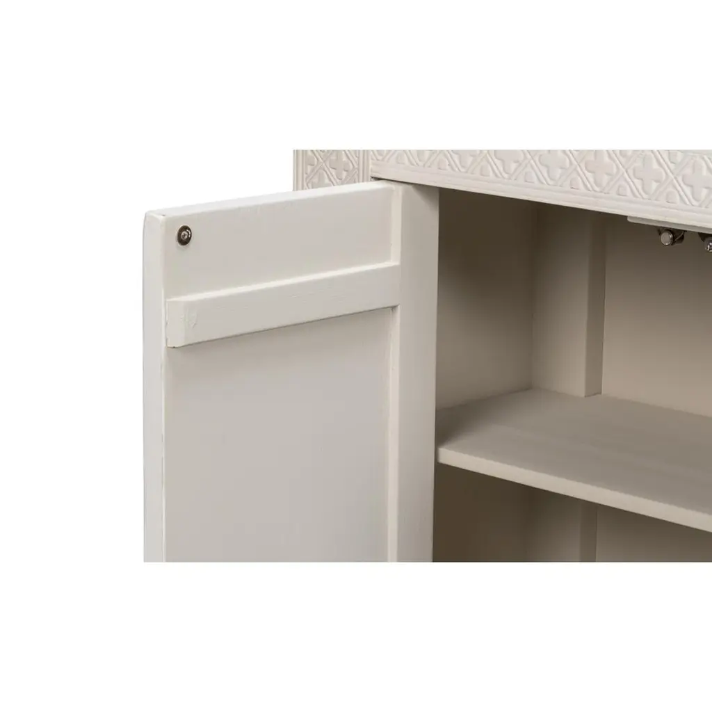 A dynamic piece of furniture suitable for use in a large hallway, in the den, or the dining room. With four doors that open to a painted interior with shelves and made with carved pine and a hand-rubbed antique white finish.Dimensions: 79" W x 19" D x 35" H