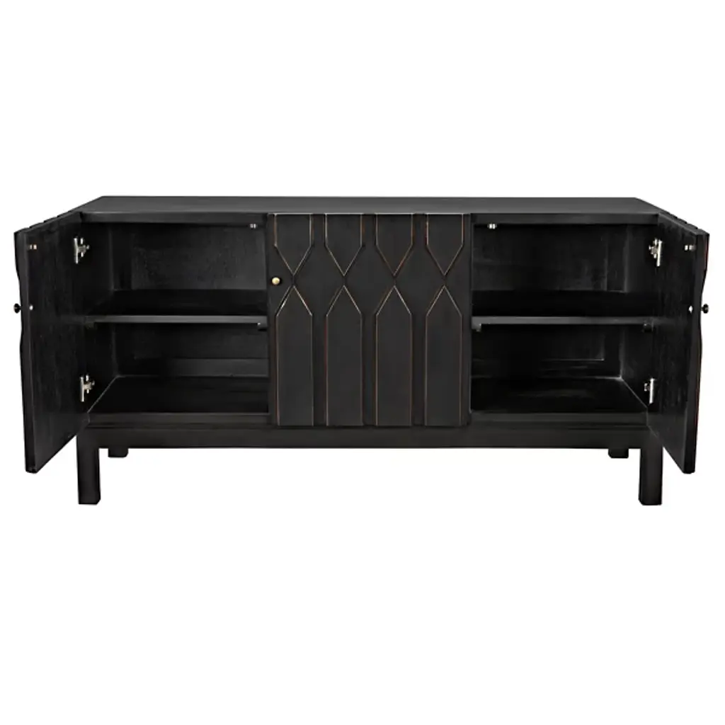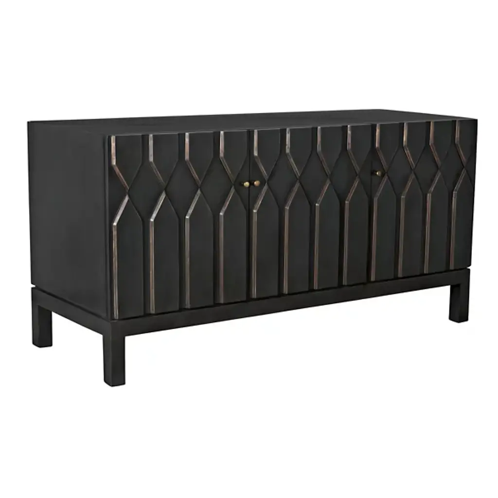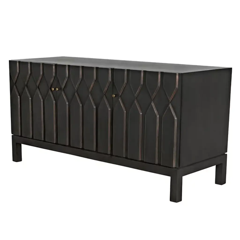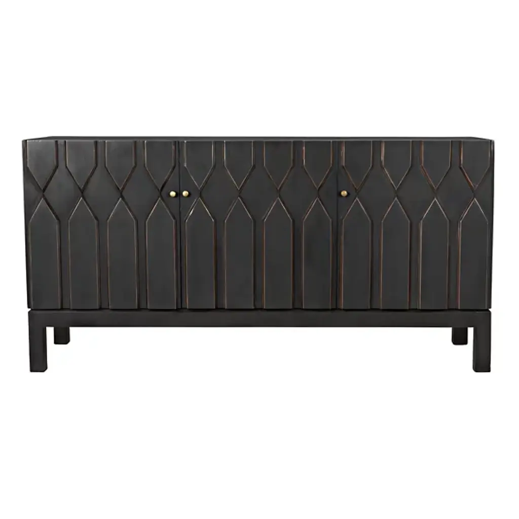 The rectangular wooden appeal of the Anubis Sideboard from Noir makes a pointed, focused addition to indoor living spaces. Elevated on four short legs, it offers the comfort and security of a “picket fence” style geometric relief carved into each of its three doors that open to reveal a spacious interior with a single shelf. The mahogany and veneer construction offers sturdy support, contrasted by the rich brass pulls, easily accessed, by their placement in depressions where the carved picket points meet.