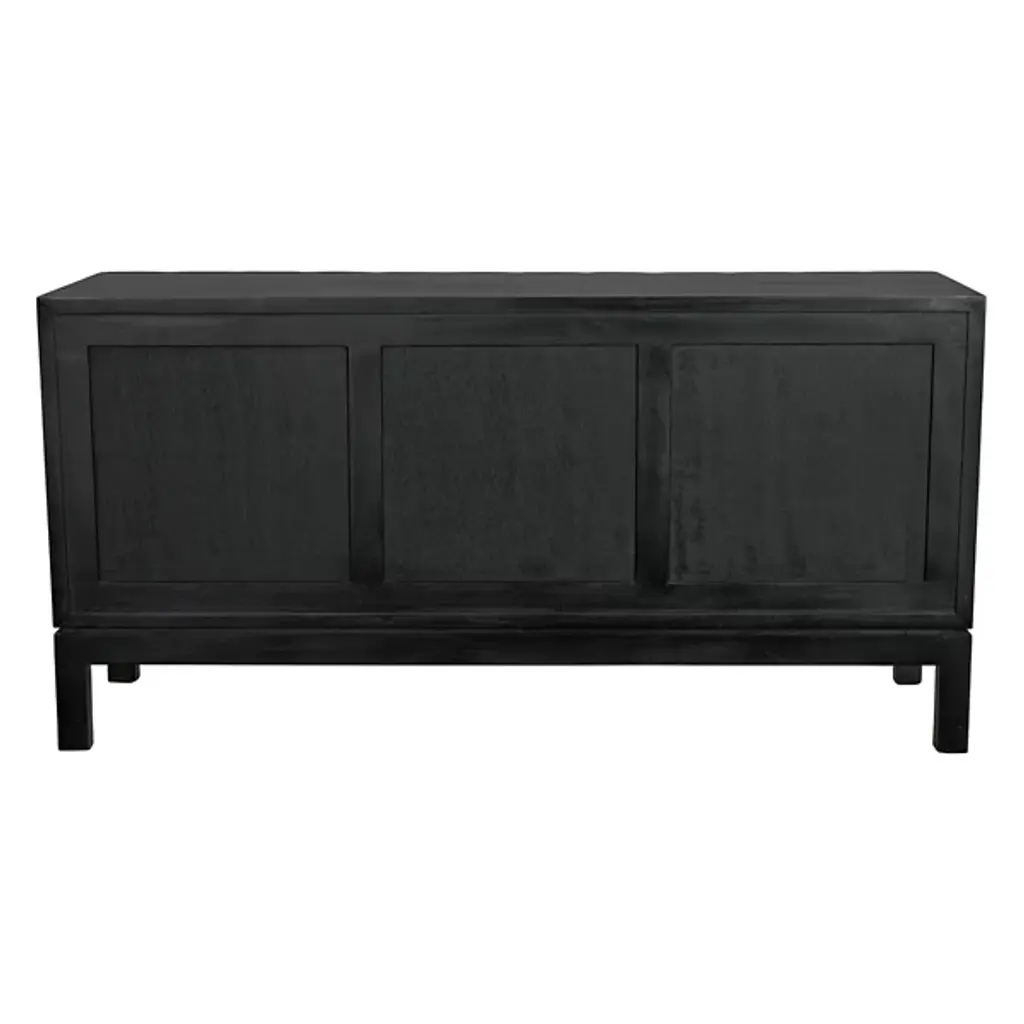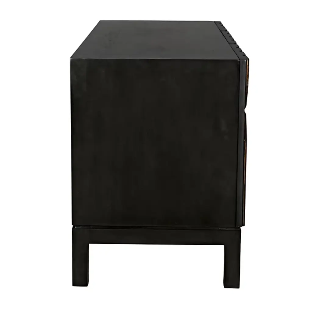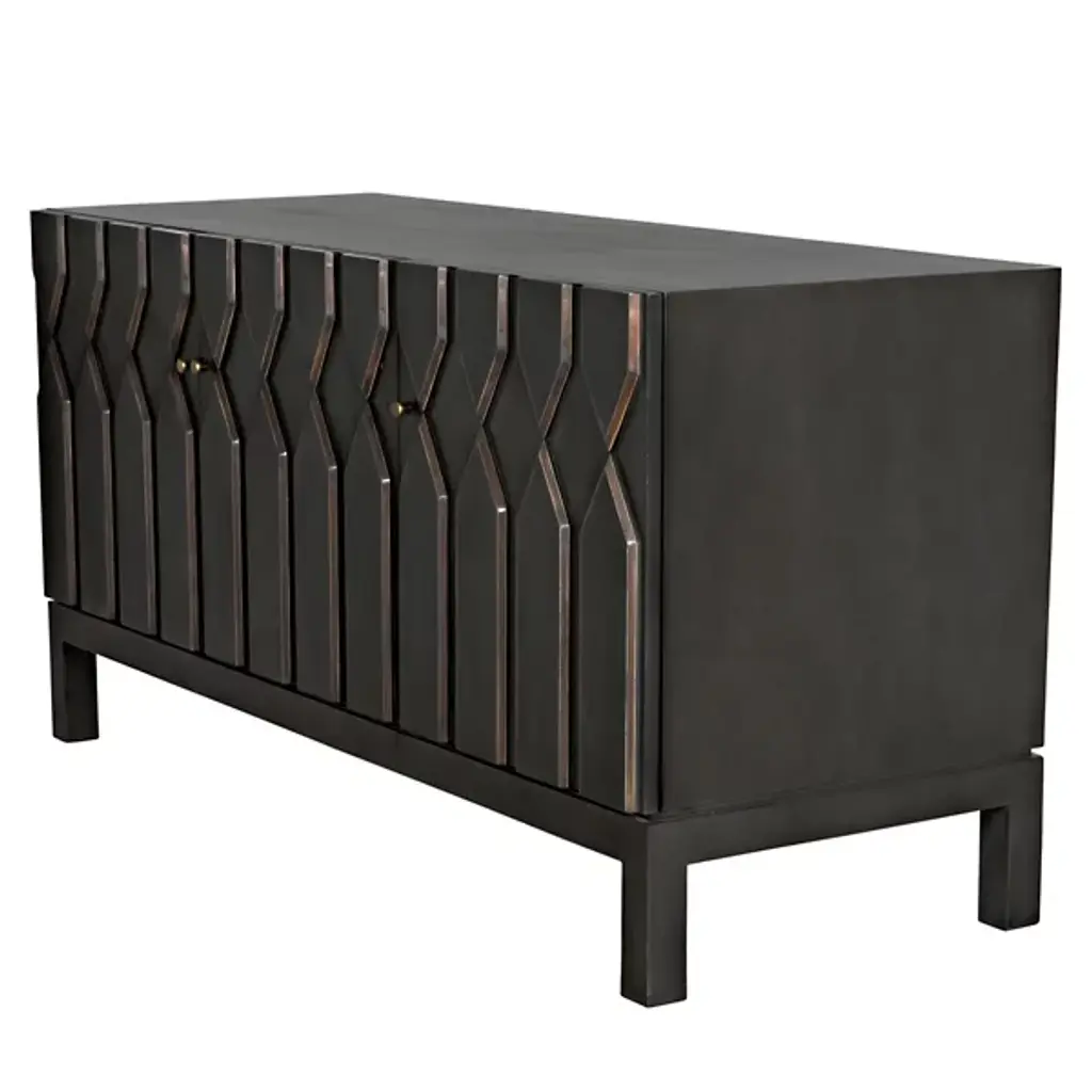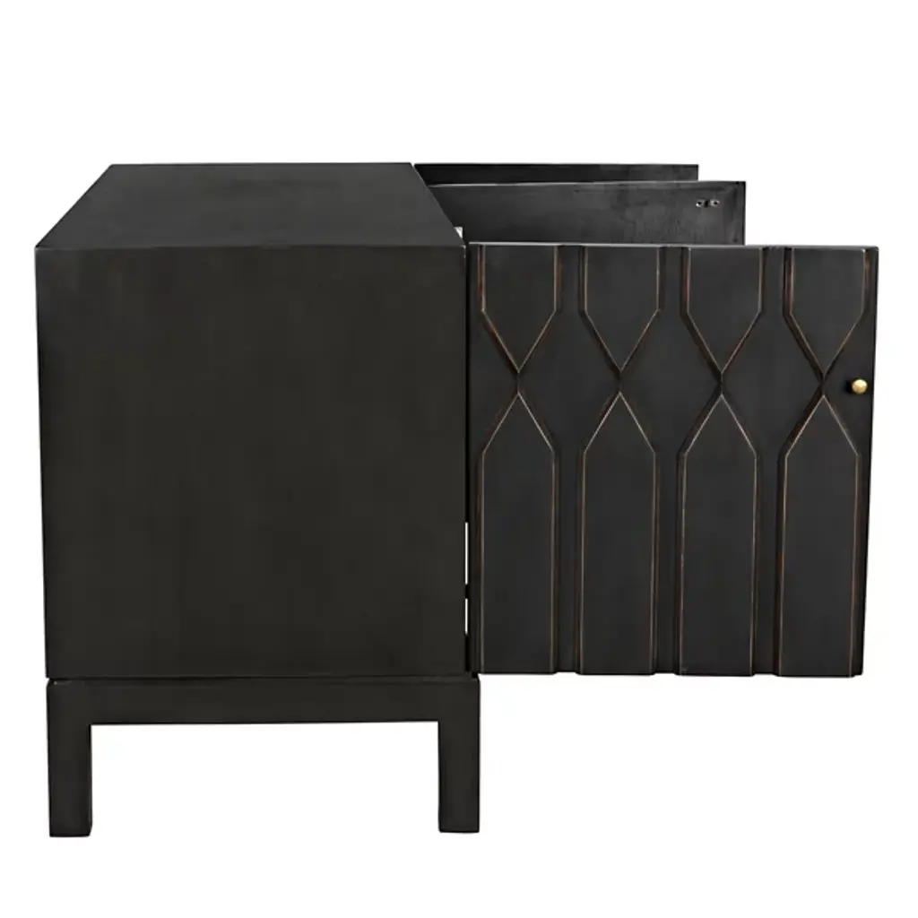 The rectangular wooden appeal of the Anubis Sideboard from Noir makes a pointed, focused addition to indoor living spaces. Elevated on four short legs, it offers the comfort and security of a “picket fence” style geometric relief carved into each of its three doors that open to reveal a spacious interior with a single shelf. The mahogany and veneer construction offers sturdy support, contrasted by the rich brass pulls, easily accessed, by their placement in depressions where the carved picket points meet.