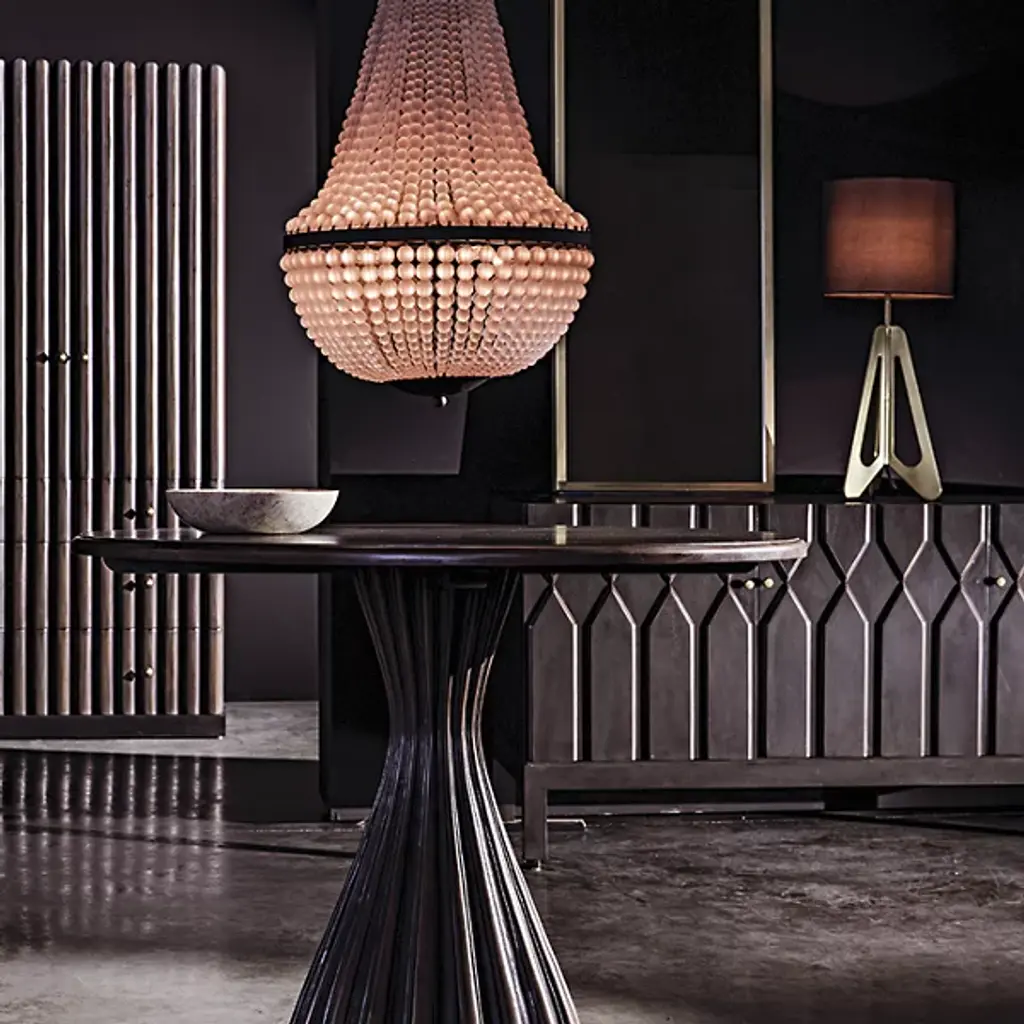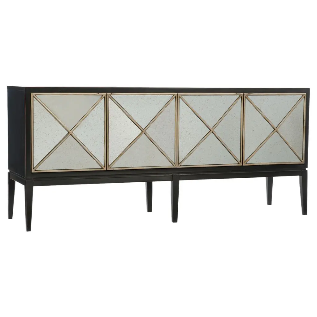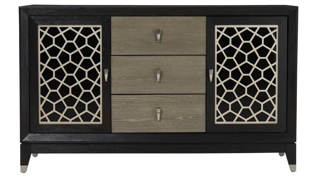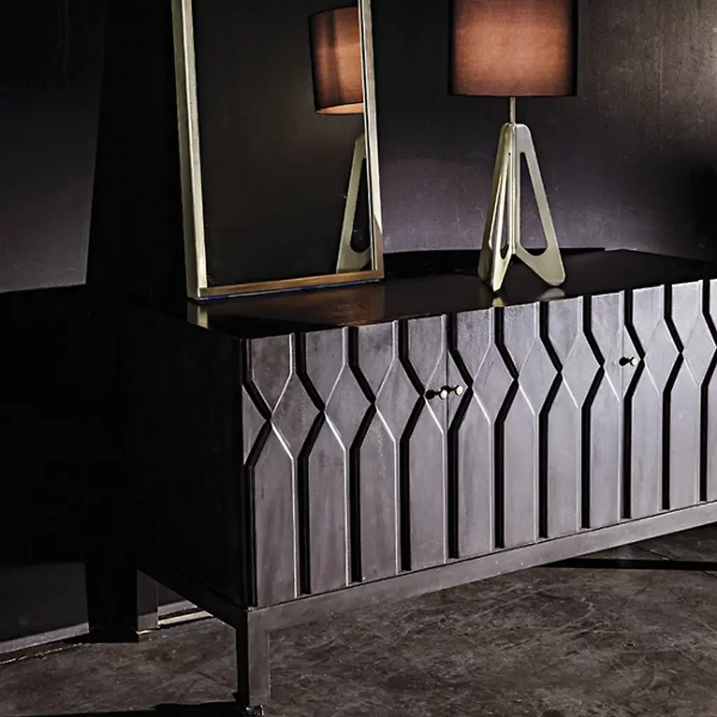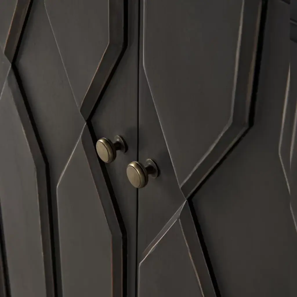 The rectangular wooden appeal of the Anubis Sideboard from Noir makes a pointed, focused addition to indoor living spaces. Elevated on four short legs, it offers the comfort and security of a “picket fence” style geometric relief carved into each of its three doors that open to reveal a spacious interior with a single shelf. The mahogany and veneer construction offers sturdy support, contrasted by the rich brass pulls, easily accessed, by their placement in depressions where the carved picket points meet.