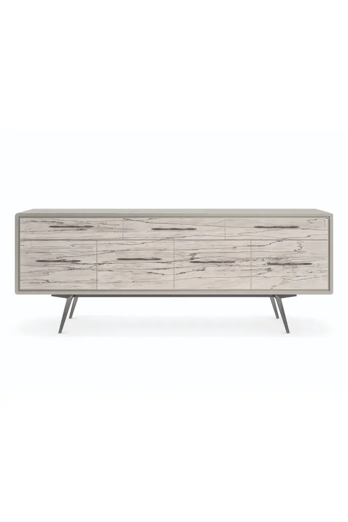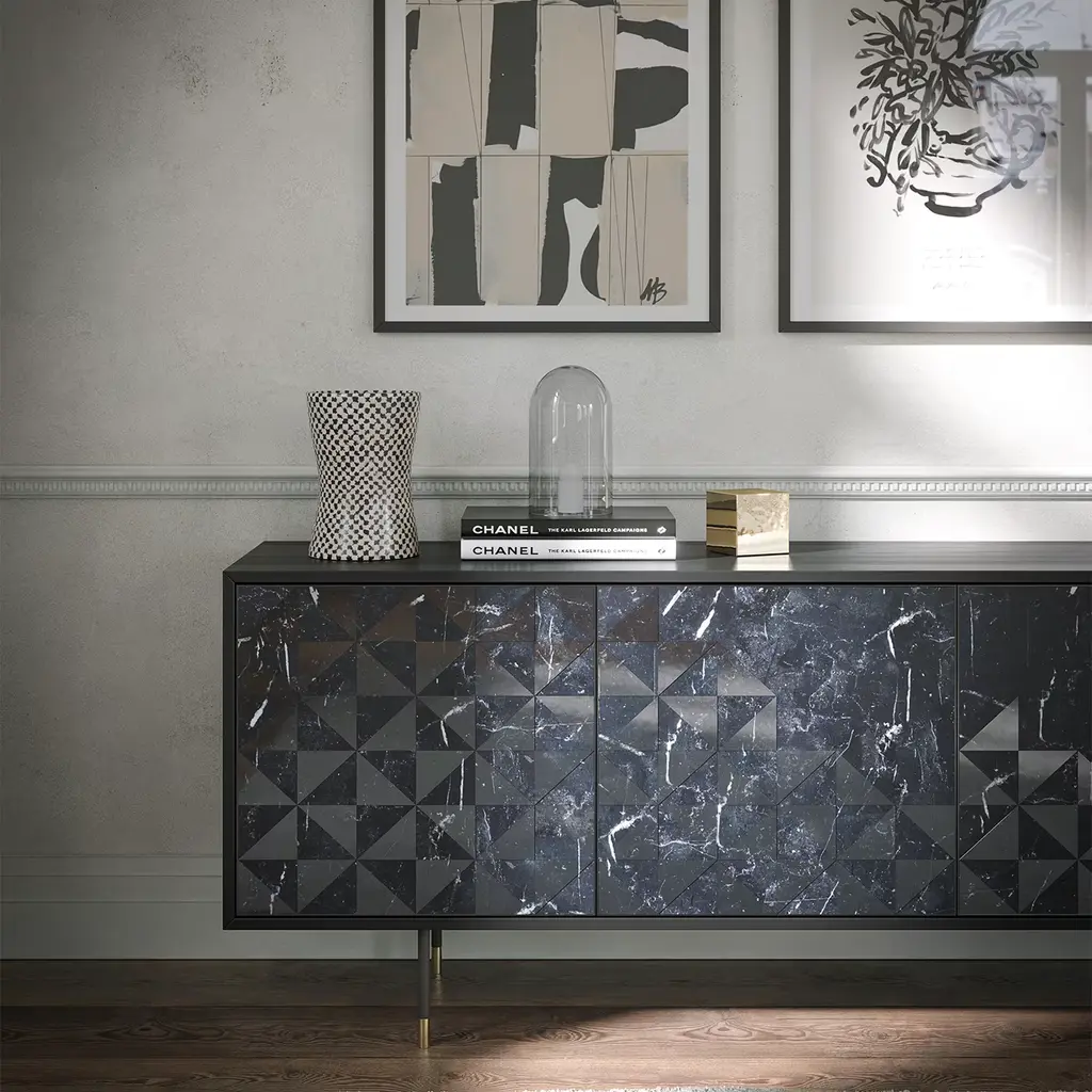 A geometric pattern fading into unpredictable veins marks the lively motif this sideboard fiercely boasts throughout its four doors. Crafted with meticulous artisan care, it states its minimalist flair through the clean-lined black-stained ash structure that appears seemingly suspended thanks to its couple of thin linear feet with bright tips.