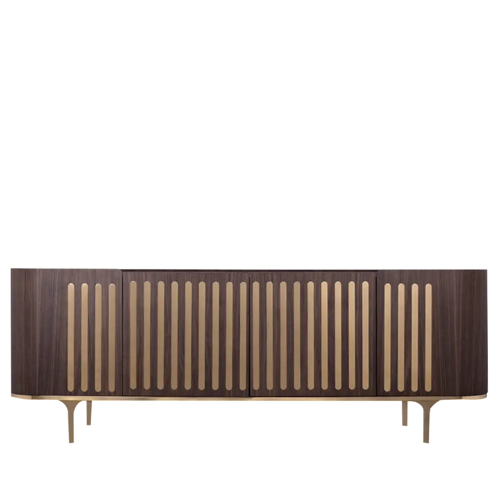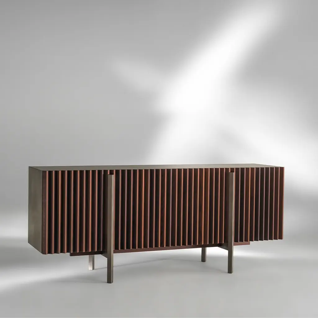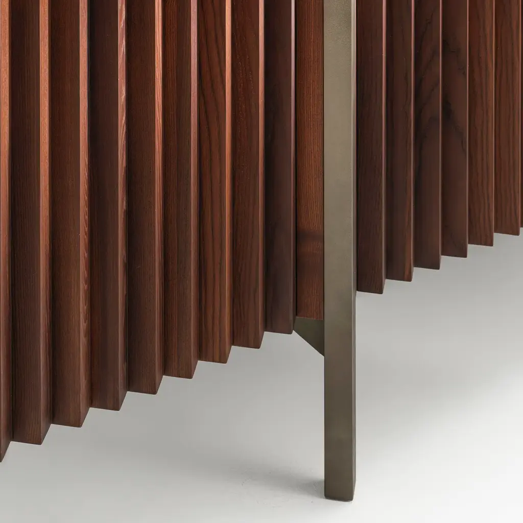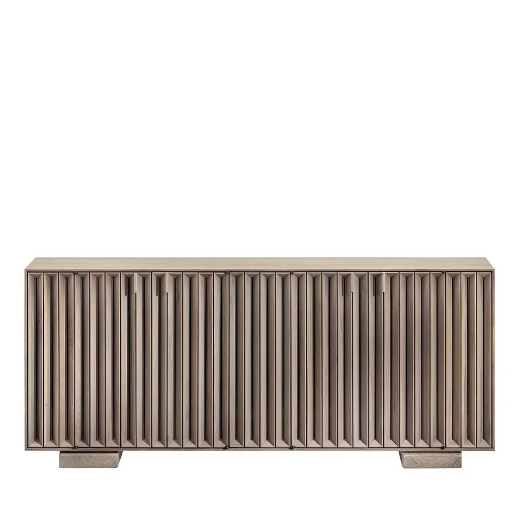 Best arranged in a contemporary-inspired living or dining area, this sideboard features an elegant and minimalist design enhanced with a ribbed texture. Crafted of lacquered MDF, it is enriched with thermo-heated ash wood doors and metal details. Please consult the Concierge for further information on materials and finishes.