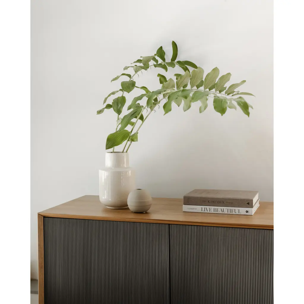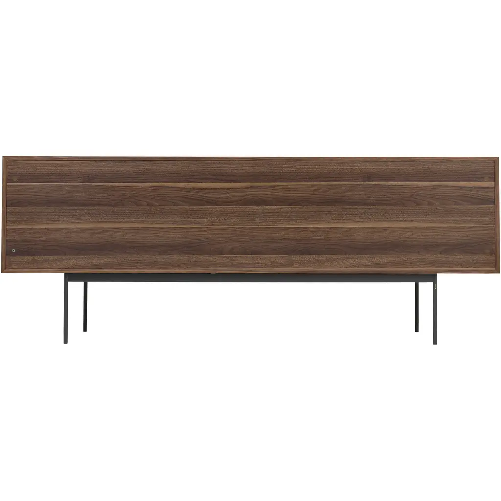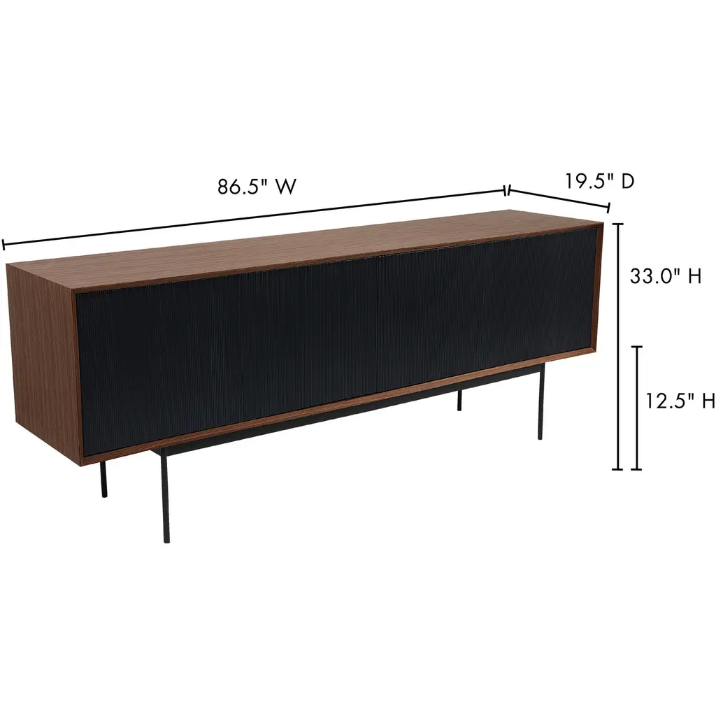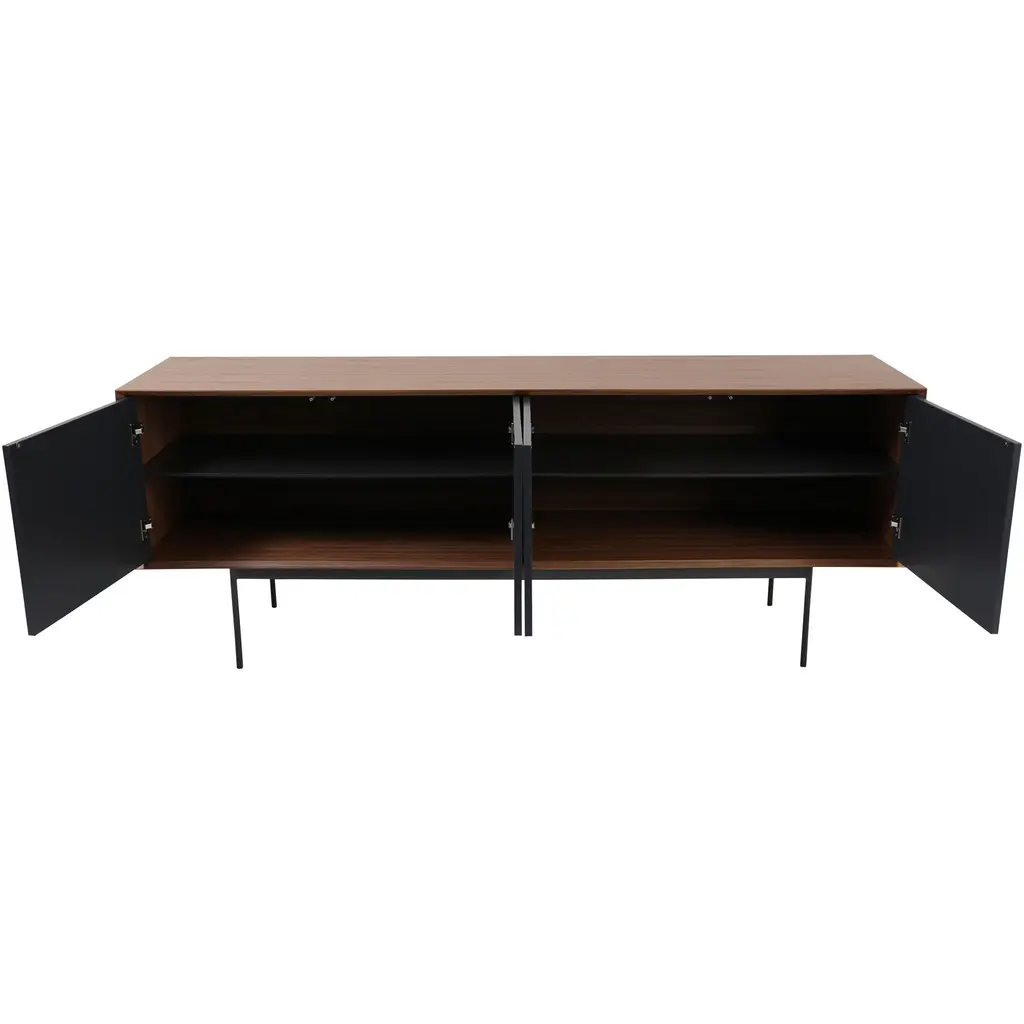 A simple design that packs a punch. Dark stained walnut veneer accompanies black corduroy wood detailing on the Araya Sideboard cupboards. This mid-century modern sideboard's large storage compartment opens to reveal four large shelves, ideal for storing your favorite board games and consoles.