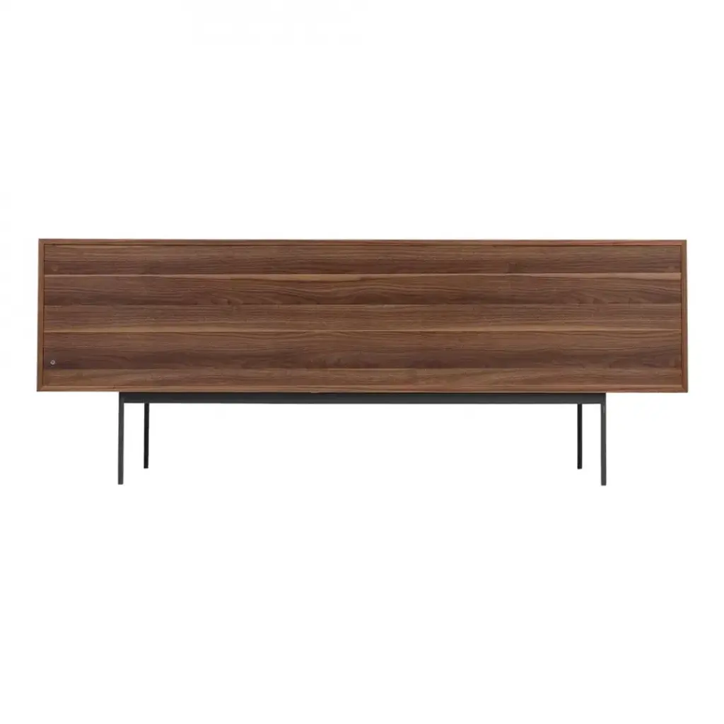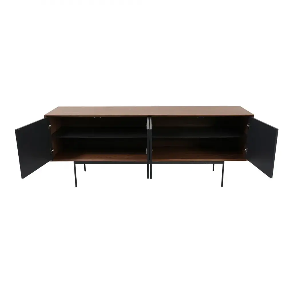 A simple design that packs a punch. Dark stained walnut veneer accompanies black corduroy wood detailing on the Araya Sideboard cupboards. This mid-century modern sideboard's large storage compartment opens to reveal four large shelves, ideal for storing your favorite board games and consoles.