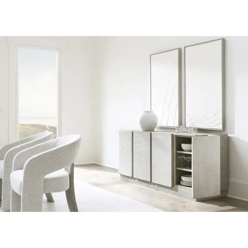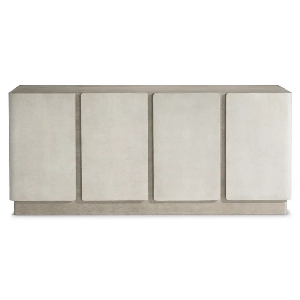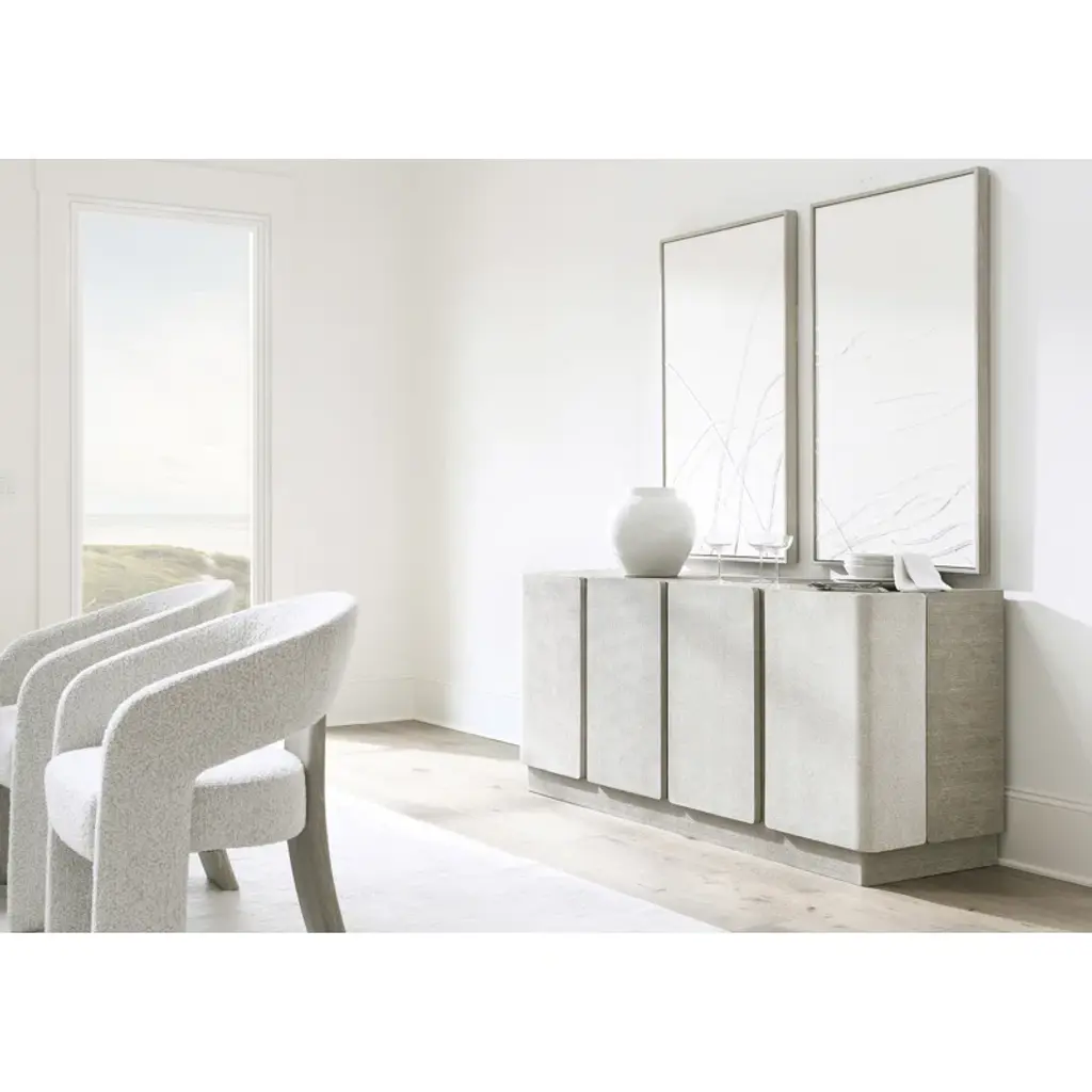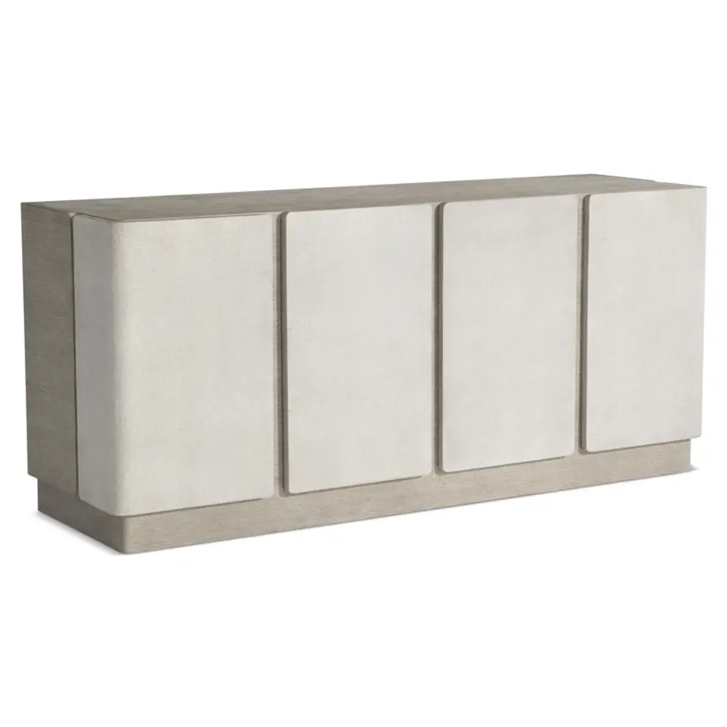 Tactile materials showcase an elemental style on the Arcadia sideboard. Raffia wraps the four door fronts, curving around the sides of the doors on either end. The wire-brushed wood case.