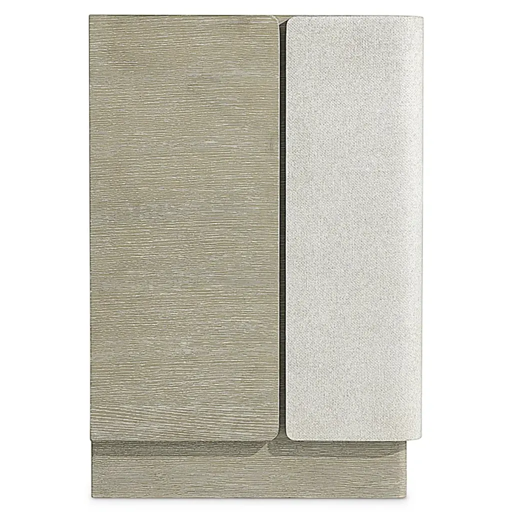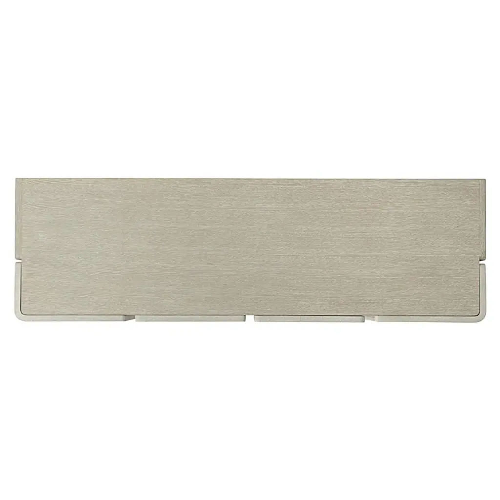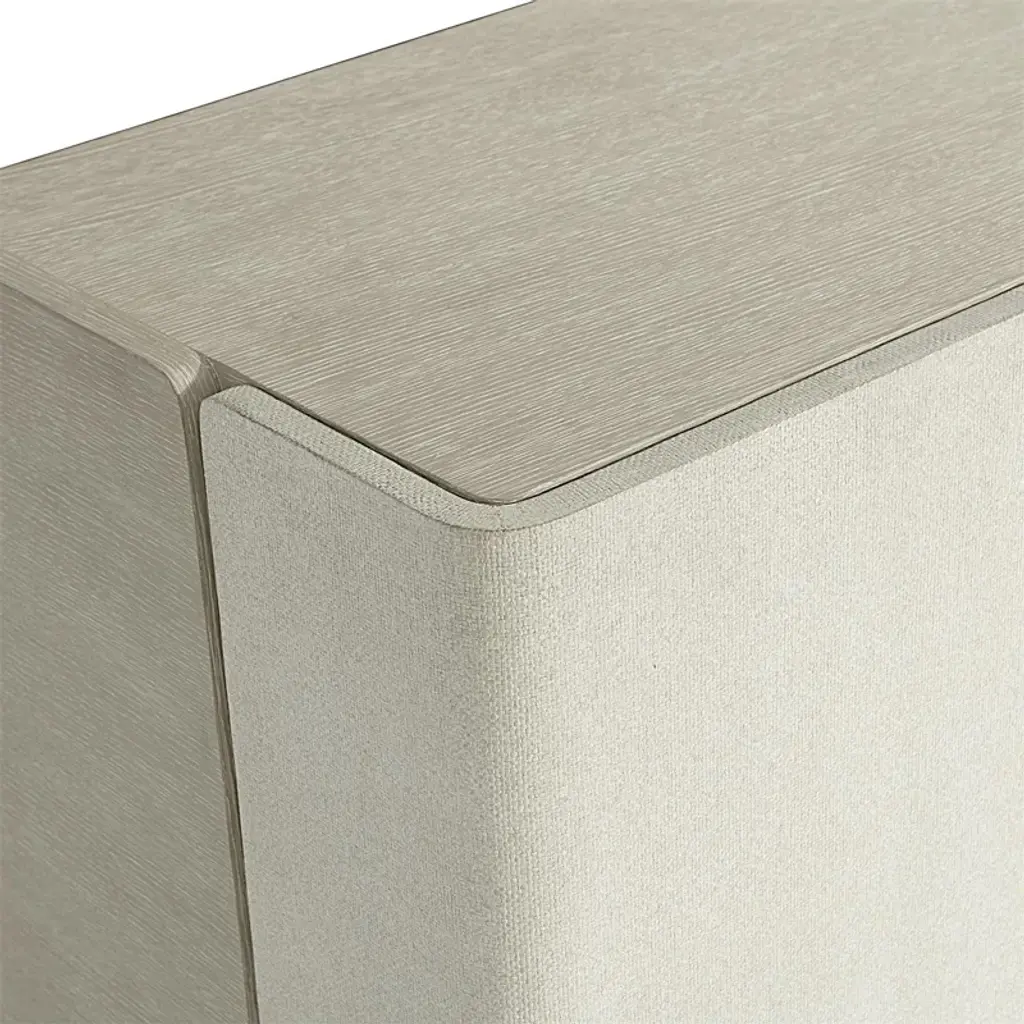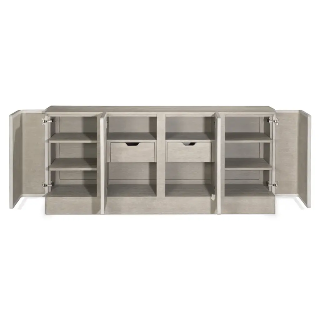 Tactile materials showcase an elemental style on the Arcadia sideboard. Raffia wraps the four door fronts, curving around the sides of the doors on either end. The wire-brushed wood case.