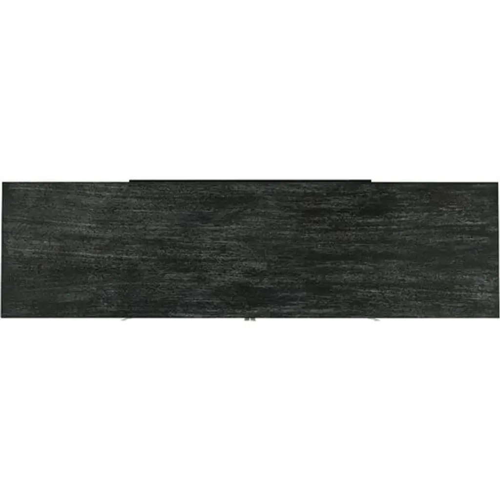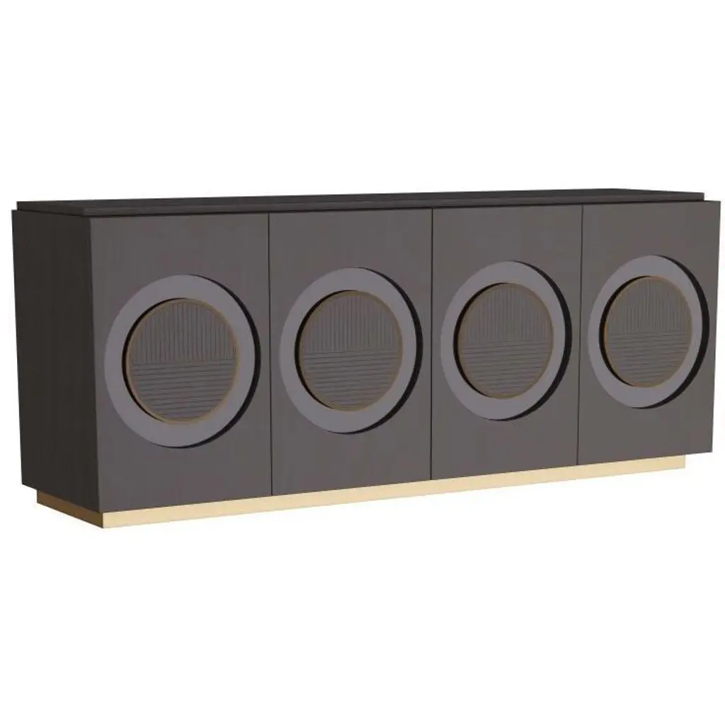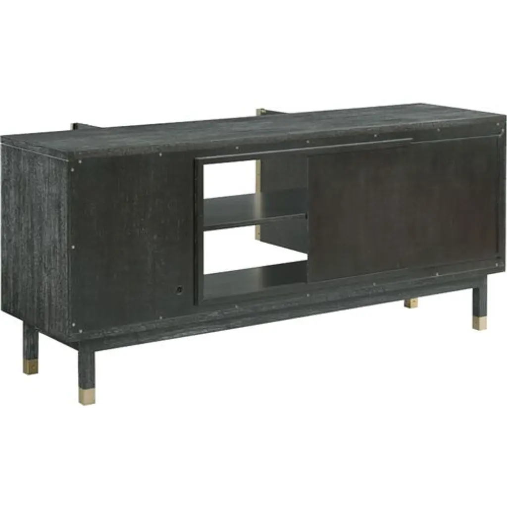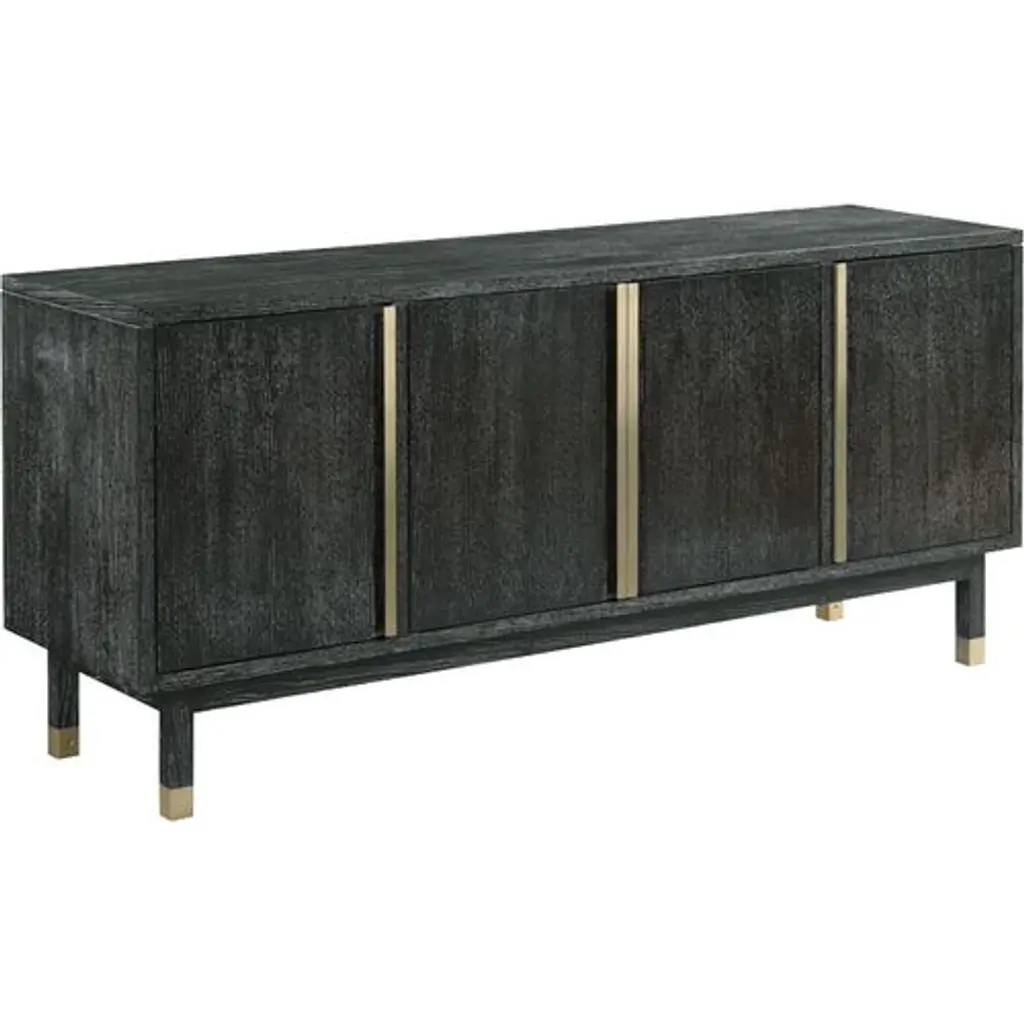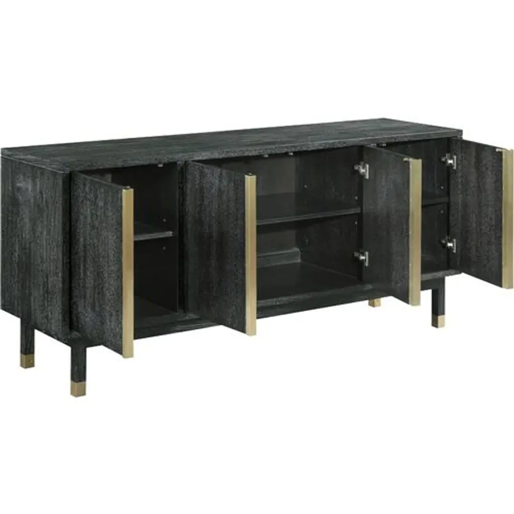 Brass door pulls and leg caps provide a gleaming contrast to the dark finish of this oak cabinet. The four doors open to reveal adjustable shelves, and the back panel slides open for easy access to cords.