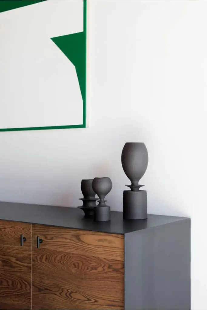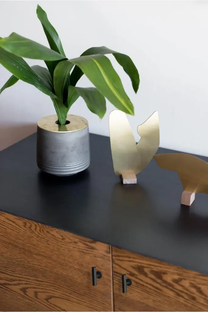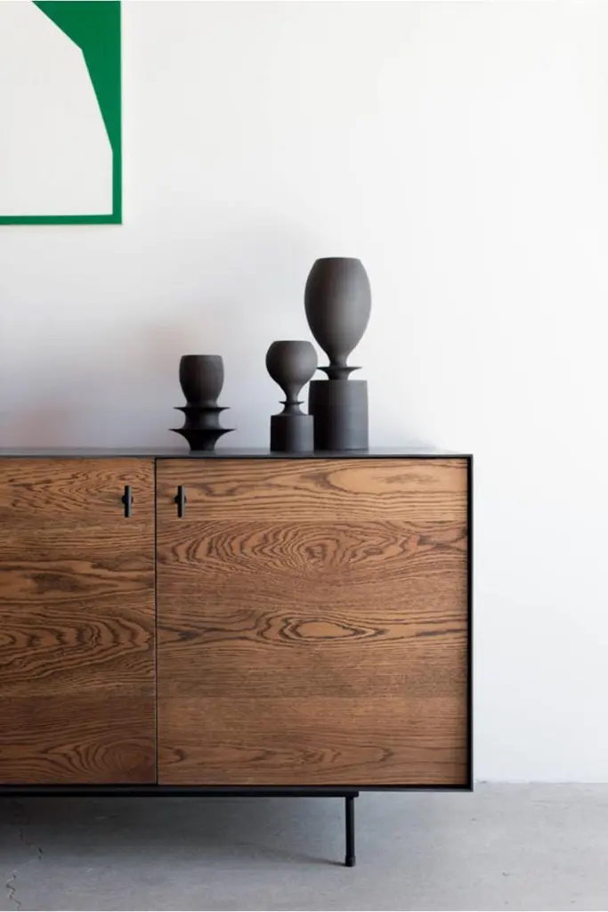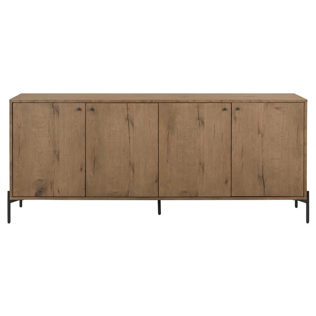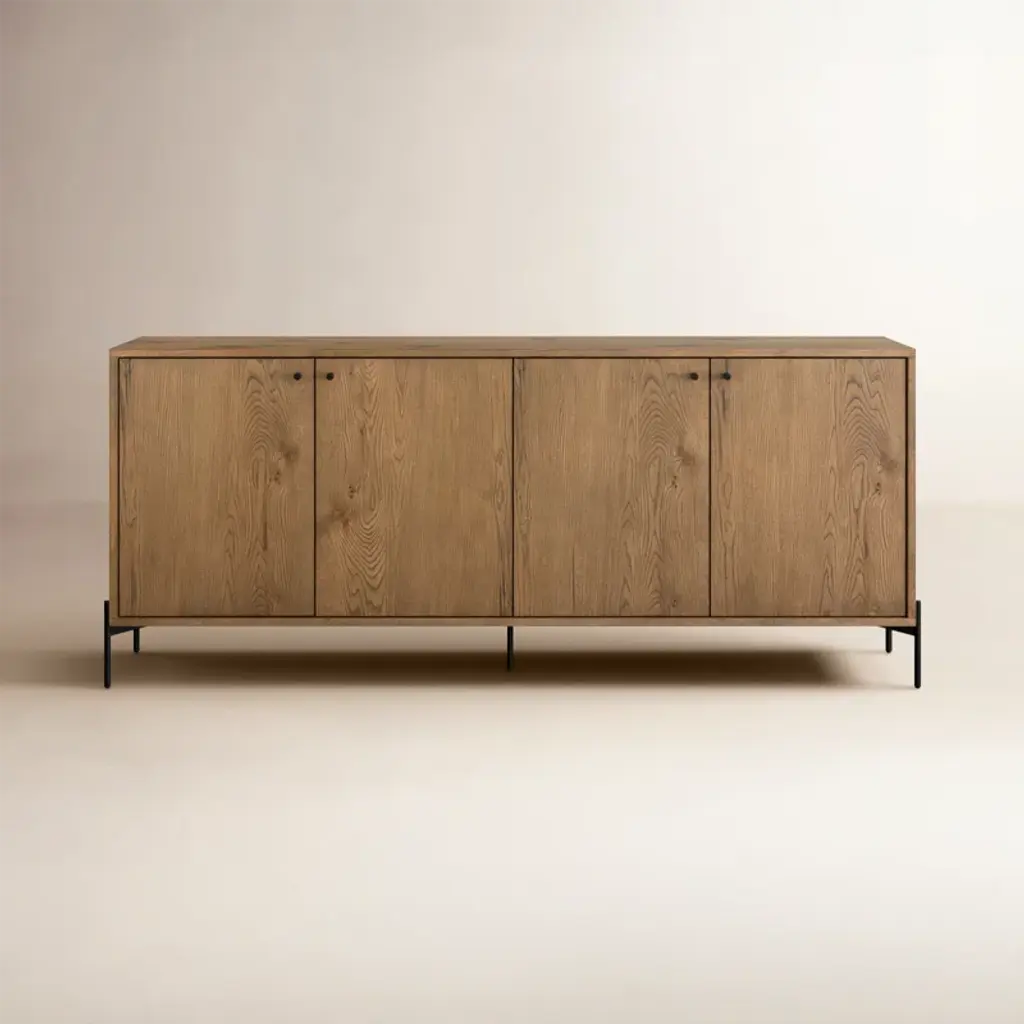 This Credenza is Custom Made in Los Angeles. Industrial steel casing is sheered to size and attached to a substrate. Wood is cut to size and joined to door faces. Four doors with matte black pulls and soft close hinges.OAK + INDUSTRIAL STEEL + BIRCH INTERIOR + BRASSPOLY + HARDWAX OIL FINISHCUSTOMIZE THIS PIECEFor all furniture, protection from heat and moisture is crucial to the longevity of the piece. To help prevent scratches, use adhesive felt pads, coasters, placemats, and avoid sliding objects across the surface of the piece when possible.Lacquer + Paint + Metal Surfaces - Dry dust with a clean microfiber or feather duster. Wipe with a slightly damp microfiber towel and mild cleaner as needed. Wipe dry promptly.We recommend that you clean with ammonia-free Windex or a mild surface cleaner. Please stay away from bleach, alcohol, or petroleum based cleaners. You may use a general purpose wood cleaner.Avoid using furniture polish as over time it can accumulate and leave a residue.Wax + Oil Finish - Dry dust with a clean microfiber or feather duster. Wipe with a slightly damp microfiber towel. Wipe dry immediately. Clean with ammonia-free Windex or a mild surface cleaner. Stay away from bleach, alcohol, or petroleum based cleaners. Our natural wax and oil finishes will dull over time. Wax or teak oil may be reapplied as needed using a soft white cloth. Raw Wood - Dry dust with a clean microfiber or feather duster. Use a damp microfiber towel or soft brush as needed.Do not use any product containing wax or oil to clean.Outdoor Furniture - Outdoor furniture may require frequent oiling. A cover is strongly recommended for all outdoor furniture. Avoid prolonged exposure to moisture and/or direct sunlight.If exposed to rain, allow cushions to air dry completely before putting them back on the frame. Leather Care - Dry dust with a clean microfiber or feather duster. Wipe with a slightly damp microfiber towel. Do not use cleaning products on the leather. The recommended leather conditioner is Skidmore’s Original Leather Cream. Marble + Stone - Dry dust with a clean microfiber or feather duster. Wipe with a slightly damp microfiber towel. Wipe dry immediately. For daily cleaning we recommend using Orange Glo and/or Method Stone Cleaner on the marble. All marble and stone surfaces are protected with a sealer. To maintain the overall appearance and protection of the marble or stone, reseal with Miracle 511 Seal & Enhance. It is important to use coasters and clean up moisture immediately on marble and stone surfaces. Additional information:Dimensions: 90"W + 20"D + 30"H