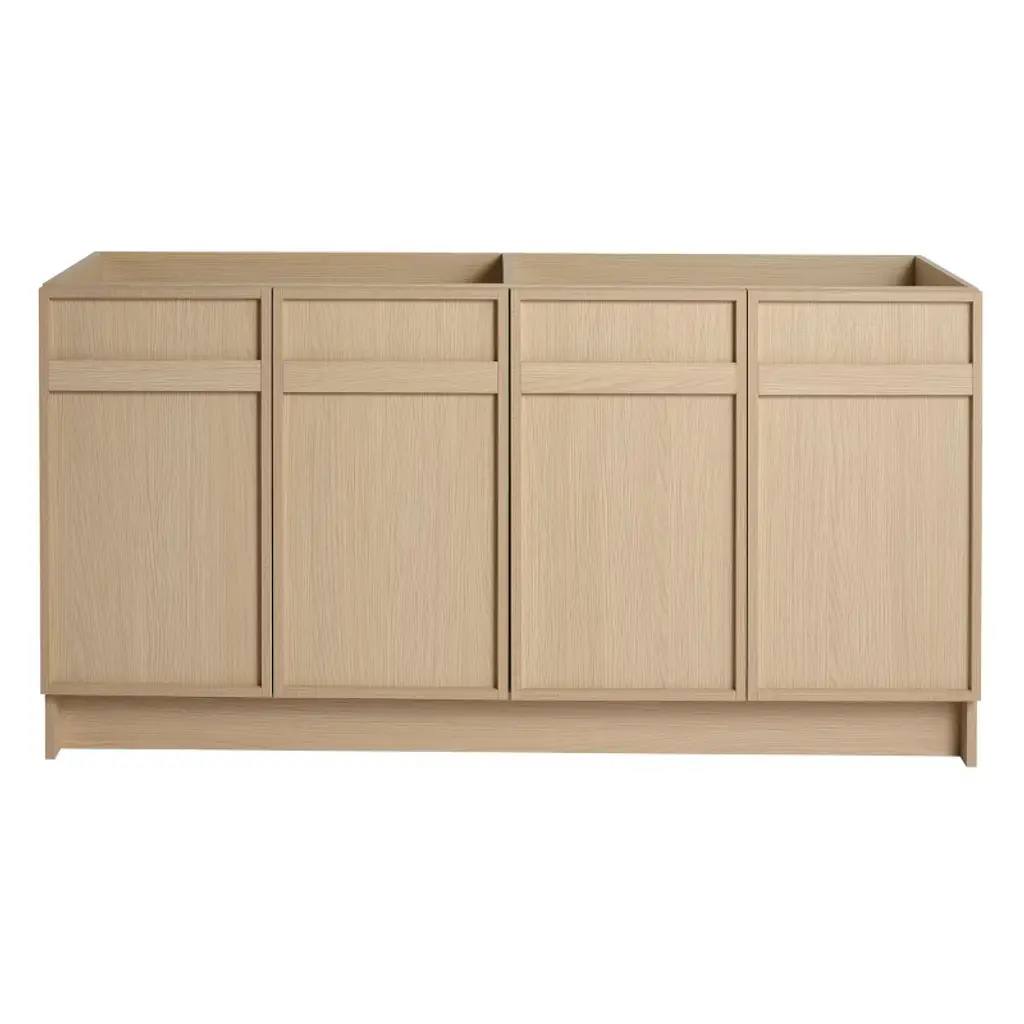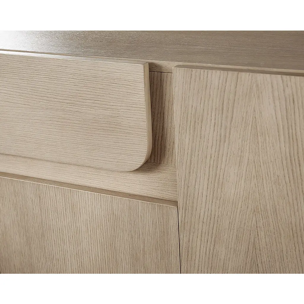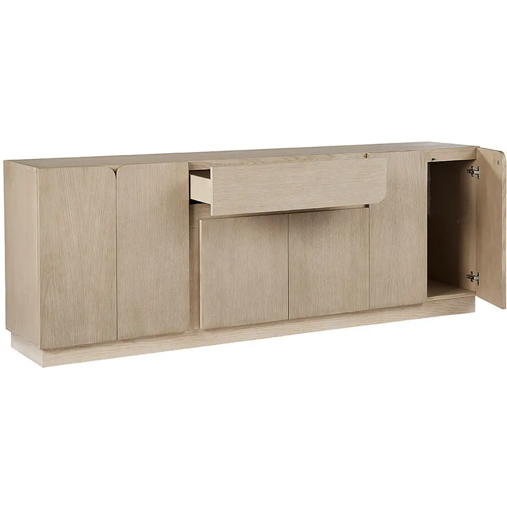 A refreshing take on Scandinavian design, this sideboard is a great addition to any dining or living space. Features a coveted light wash oak wood frame with visible graining and complementing straight and curved edge cabinet fronts. As wood is an organic, porous material, these pieces will contain natural variation of texture and may also exhibit fine indentations and cracks. Wood pieces will also display a disparity of colour and grain, and visible knots and burls that add to the character of each piece.