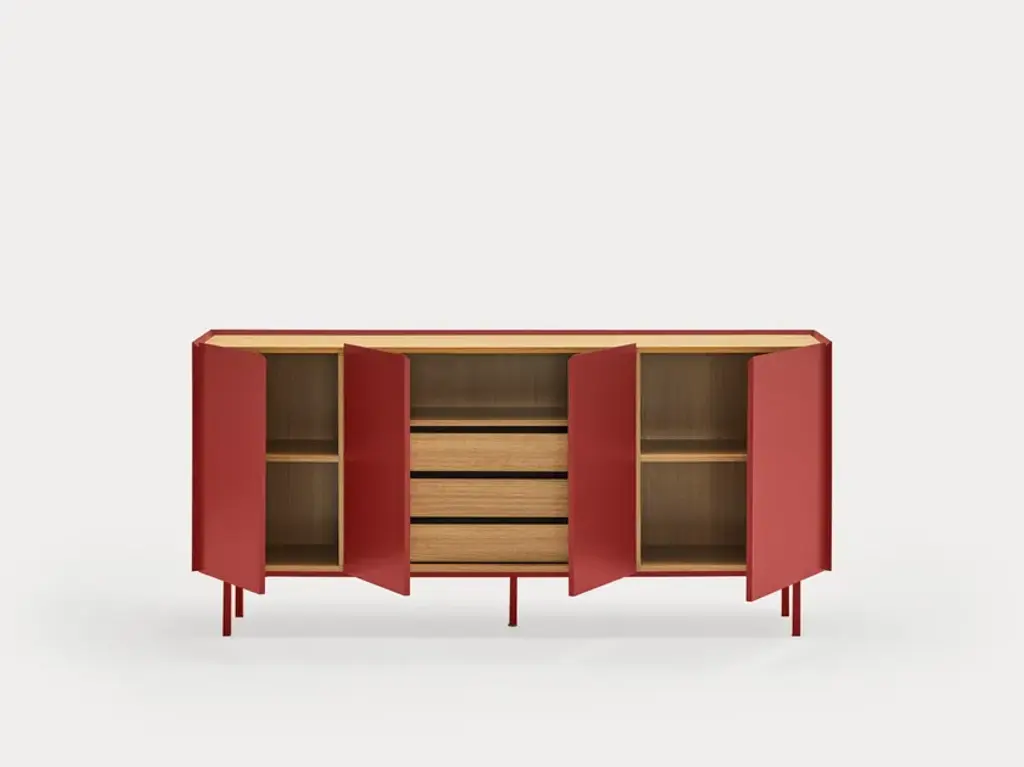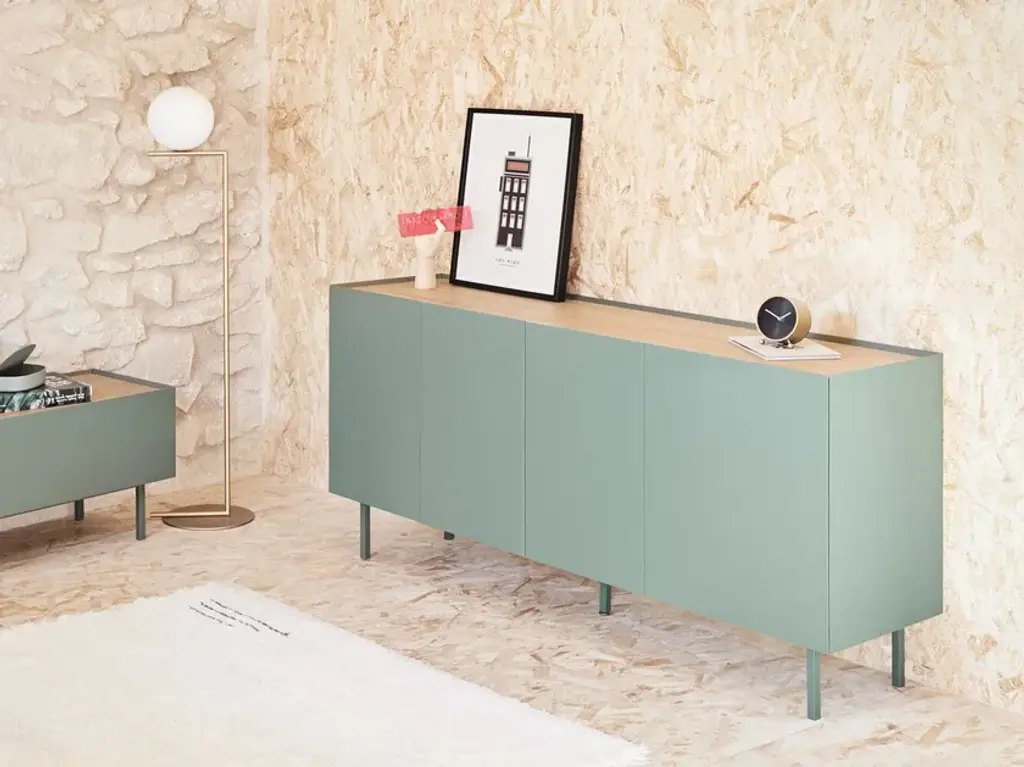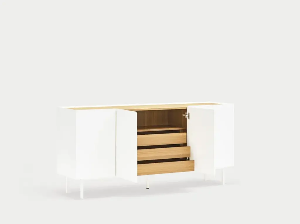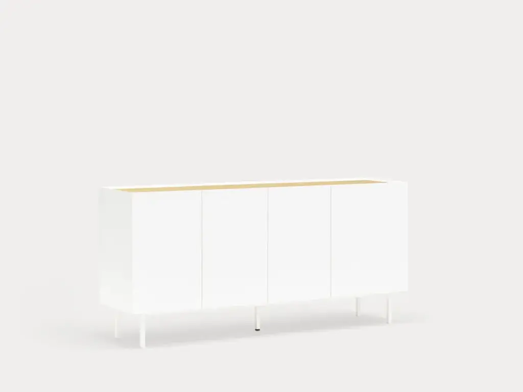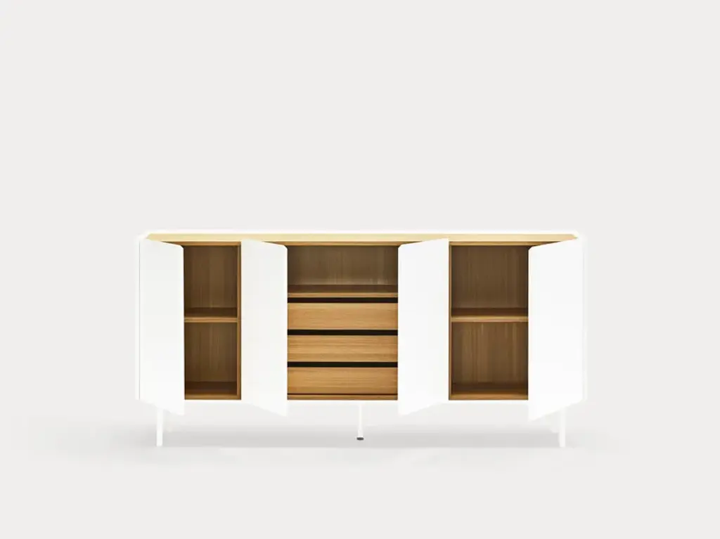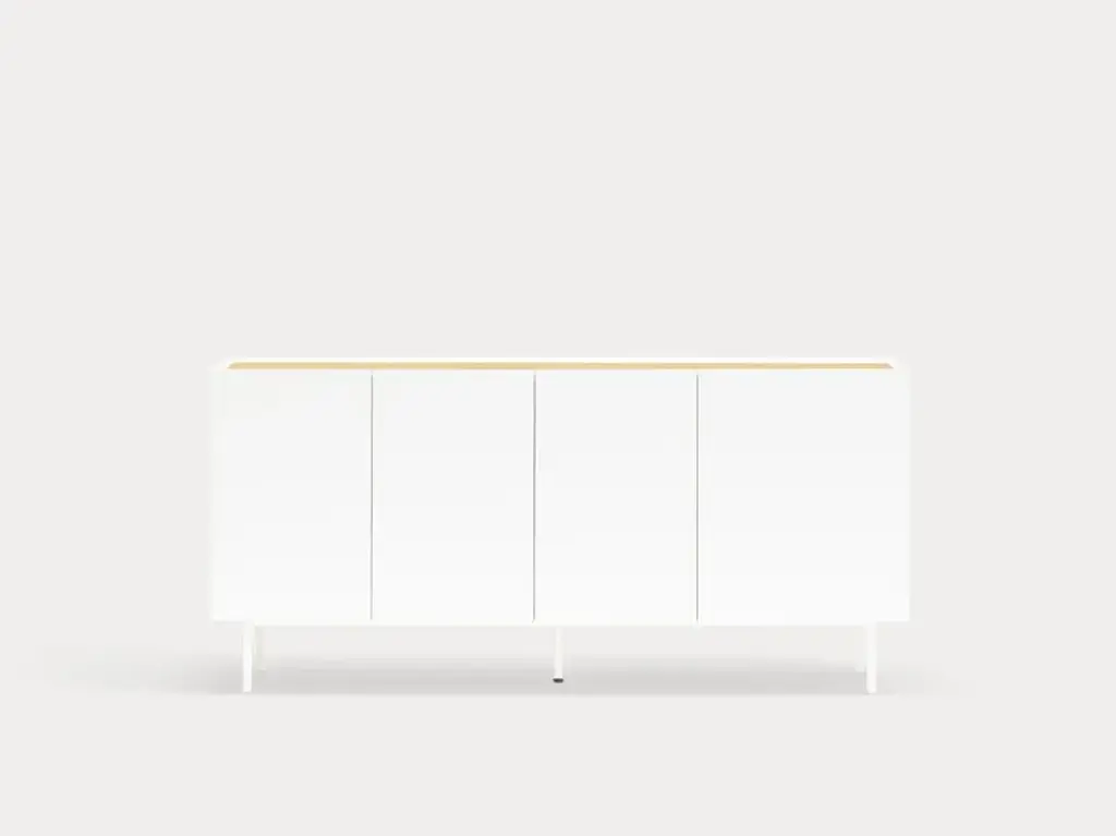 The name of this collection is defined by its great characteristics, making it special by itself. Creating the form Arista as a handle enable to transmit the essence of the collection as a particular element of the furniture.To obtain this integration, a frame was created to surround the upper perimeter of the furniture topped with an oak veneer finishing. The furniture doors meet the top at an angle of 45º which offer a total cohesion between all the furniture parts. Arista cabinet is equipped with a bottle rack in its interior and four shelves at different heights to provide a complete and versatile storage space.All the door of Arista are equipped with soft closing hinges that secure a gentle closing. The top of the furniture is oak veneer while the structure is made of lacquered MDF.The name of this collection is defined by its great characteristics, making it special by itself. Creating the form Arista as a handle enable to transmit the essence of the collection as a particular element of the furniture.