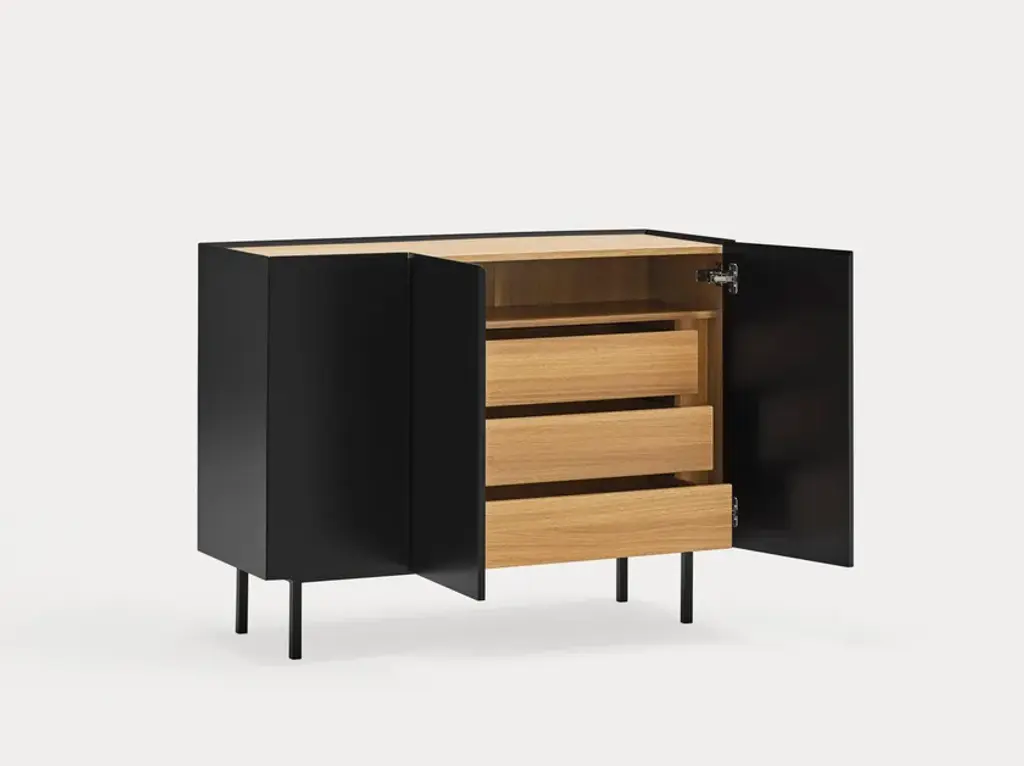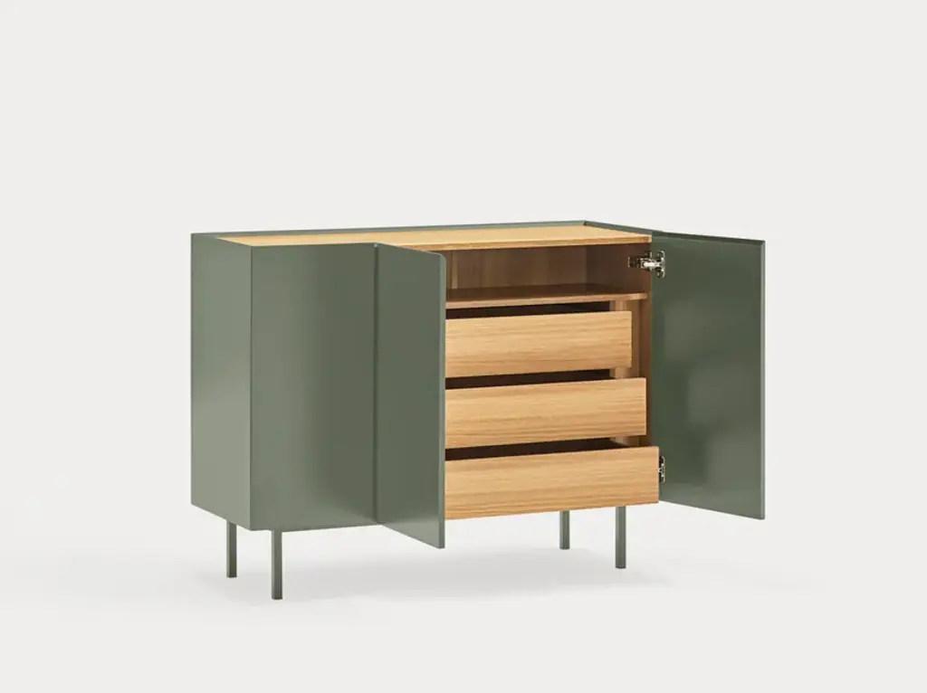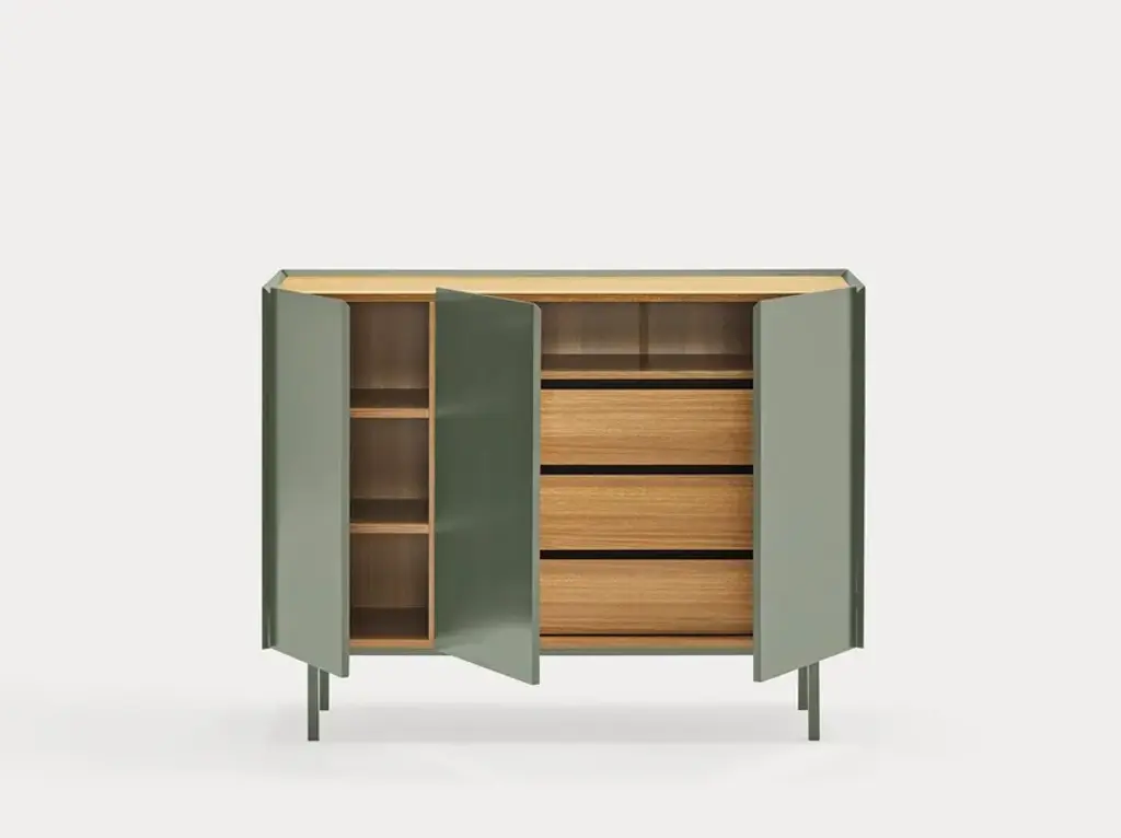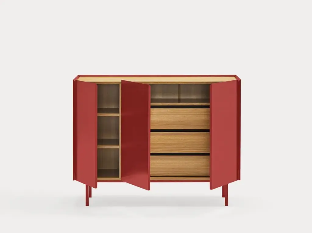 The name of this collection is defined by its great characteristics, making it special by itself. Creating the form Arista as a handle enable to transmit the essence of the collection as a particular element of the furniture.To obtain this integration, a frame was created to surround the upper perimeter of the furniture topped with an oak veneer finishing. The furniture doors meet the top at an angle of 45º which offer a total cohesion between all the furniture parts. Arista cabinet is equipped with a bottle rack in its interior and four shelves at different heights to provide a complete and versatile storage space.All the door of Arista are equipped with soft closing hinges that secure a gentle closing. The top of the furniture is oak veneer while the structure is made of lacquered MDF.The name of this collection is defined by its great characteristics, making it special by itself. Creating the form Arista as a handle enable to transmit the essence of the collection as a particular element of the furniture.
