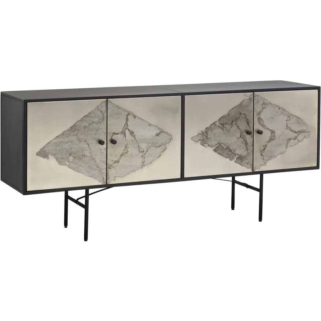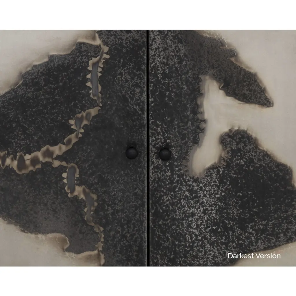 Make a bold statement with this unique sideboard. Cabinets feature a one-of-a-kind patina finish, boldly contrasted with a black iron frame. Made in India. With refined craftsmanship, this design was brought to life by skilled local artisans. By nature, these materials develop unique imperfections such as markings and colour variations for a truly one-of-a-kind piece. Pictures shown reflect the lightest and darkest variations of our Arlington patina finish. Actual product may range between these finishes.