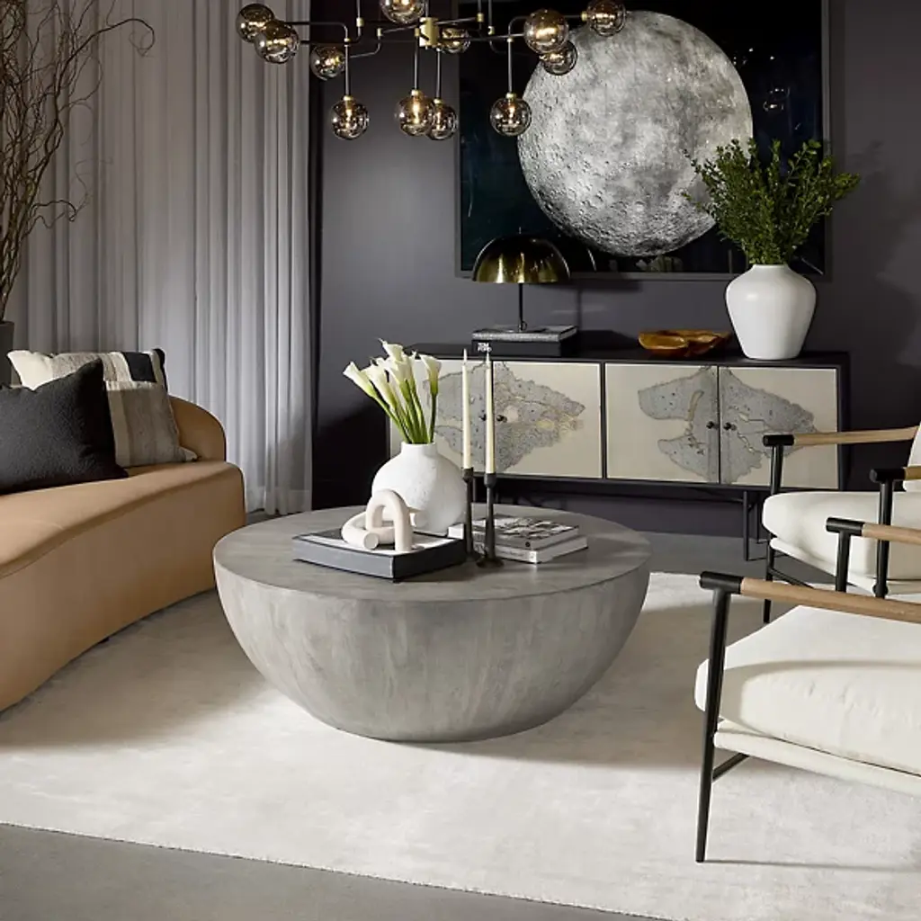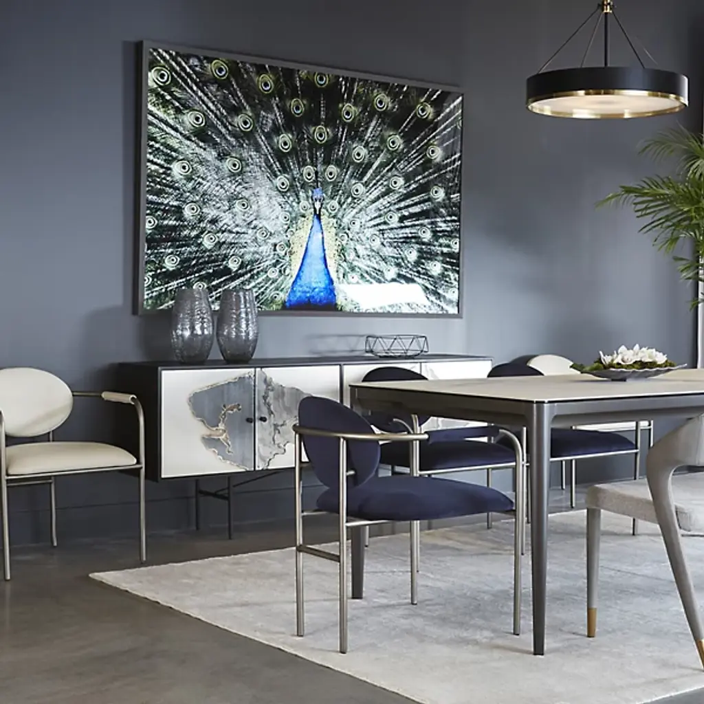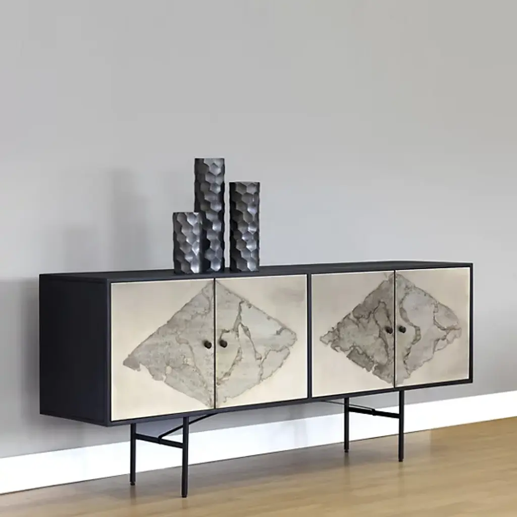 The Arlington Sideboard from Sunpan extends patina-treated cabinet doors across a horizontal format, creating a landscape of abstract patterns that shift from section to section. Each door reveals different stages of chemical weathering, resulting in formations that suggest natural erosion and mineral deposits. The iron framework elevates the cabinet while providing structural definition around the organic door treatments. Indian craftsmanship applies traditional patina methods that produce unrepeatable surface characteristics. Multiple storage compartments hide behind the artistic door treatments.