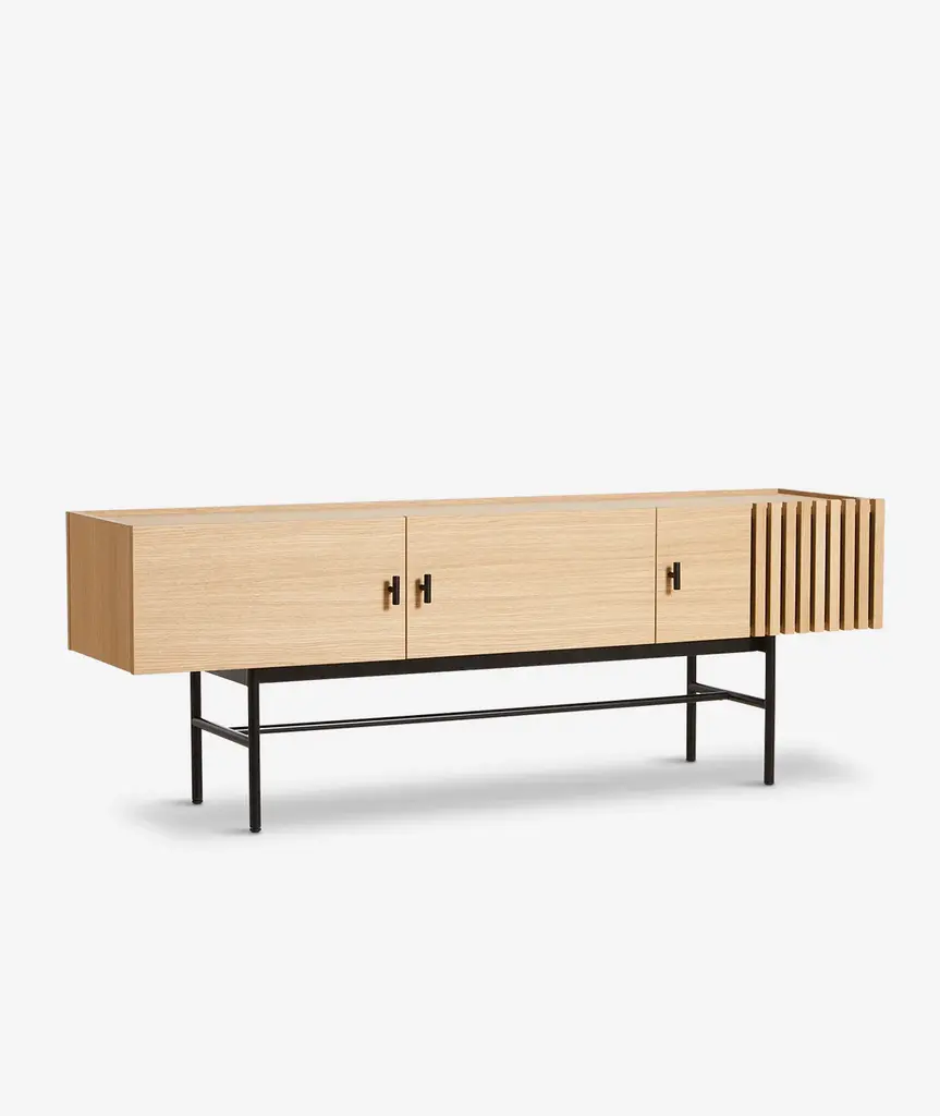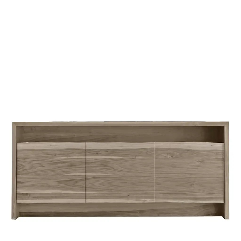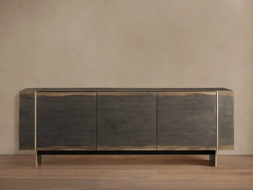 The elegant sideboard features a structure in woode essence, honey-walnut colour. The top is made from matching wood veneer, while the interior boasts a tempered bronze glass shelf. The internal drawer is finished in the same veneer, with a soft-close "Bluemotion" mechanism and buurnished steel hinges. The brass-colored lacquered handle adds a refined touch. A perfect blend of functionality and luxurious design for any modern space.