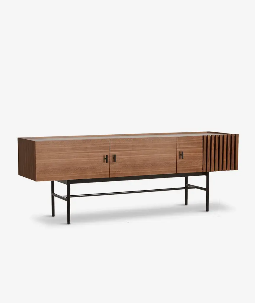 The Array series is inspired by the wooden slate cladding found in modern architecture. With its geometric shape and horizontal slats, it creates a strong visual effect from catching both light and shadow in the depth of the slats. The sleek legs lift the sideboards from the ground creating an elegant contrast between the solid wooden cabinet on top and the thin metal construction underneath. Soft closing doors make the cabinet both functional and delicate.
