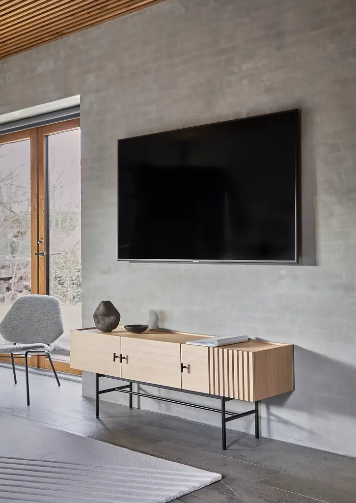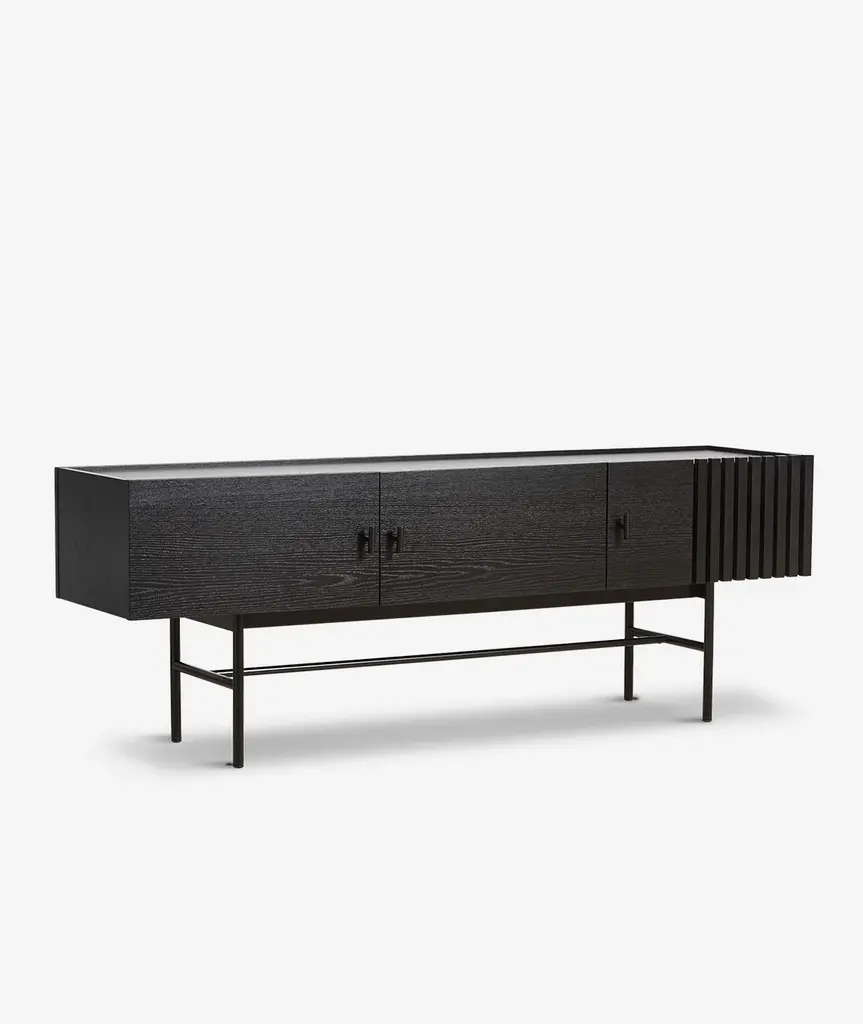 The Array series is inspired by the wooden slate cladding found in modern architecture. With its geometric shape and horizontal slats, it creates a strong visual effect from catching both light and shadow in the depth of the slats. The sleek legs lift the sideboards from the ground creating an elegant contrast between the solid wooden cabinet on top and the thin metal construction underneath. Soft closing doors make the cabinet both functional and delicate.
