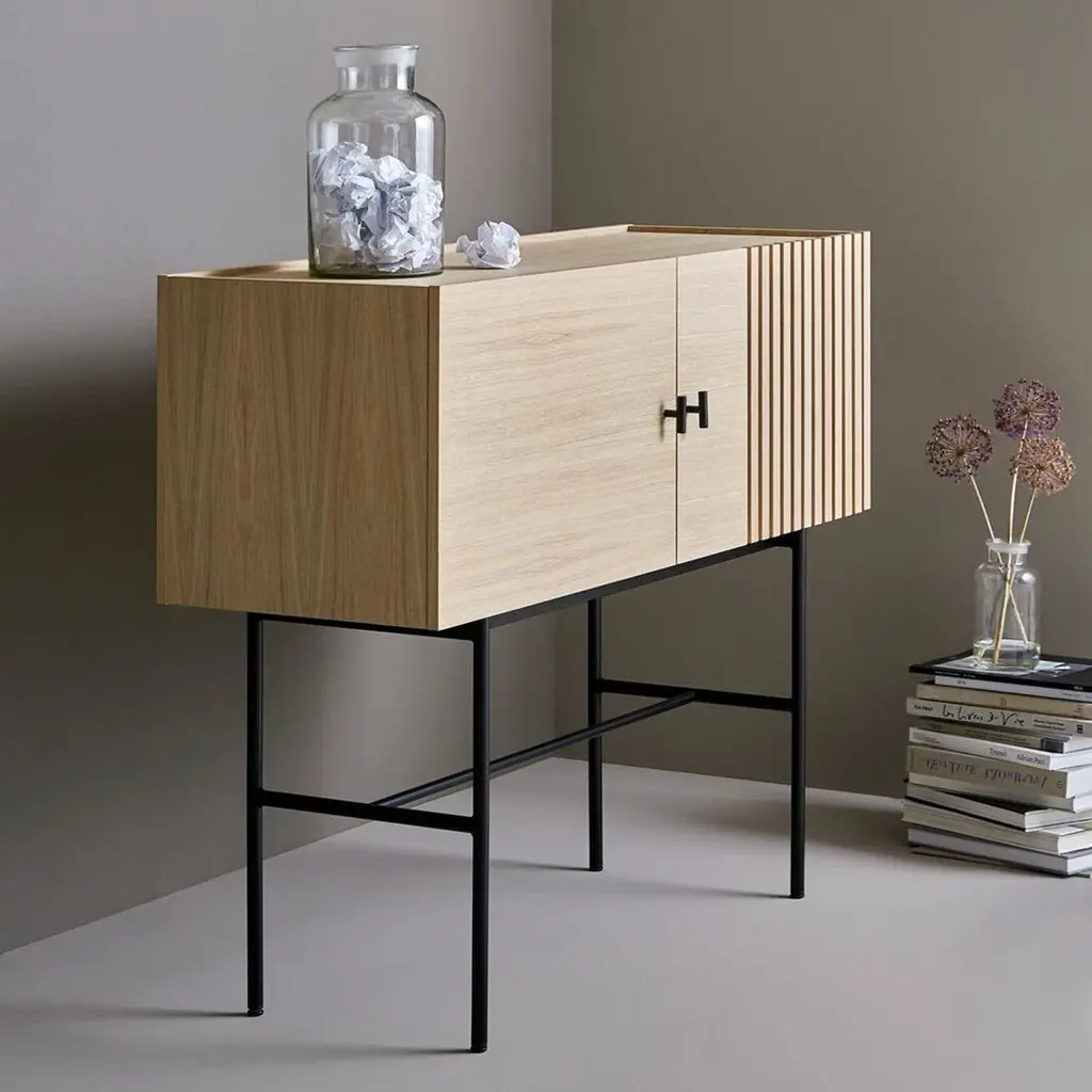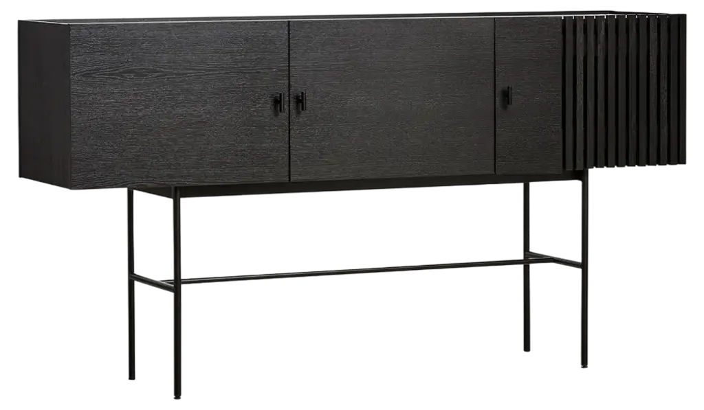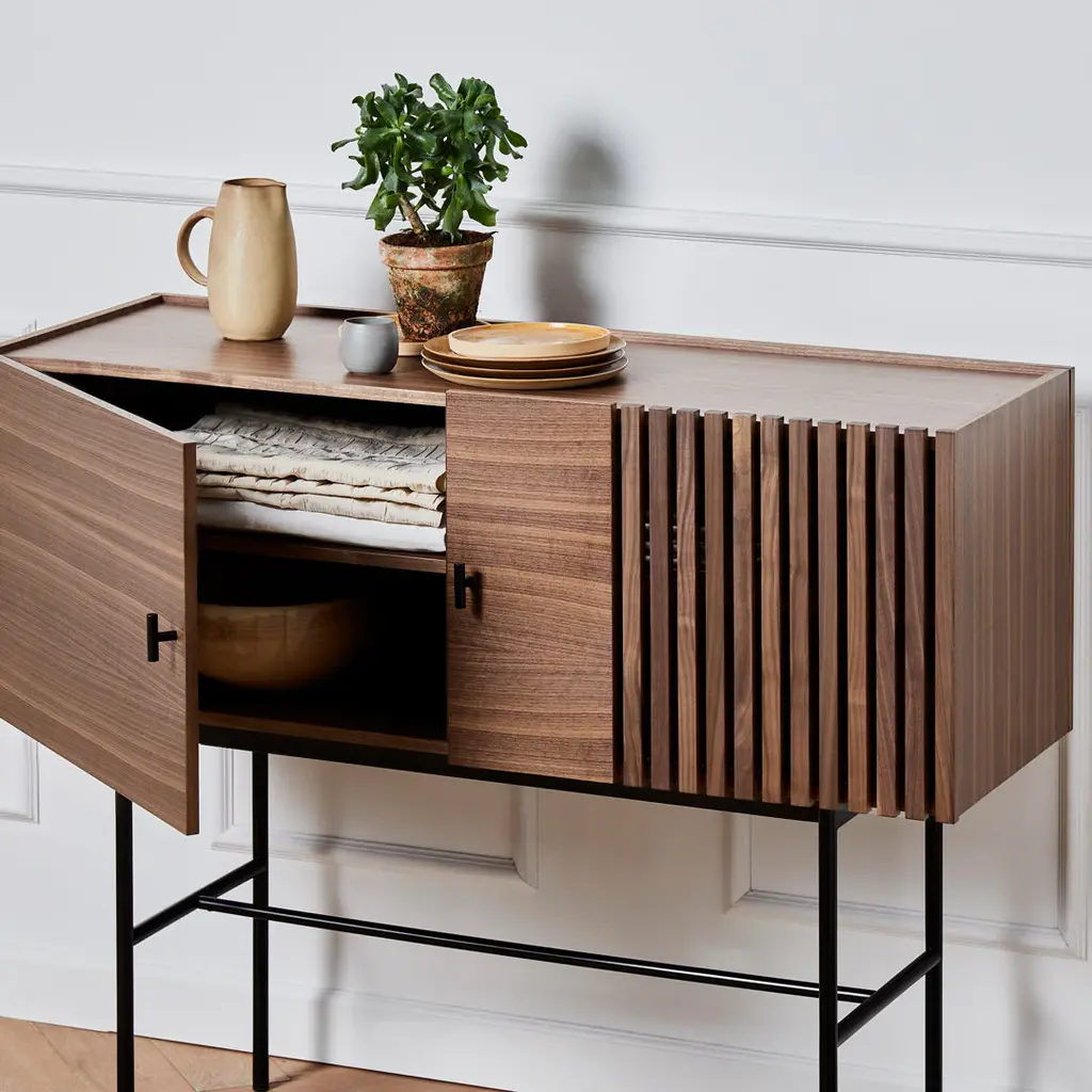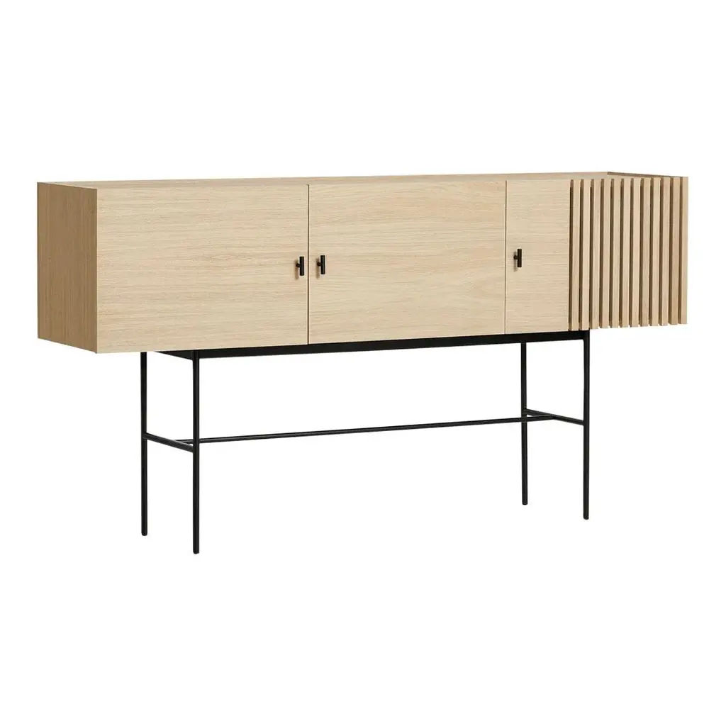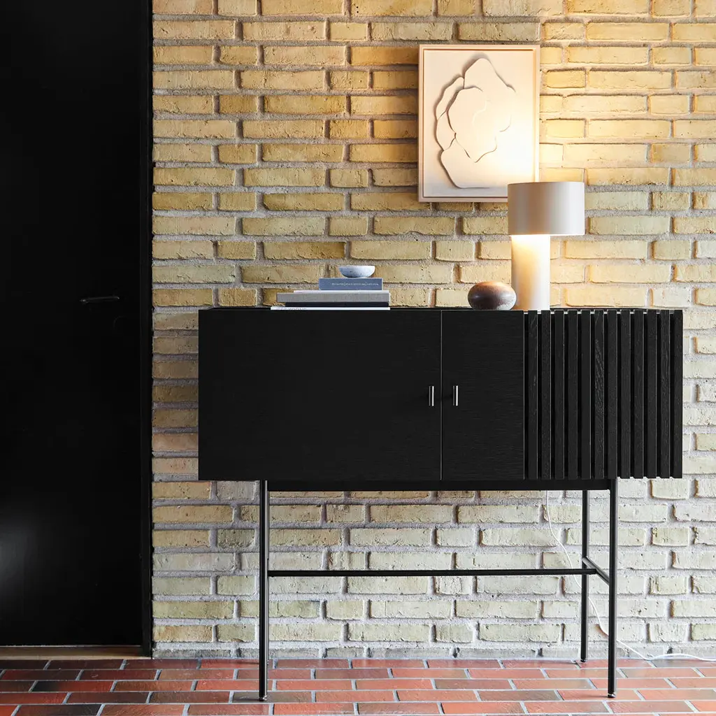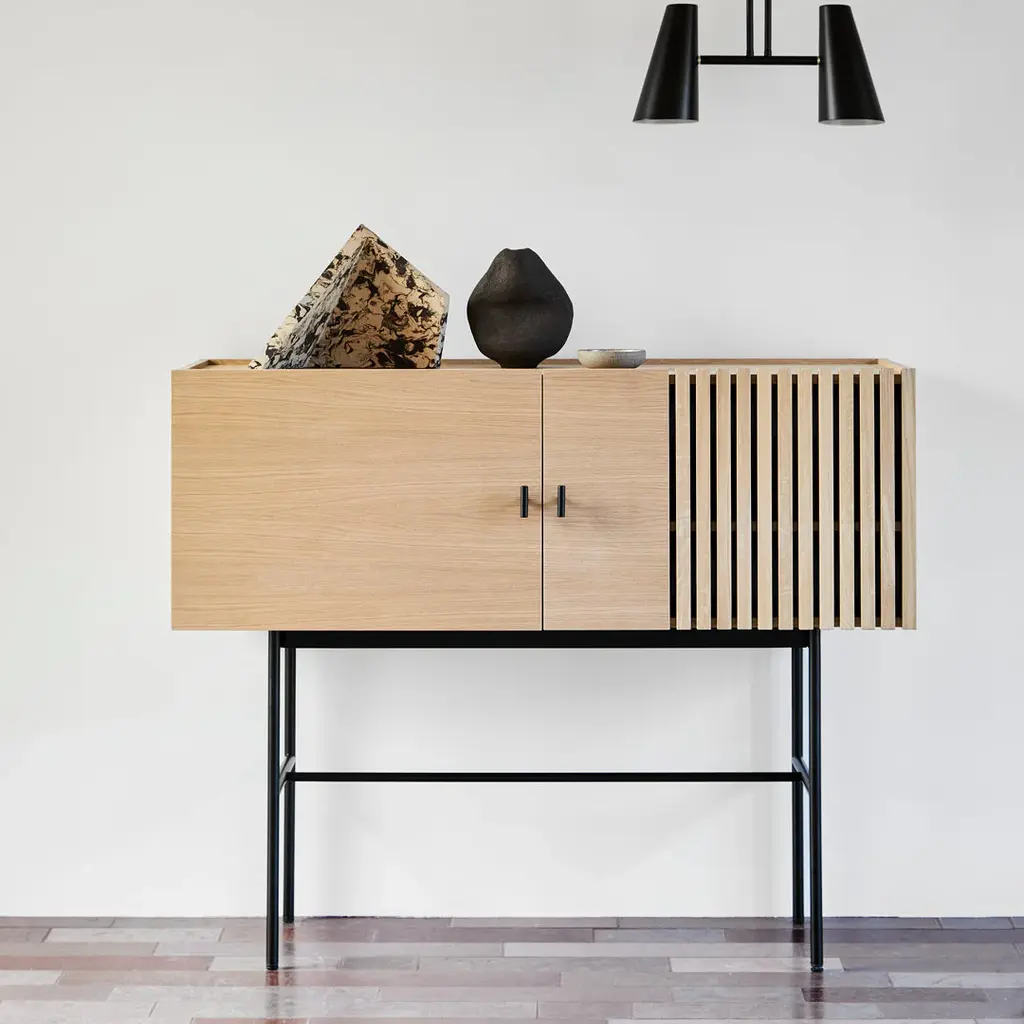 The series of sideboards is inspired by the wooden slate cladding found in modern architecture. With its geometric shape and horizontal slates, Array creates a strong visual effect from catching both light and shadow in the depth of the slates. The illusion of transparency is intended to create a feeling of growing curiosity as you get a glimpse of what is hidden behind the closed doors. The sleek legs lift the sideboards from the ground creating an elegant contrast between the solid wooden cabinet on top and the thin metal construction underneath.