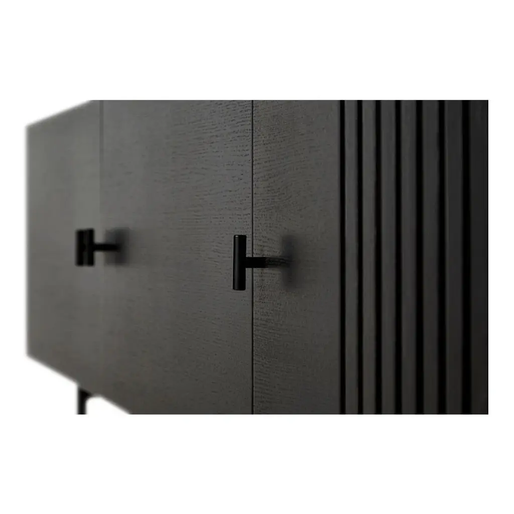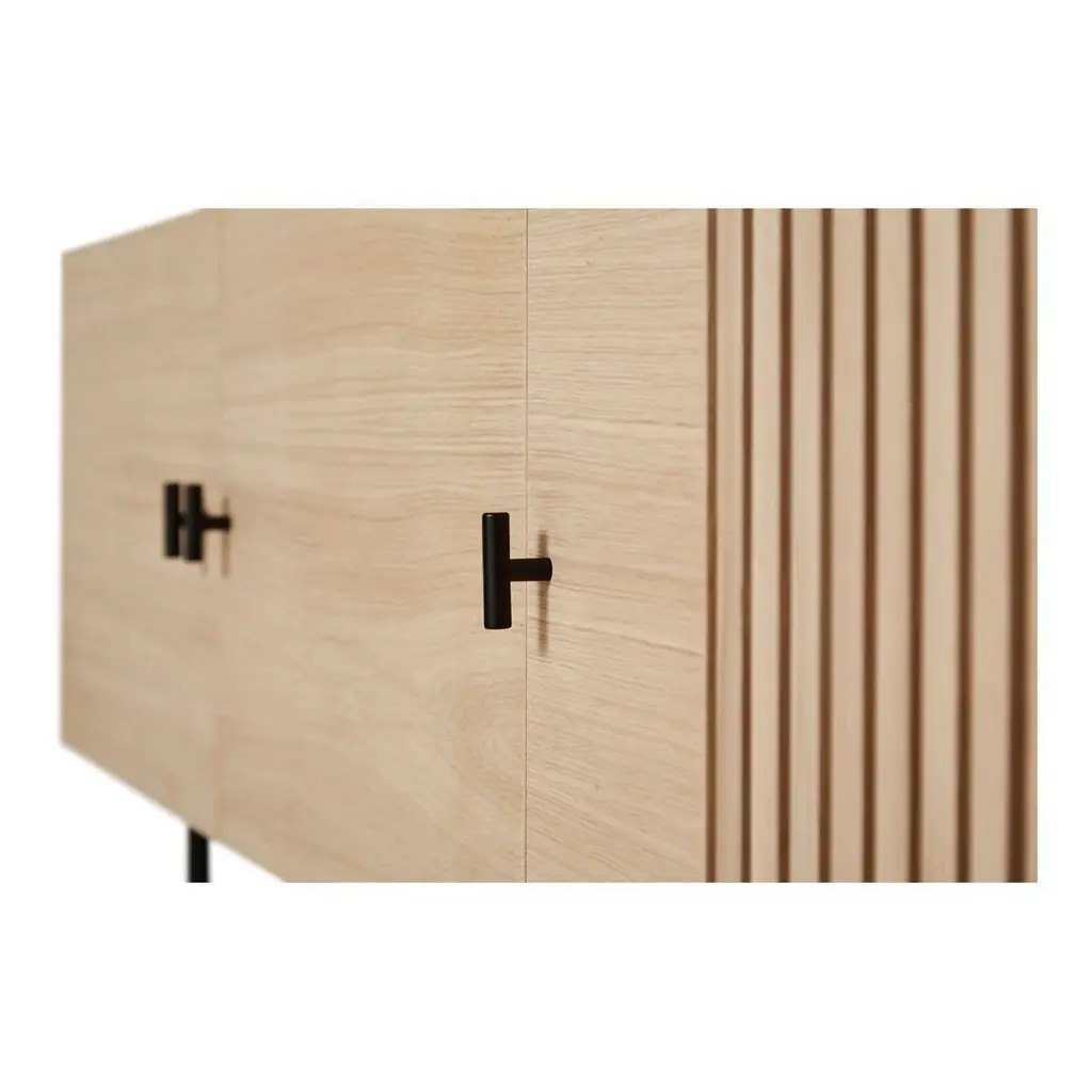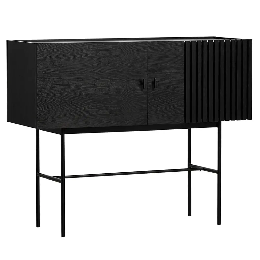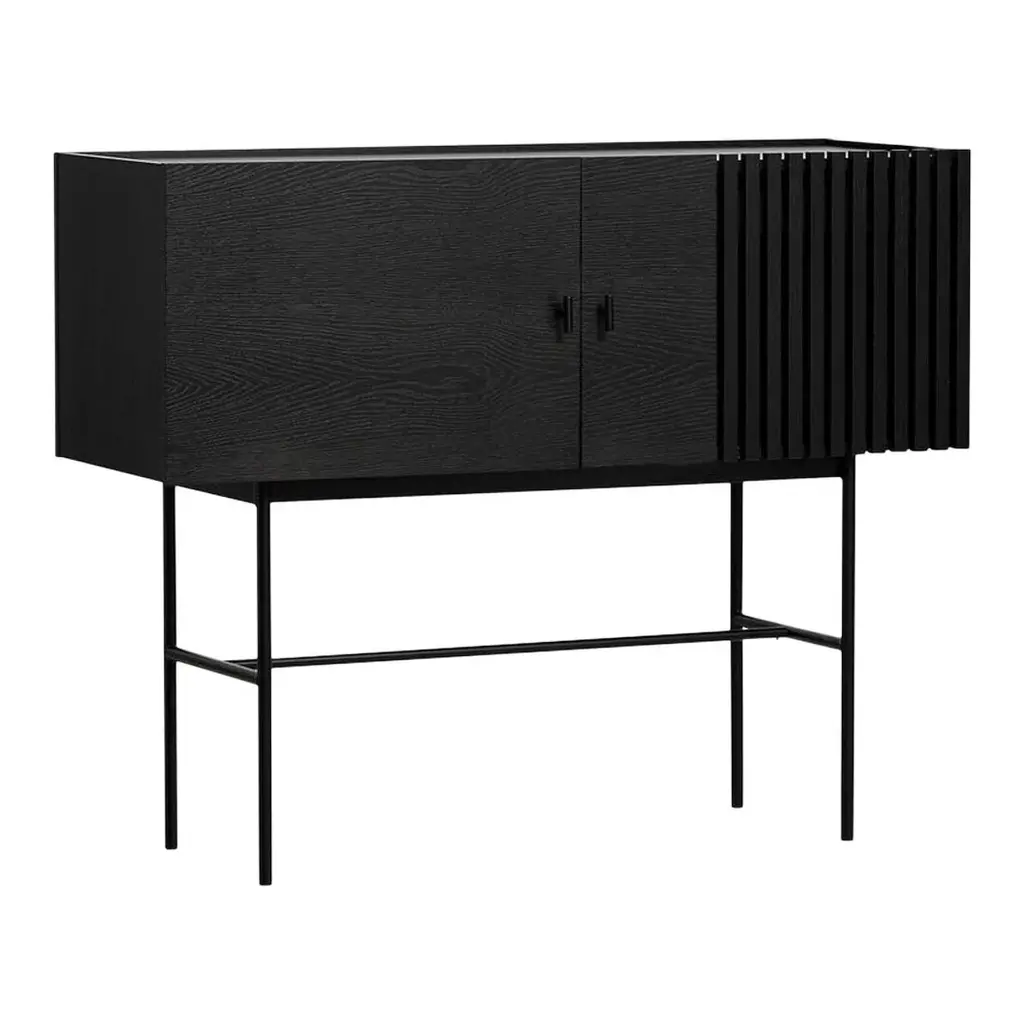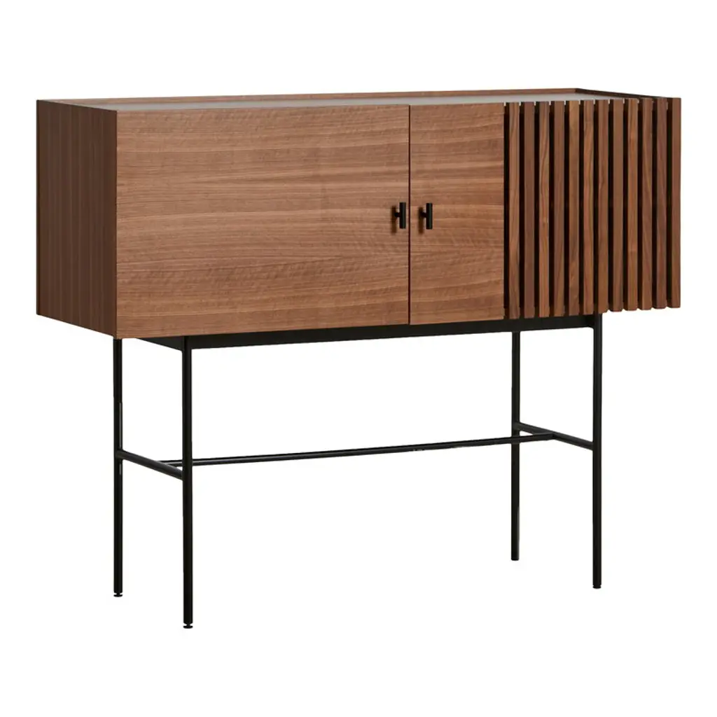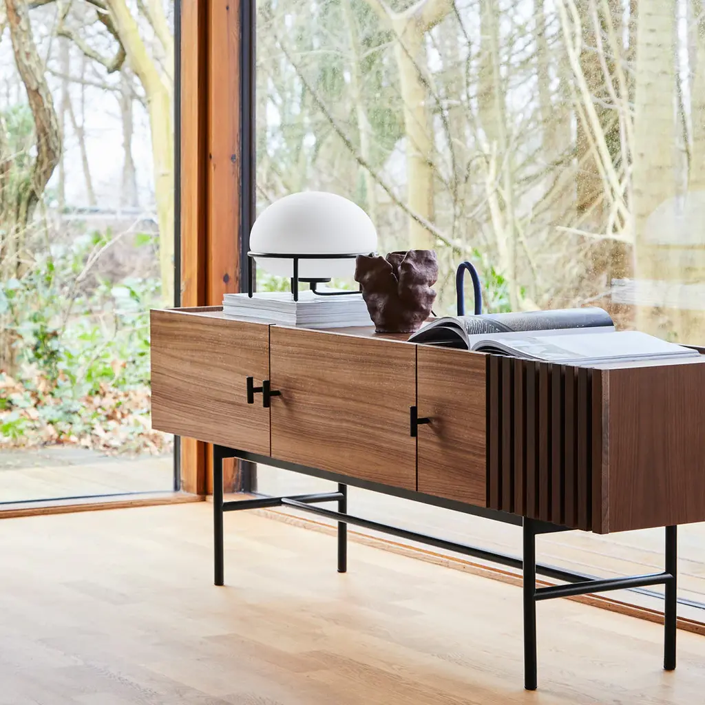 The series of sideboards is inspired by the wooden slate cladding found in modern architecture. With its geometric shape and horizontal slates, Array creates a strong visual effect from catching both light and shadow in the depth of the slates. The illusion of transparency is intended to create a feeling of growing curiosity as you get a glimpse of what is hidden behind the closed doors. The sleek legs lift the sideboards from the ground creating an elegant contrast between the solid wooden cabinet on top and the thin metal construction underneath.