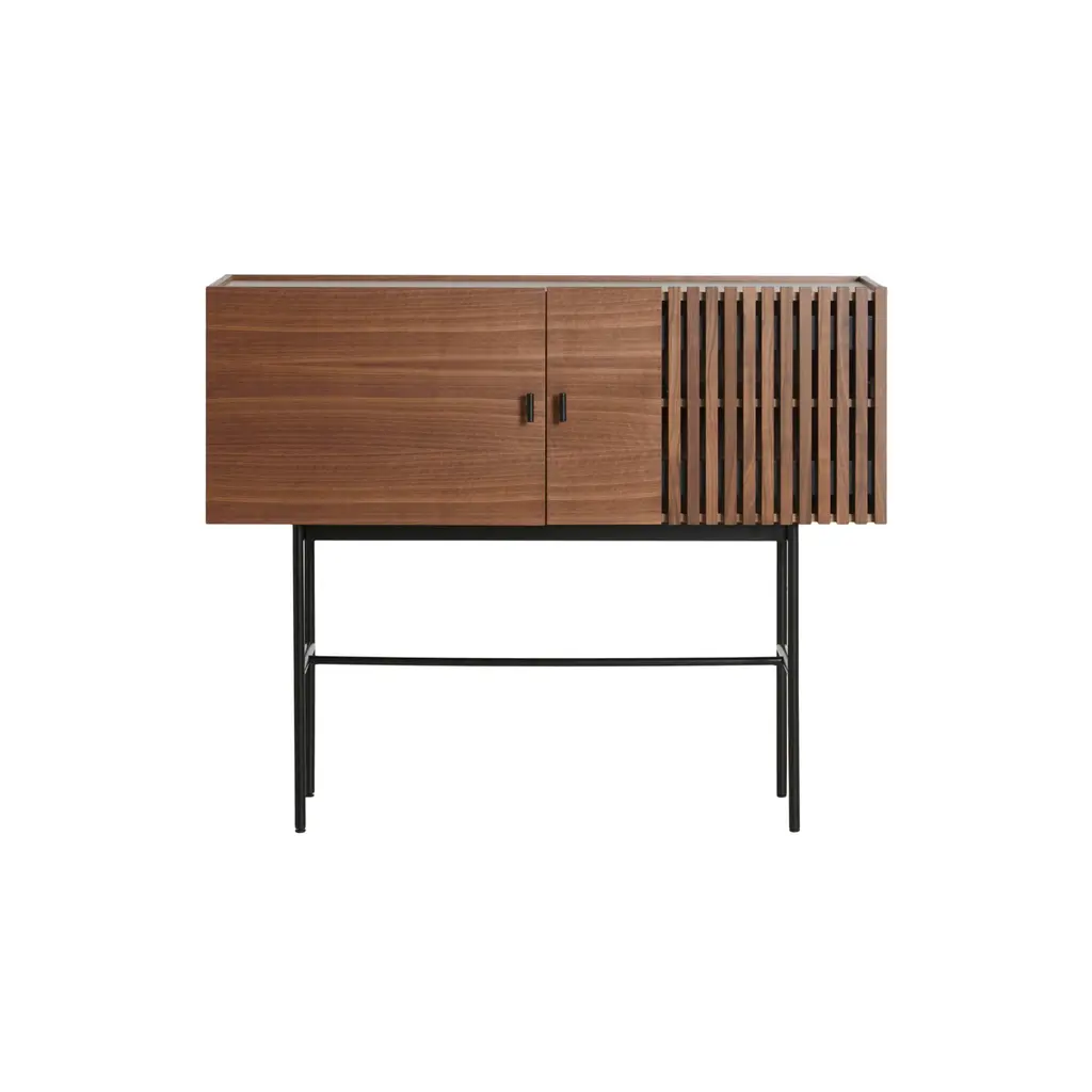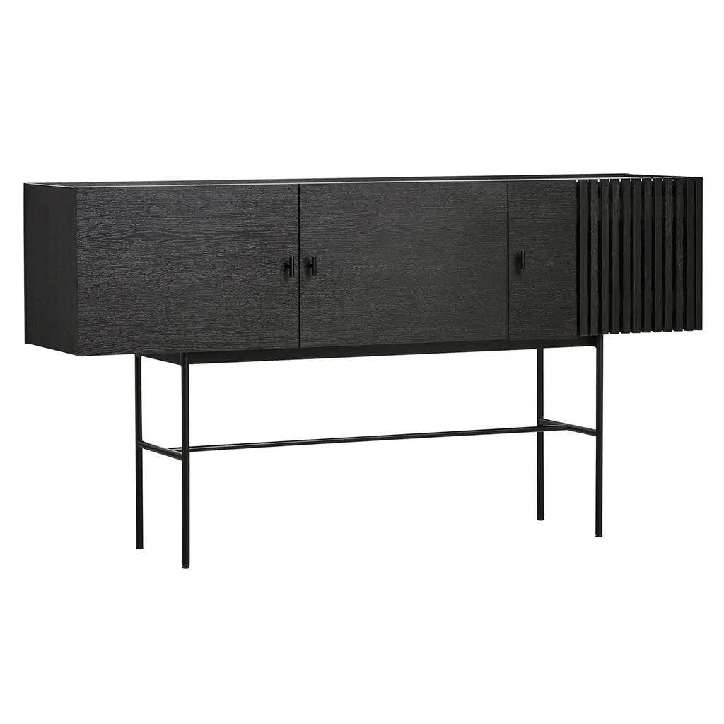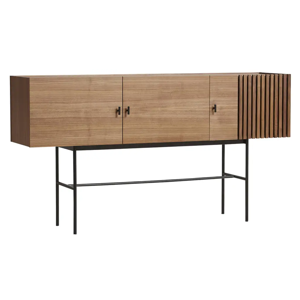 With its asymmetrical front slats, Array seems to tease out a clue about what lays behind its doors. The sideboard from Danish design studio Says Who takes a cue from building cladding for the effect, breaking up the storage piece’s elegant horizontal expanse. And the delicately scaled ironwork base provides both a textural contrast to the wood cabinet and a sense of weightlessness.