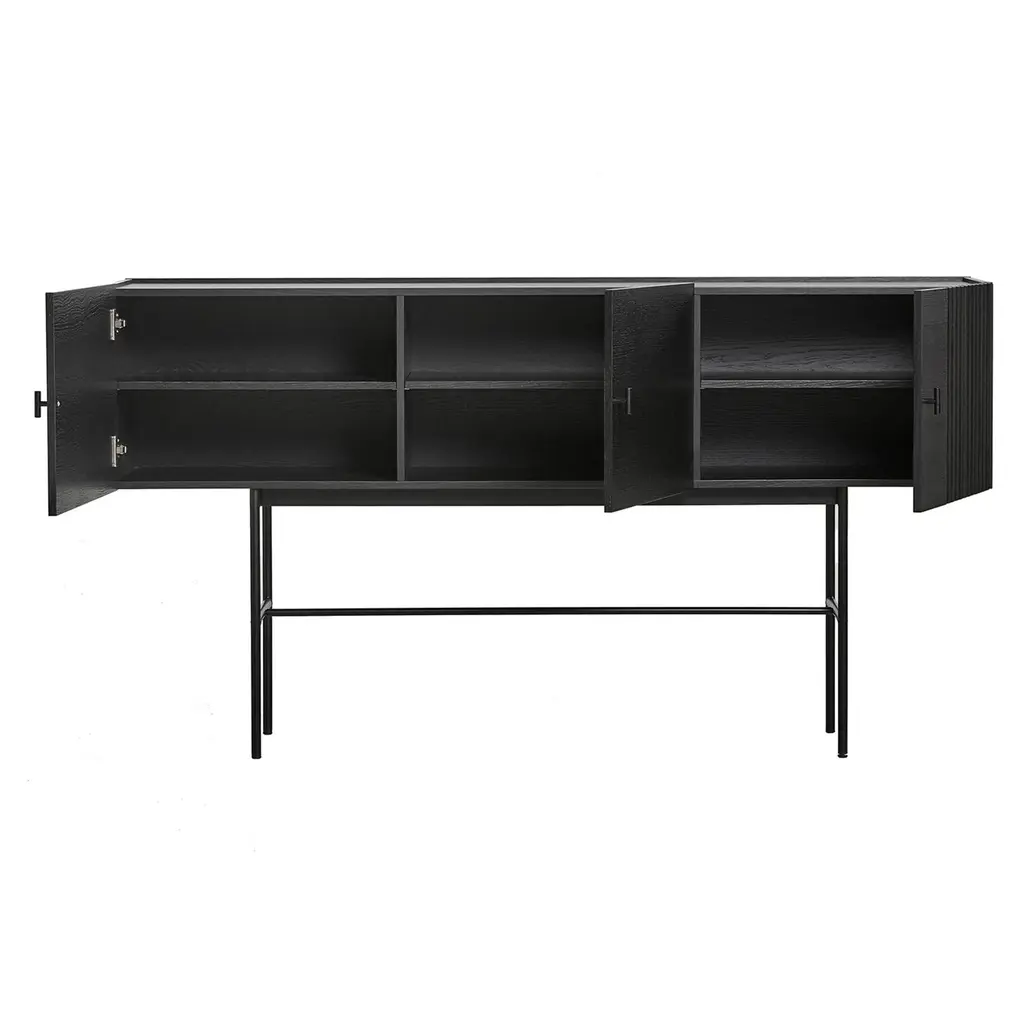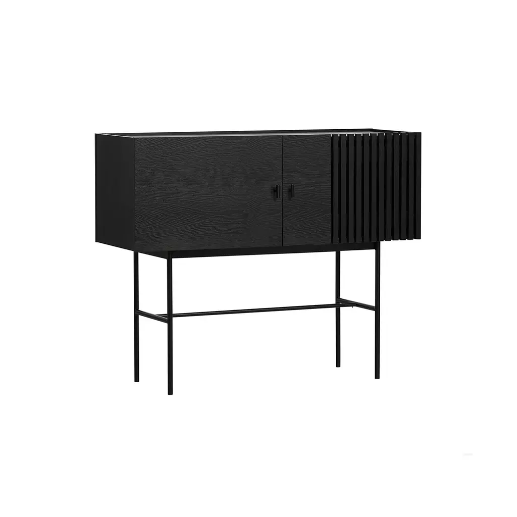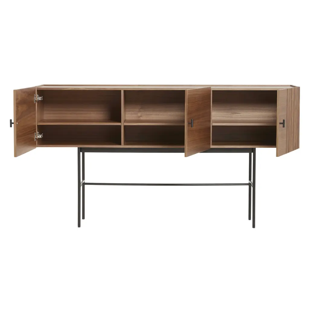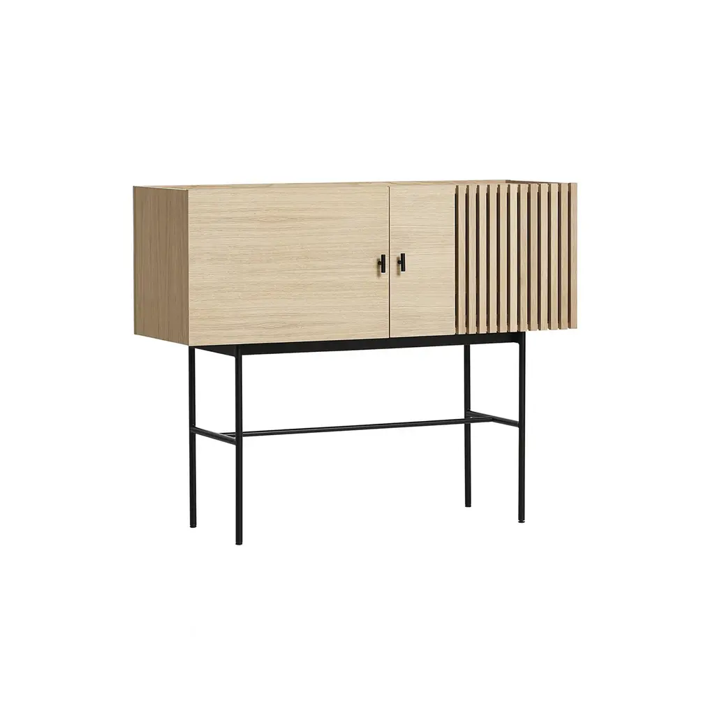 With its asymmetrical front slats, Array seems to tease out a clue about what lays behind its doors. The sideboard from Danish design studio Says Who takes a cue from building cladding for the effect, breaking up the storage piece’s elegant horizontal expanse. And the delicately scaled ironwork base provides both a textural contrast to the wood cabinet and a sense of weightlessness.