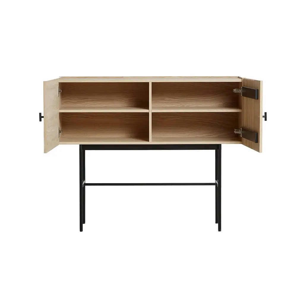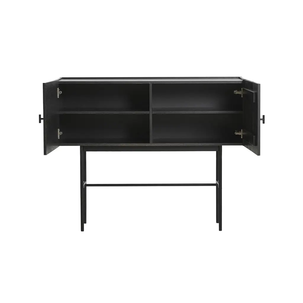 With its asymmetrical front slats, Array seems to tease out a clue about what lays behind its doors. The sideboard from Danish design studio Says Who takes a cue from building cladding for the effect, breaking up the storage piece’s elegant horizontal expanse. And the delicately scaled ironwork base provides both a textural contrast to the wood cabinet and a sense of weightlessness.