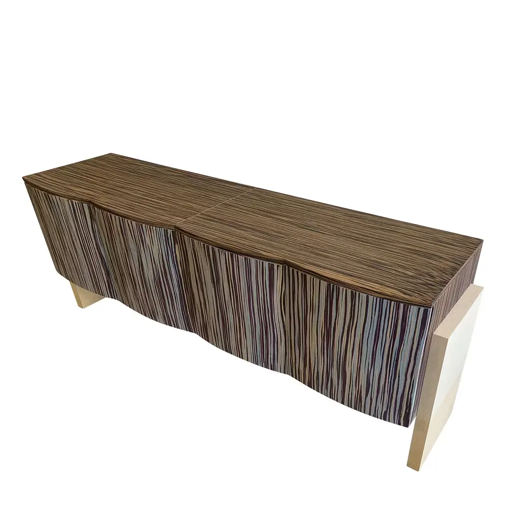 Creating an original and eye-catching focal point in any classic or contemporary interior, this sideboard was singularly created for an Italian Design contest. A one-of-a-kind wooden objet d'art, it rests on solid legs and features four doors standing out from the main structure in a waved motif. Marked by a flame-like veneering, it combines beige and light blue hues merging in an elegant interplay of colors.