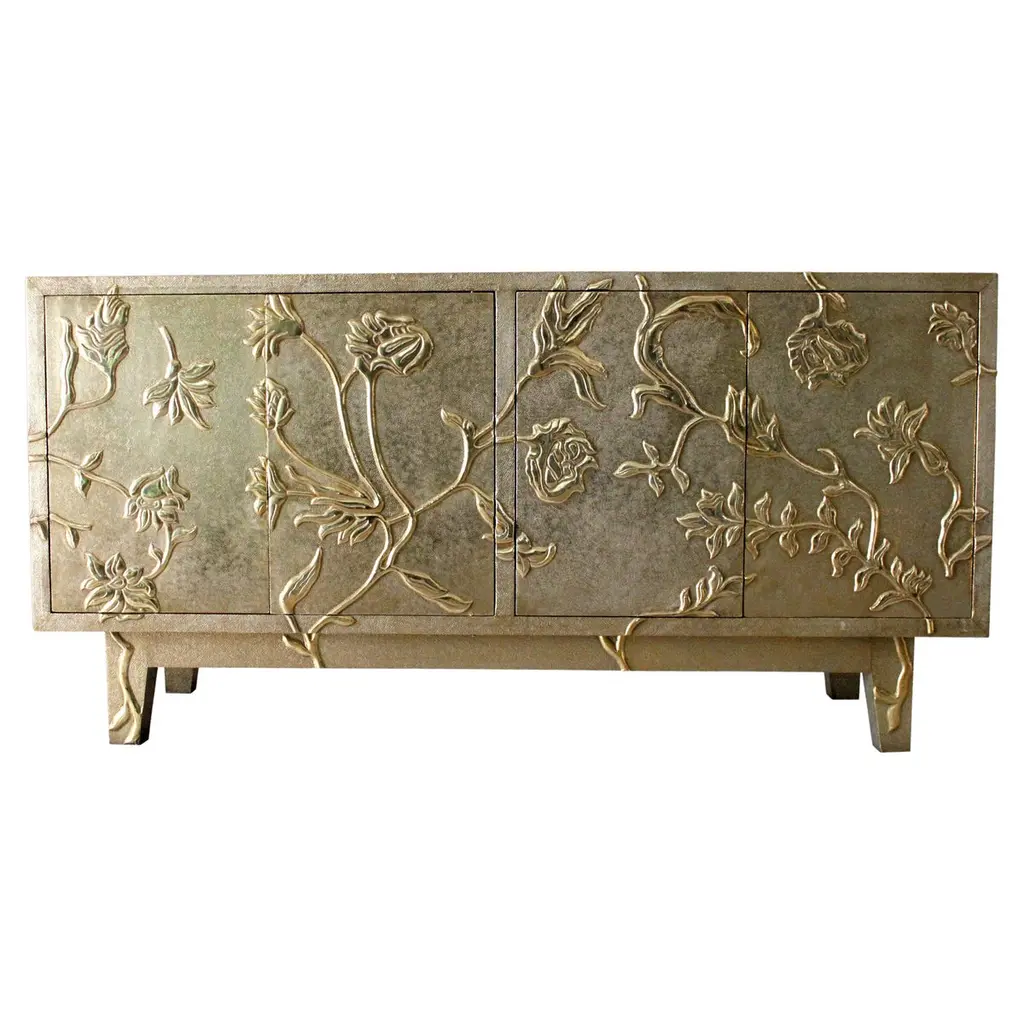 Introducing our exquisite Louise Art Deco Buffet Sideboard, a stunning art deco buffet sideboard inspired by two of the most beloved designs from the Stephanie Odegard collection. Drawing inspiration from the enchanting floral motifs found in the palaces of Rajasthan, as well as the timeless elegance of Paul Mathieu Designs, this art deco buffet sideboard embodies a harmonious blend of beauty and sophistication.Handcrafted with meticulous attention to detail, this art deco buffet sideboard is constructed from solid teak, skillfully joined to create a clean and refined silhouette. Our master craftsmen intricately carve delicate floral forms, which are then encased in a snug-fitting metal skin. The gracefully curved legs and side rails of this exceptional art deco buffet sideboard are meticulously hand-carved from solid teak, showcasing the artistry of our skilled artisans.To achieve its captivating allure, the art deco buffet sideboard is adorned with a choice of metal skins, including Brass, White Bronze, Antiqued Bronze, Silver, and Copper. The metal sheets, whether copper or silver, are carefully traced and cut into complex forms that envelop the entire art deco buffet sideboard. The silver utilized in this art deco buffet sideboard boasts an exceptional purity level of 96%, surpassing the minimum standard for sterling silver at 92.5%. While both silver and copper will develop a natural patina over time, the original luster can be restored effortlessly using regular non-abrasive household metal polishes.Measuring at 78" x 18" x 32" H, the Louise Art Deco Buffet Sideboard in Brass is an embodiment of elegance and functionality. Its generous dimensions provide ample storage space, allowing you to organize your belongings with ease. With its meticulously hand-carved details, hand-hammered metal skin, and a polished semi-matte finish, this buffet sideboard exudes timeless charm and sophistication.We understand the importance of selecting the perfect finish, and therefore, we are delighted to offer samples for your evaluation before confirming your order. This way, you can personally judge and experience the captivating beauty of our Art Deco Buffet Sideboard firsthand.Please note that due to the inherent nature of wood and the impact of environmental factors, such as moisture and temperature changes, the metal skin may develop slight wrinkles or bubbles over time. However, we utilize well-seasoned, reclaimed teak and high-quality marine-grade MDF (wherever technically feasible) to minimize and delay these changes. Please also be aware that our handcrafted metal-clad pieces may exhibit subtle tool marks, serving as a testament to the meticulous craftsmanship behind each piece. For those seeking a flawless surface, our hammered finishes offer a safer alternative, while also providing increased resistance against natural forces and potential bubbling or wrinkling.Elevate your living space with this timeless masterpiece that seamlessly combines the elegance of Art Deco design with impeccable craftsmanship.