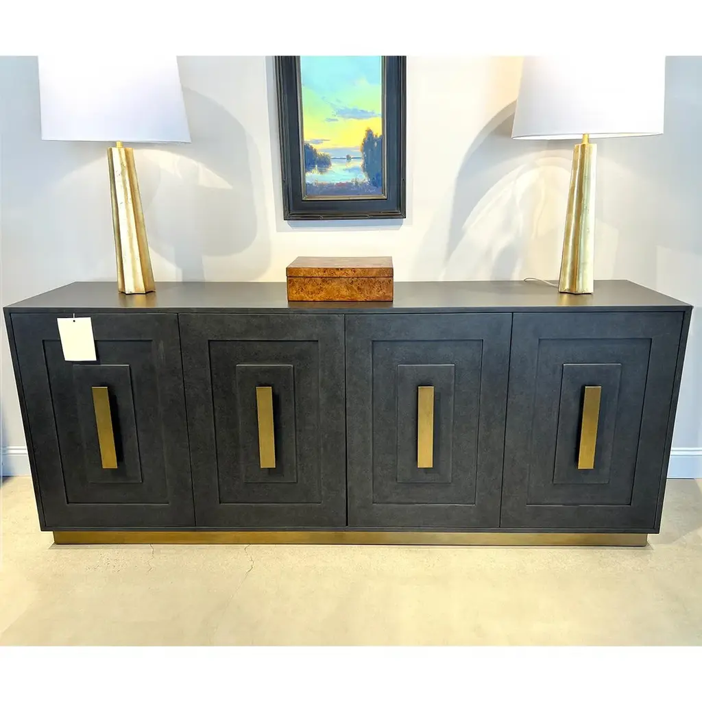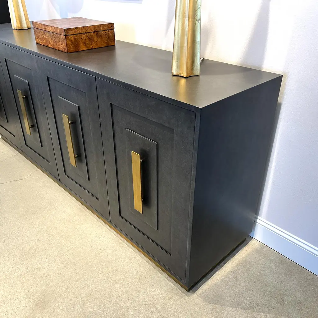A perfect blend of elegance and functionality. This exquisite piece features a smooth top, ideal for showcasing your favorite decor. The door fronts are adorned with raised panel details, adding a touch of sophistication. The smooth brass pulls not only enhance the aesthetic appeal but also provide a sleek, modern touch. Inside, you'll find ample shelving, perfect for organizing your essentials. The hand-painted Charcoal finish exudes luxury, complemented beautifully by the brass plinth base that adds a hint of vintage charm. Dimensions: 84" W x 19" D x 34" H