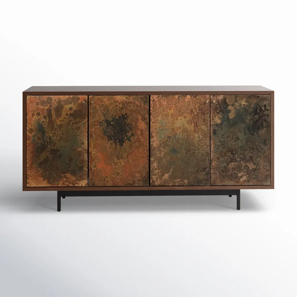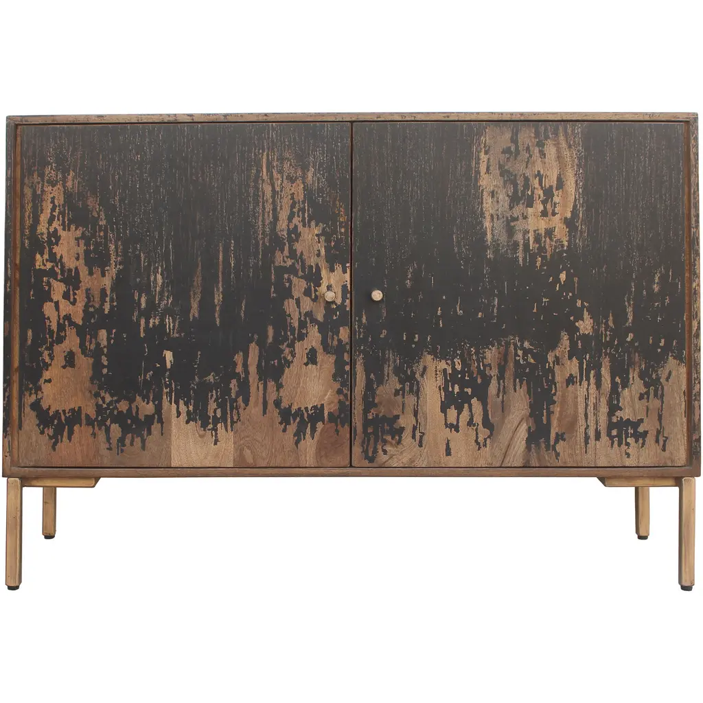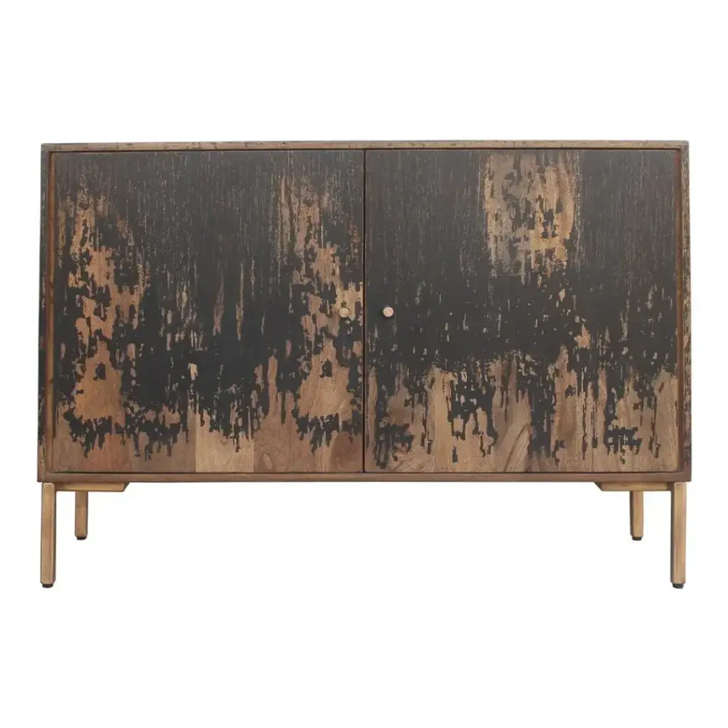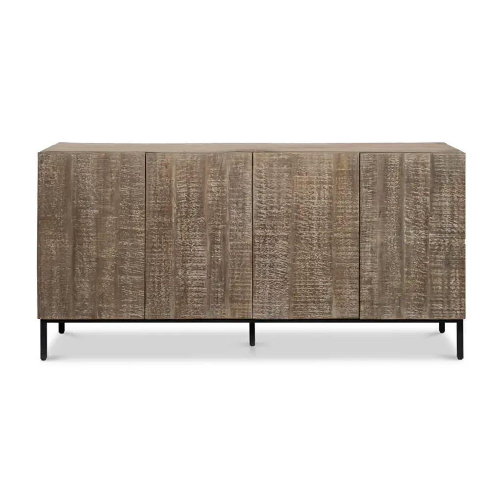 With a rustic finish, this solid hardwood sideboard will feel like it's been a part of your family for generations. The four doors open up to a fixed, center shelf, providing plenty of storage to help keep your space neat and tidy. Black antiqued finish over a golden stain.