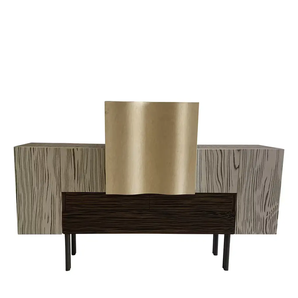Introduce elegance and function to your space with the Asymmetric Wooden 4-Door Sideboard by Mogg Ritratti. Crafted from veneered with toulipier wood and finished with glossy and matte lacquered effects, this sideboard offers four internal shelves for ample storage. Available in warm or cool tones for a sophisticated touch.