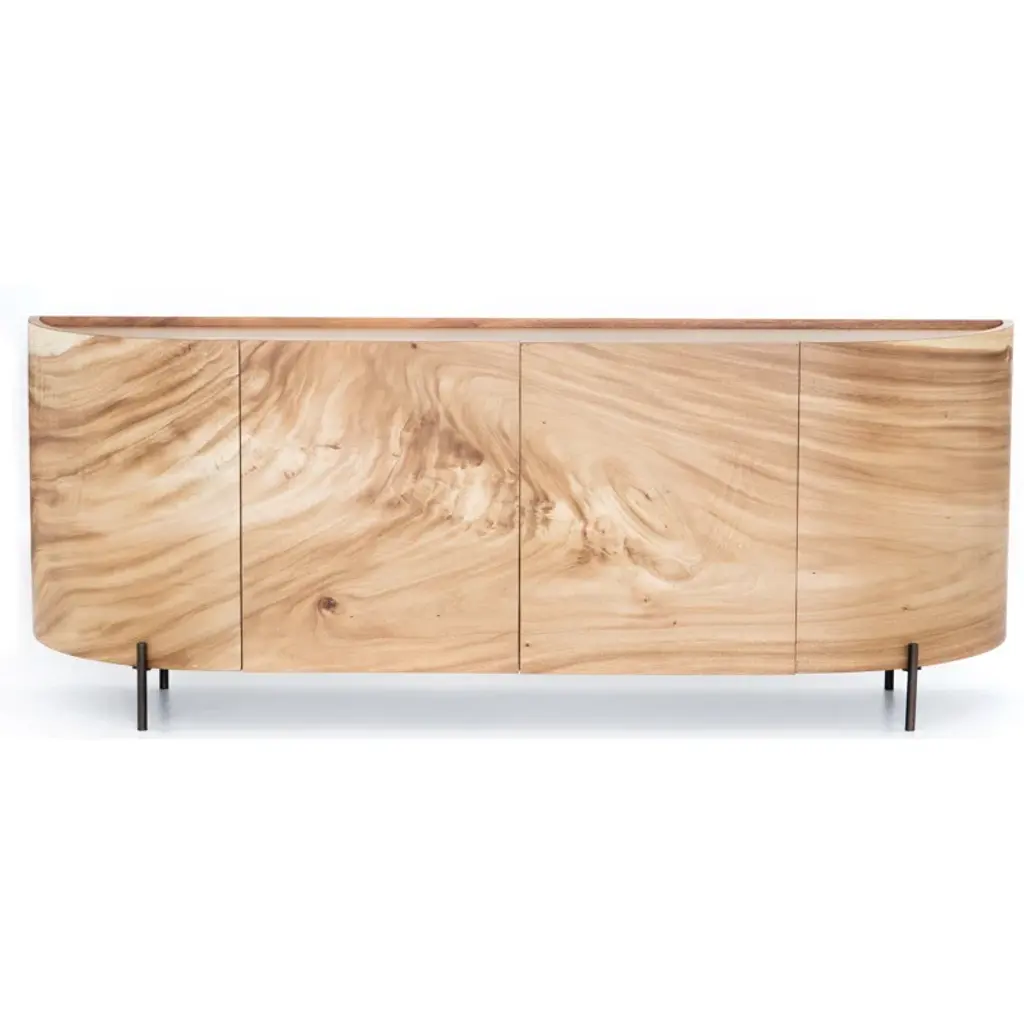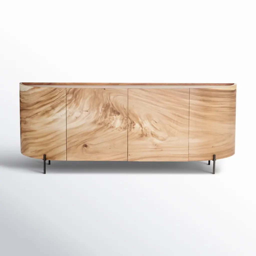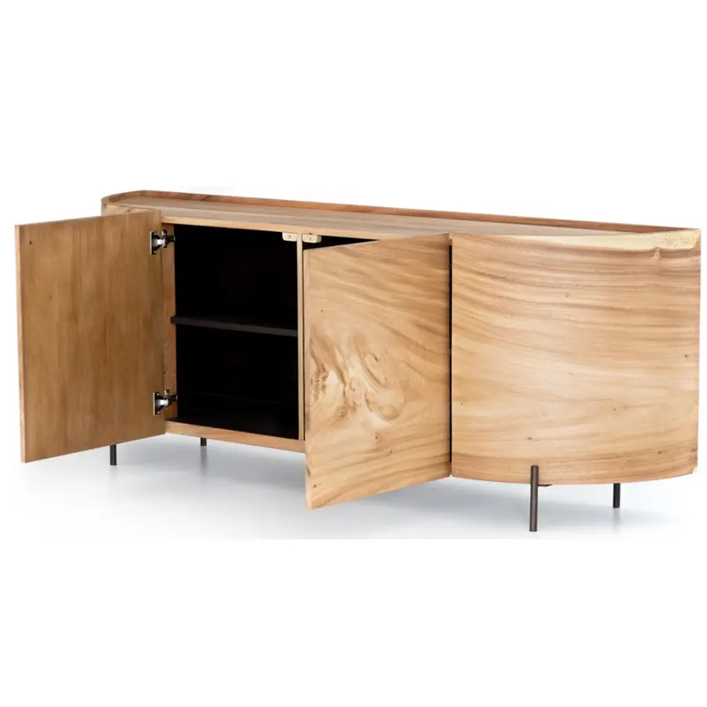 The Athens mid-century modern sideboard features four interior storage cabinets with shelves that provide a unique touch of elegance and functionality. Its simple yet, sophisticated design allows it to blend seamlessly with any decor style, making it a versatile piece that can easily be incorporated into any setting. Crafted from solid mango wood, this media cabinet showcases a beautiful natural grain pattern, and its rich, aged mahogany finish complements the overall design.