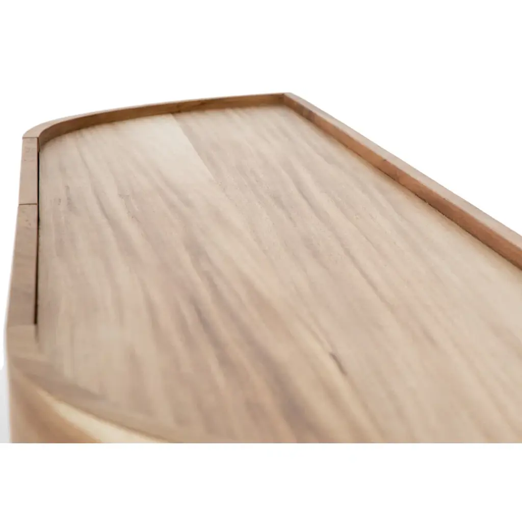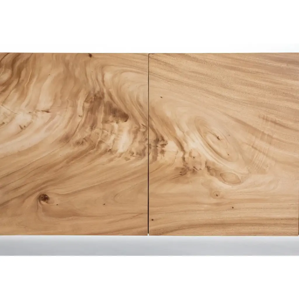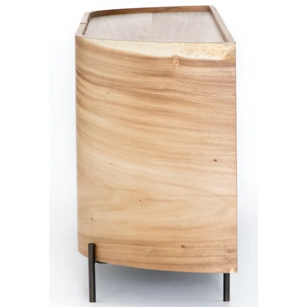 The Athens mid-century modern sideboard features four interior storage cabinets with shelves that provide a unique touch of elegance and functionality. Its simple yet, sophisticated design allows it to blend seamlessly with any decor style, making it a versatile piece that can easily be incorporated into any setting. Crafted from solid mango wood, this media cabinet showcases a beautiful natural grain pattern, and its rich, aged mahogany finish complements the overall design.