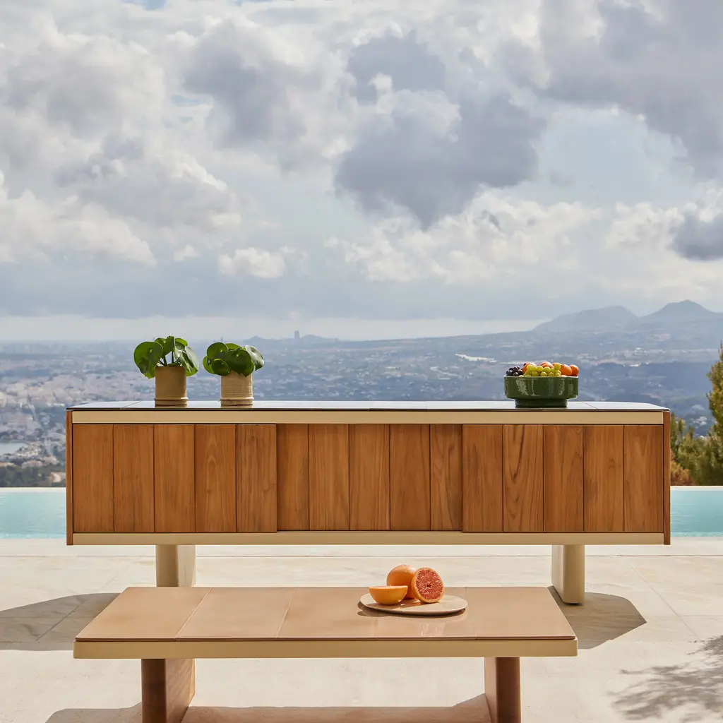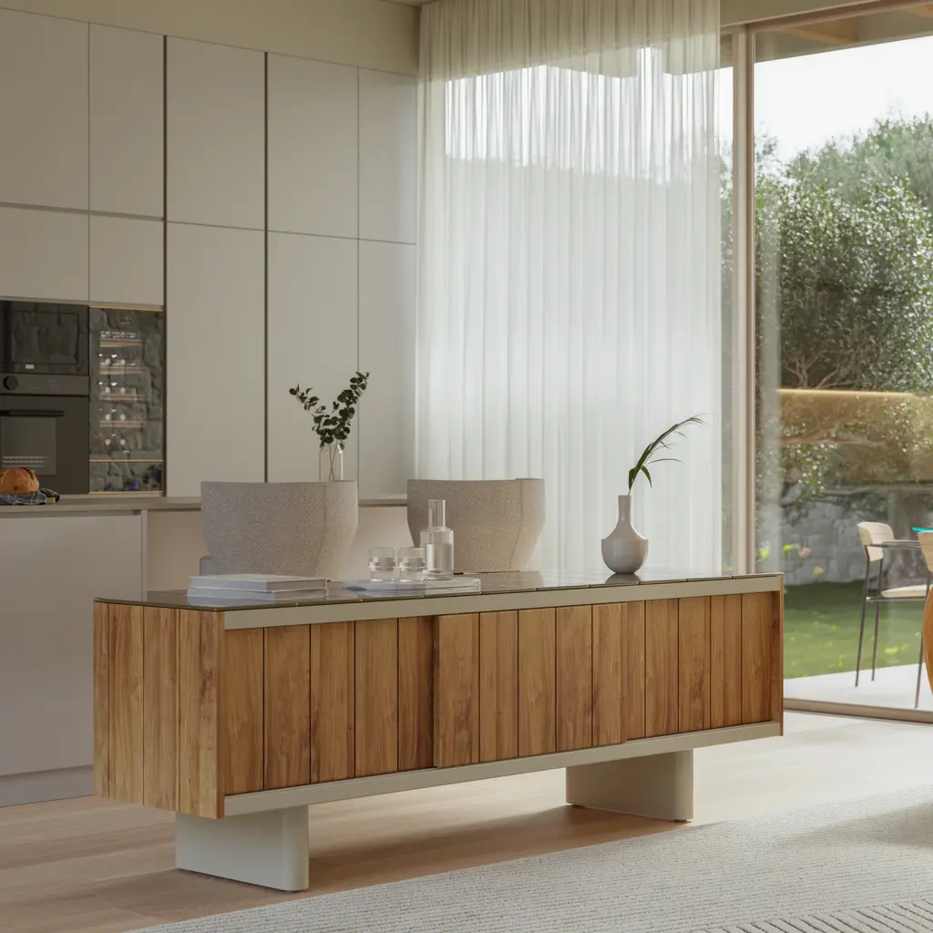 The Sideboard is constructed from solid FSC-certified teak wood and is available in 4 sizes. The sideboard features sliding doors and an interior shelf, offering generous storage capacity. Its structure, legs, and runners are made of beige powder-coated aluminum, ensuring durability for both indoor and covered outdoor settings.