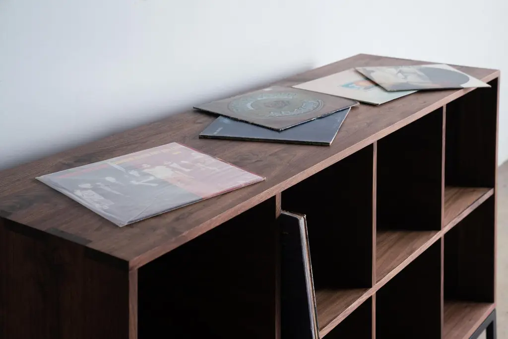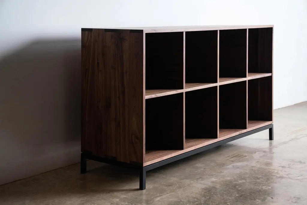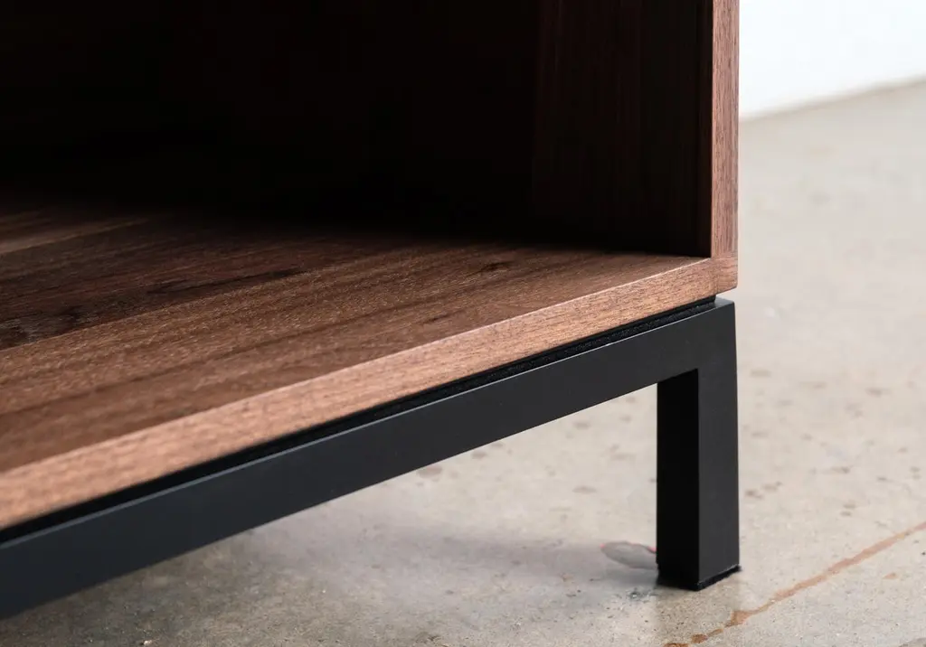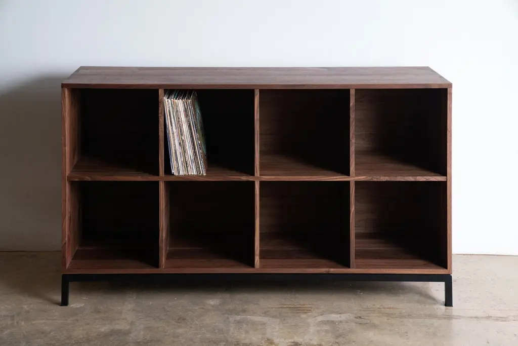 The Max Audio Storage Credenza has sleek lines and modern use of traditional joinery to act as an LP lovers vinyl record storage and a surface for audio equipment. Beautifully display your collection in a cozy den or entertainment room. Images shown are in Walnut Wood with Black Steel Base. Solid and plywood materials are combined with a hand-fabricated steel base for durability and aesthetics. Urban hardwood means it's eco-friendly. Expert craftsmanship makes it tomorrow's heirloom. All made in the USA.Urban wood has character. Walnut pieces may contain color variations ranging from deep brown to light yellow. Character can include variations in color and grain, small pin knots, evidence of historical intrusion. There may be cracks or knots that we fill, patch or join in a considered and artful way at the makers discretion. We look at every slab and decide what needs a patch or epoxy or both. Case by case, one may be more effective and better for the furniture, aesthetically, structurally, and for our process. Please note: If a specific tool, like a patch, is not desired, please specify this when ordering. This may require procuring different lumber which can alter costs. If color adjustment is requested on a completed piece after the fact, we will charge additionally for a custom stain.These are made to order, so custom sizes can be accomplished. Just send us a message and you'll get a customized quote.