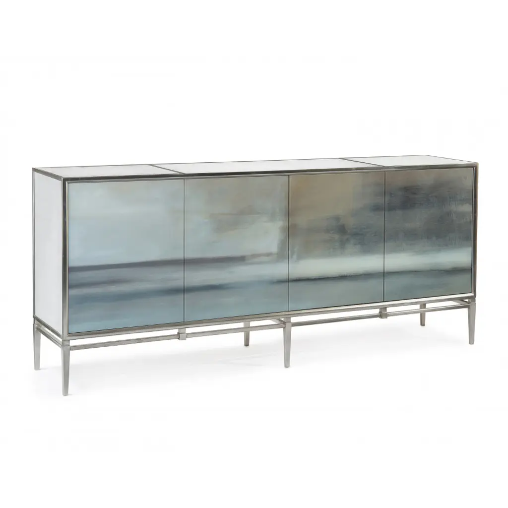 The Audley sideboard in American white oak features center storage between two columns of three drawers each. The case is finished in driftwood and set on a base in brushed stainless steel. The entire front is finished in Truro sil