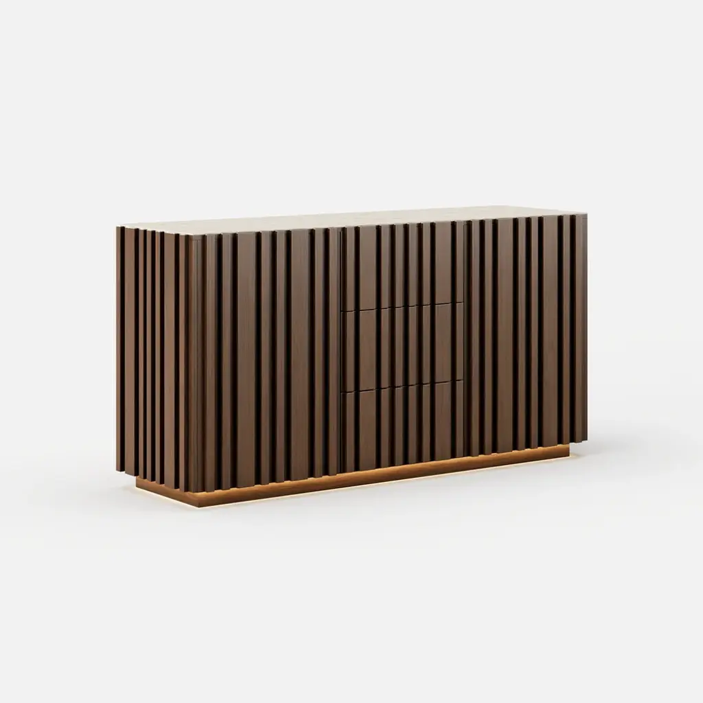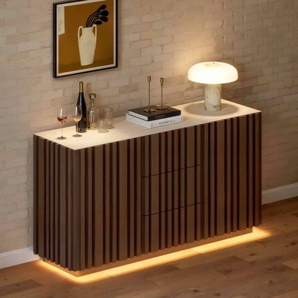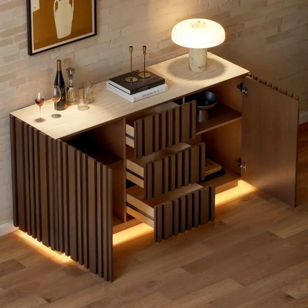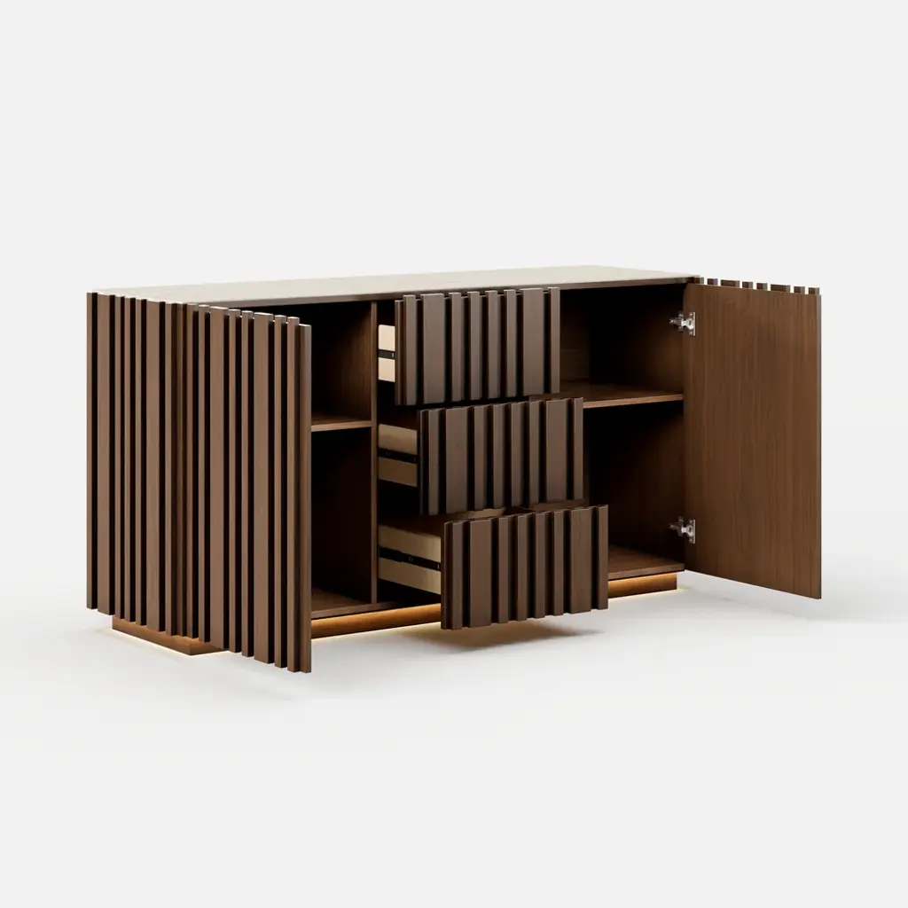Crafted for modern dining spaces, this buffet brings together natural elegance and functional design. The faux travertine sintered stone top delivers timeless stone-inspired beauty while offering heat, scratch, and stain resistance for everyday use. Vertical ash wood slatted panels create sculptural rhythm and warmth, highlighted by integrated LED lighting at the base that enhances the ambiance. Inside, multiple drawers and adjustable shelves provide versatile storage for dinnerware, glassware, and entertaining essentials. A refined balance of texture, function, and light, this piece elevates your dining room with effortless sophistication.