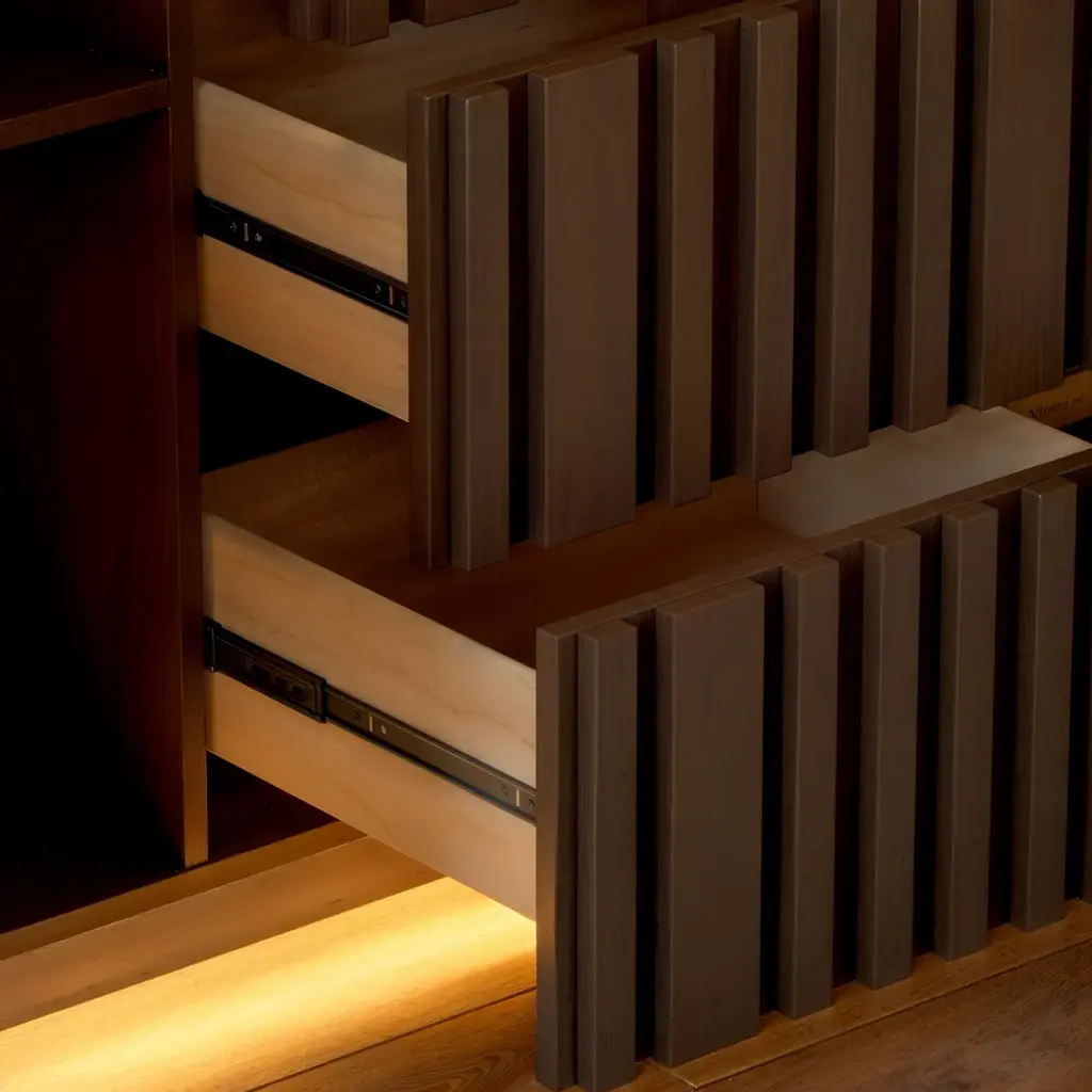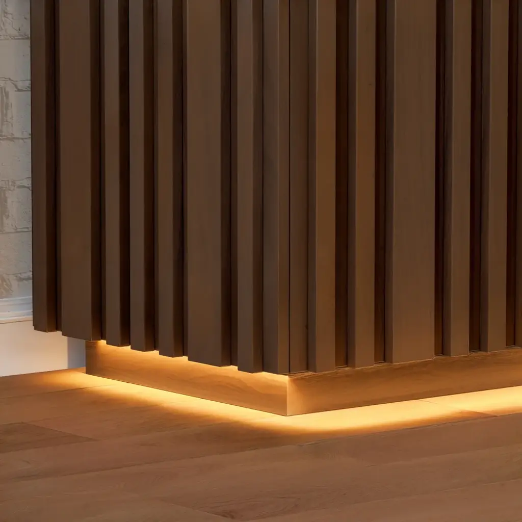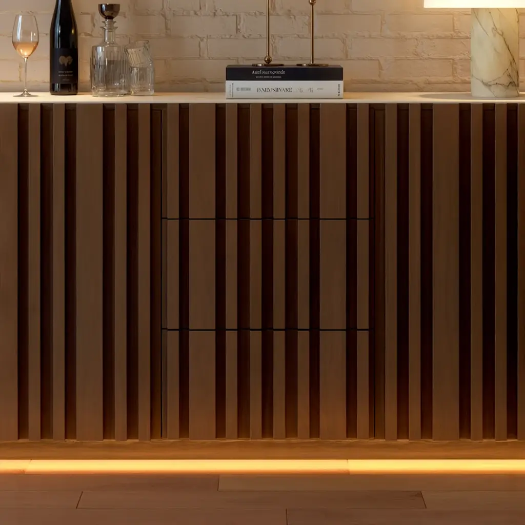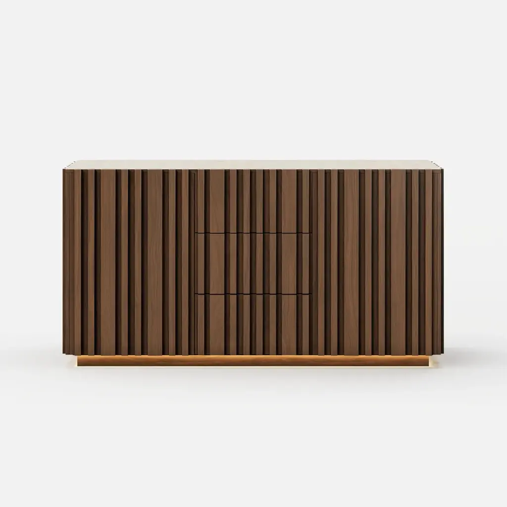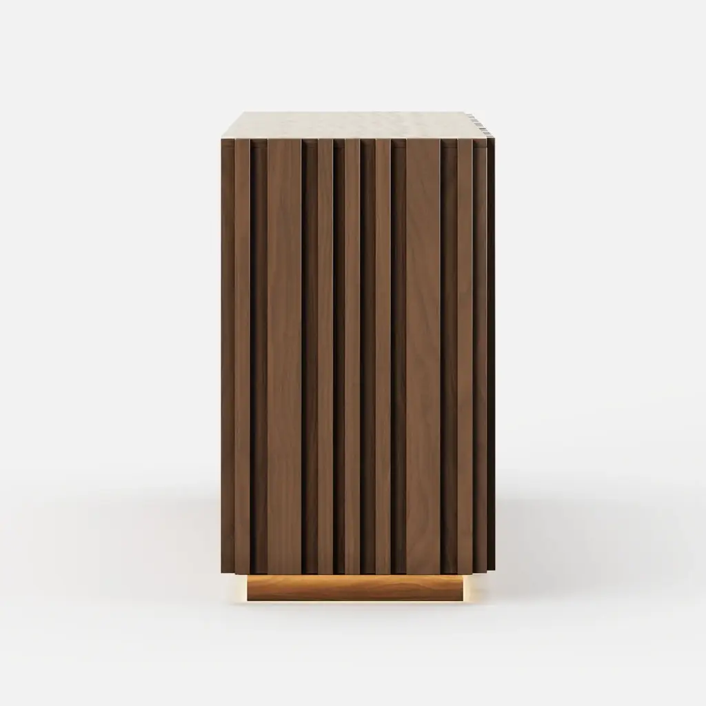 Crafted for modern dining spaces, this buffet brings together natural elegance and functional design. The faux travertine sintered stone top delivers timeless stone-inspired beauty while offering heat, scratch, and stain resistance for everyday use. Vertical ash wood slatted panels create sculptural rhythm and warmth, highlighted by integrated LED lighting at the base that enhances the ambiance. Inside, multiple drawers and adjustable shelves provide versatile storage for dinnerware, glassware, and entertaining essentials. A refined balance of texture, function, and light, this piece elevates your dining room with effortless sophistication.