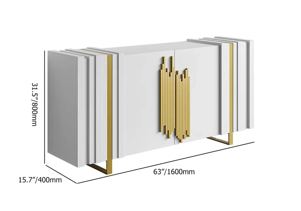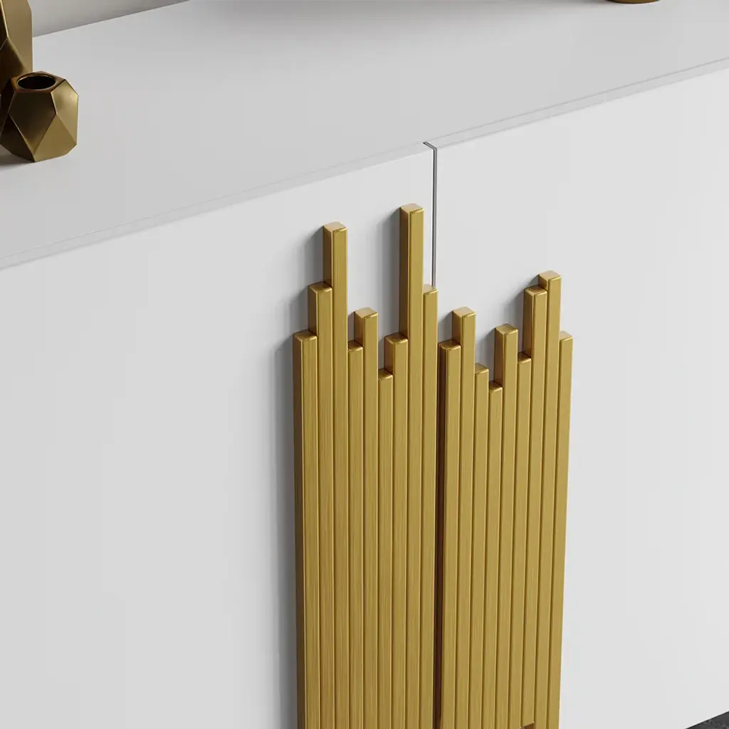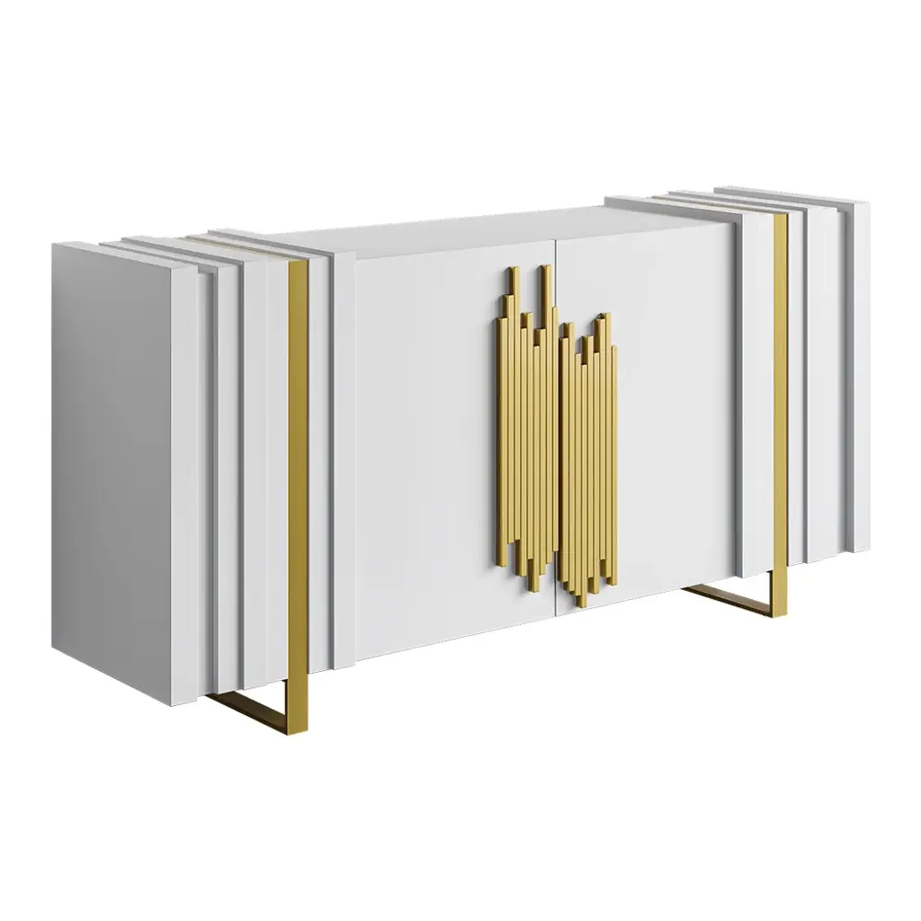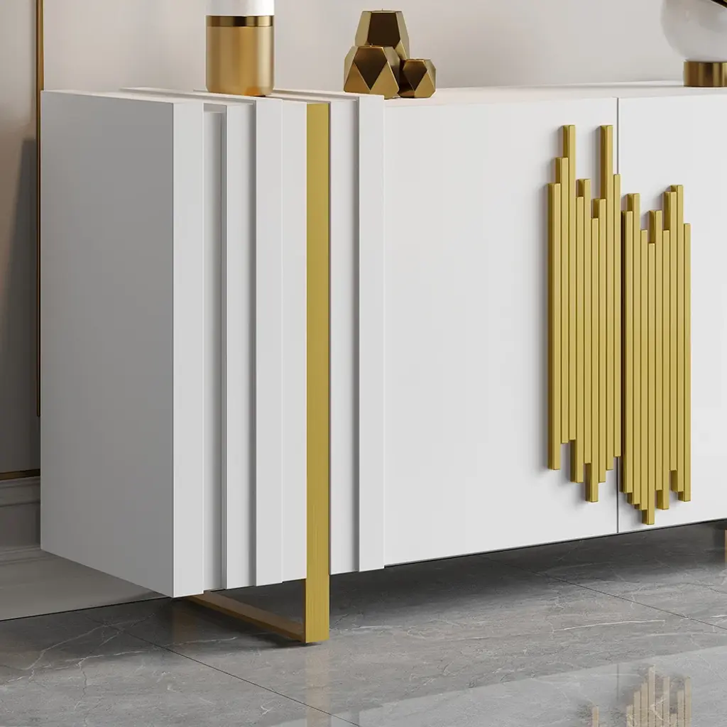 This white and gold sideboard features a layered design with vertical gold bar accents adding striking visual rhythm. Crafted from durable MDF with golden stainless steel handles and legs, it combines modern sophistication with practical function. Two doors conceal two shelves, offering organized storage for dining essentials.