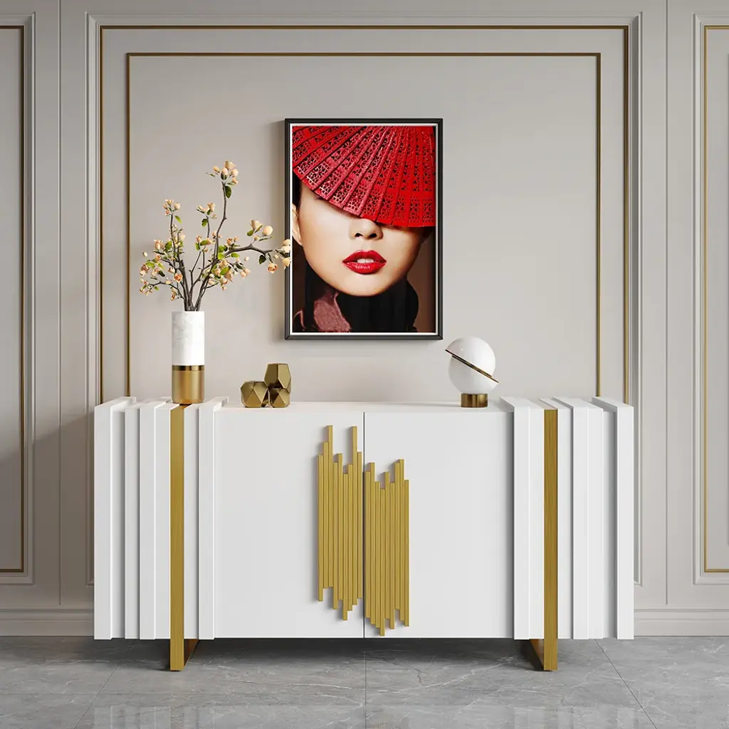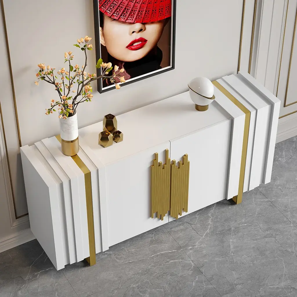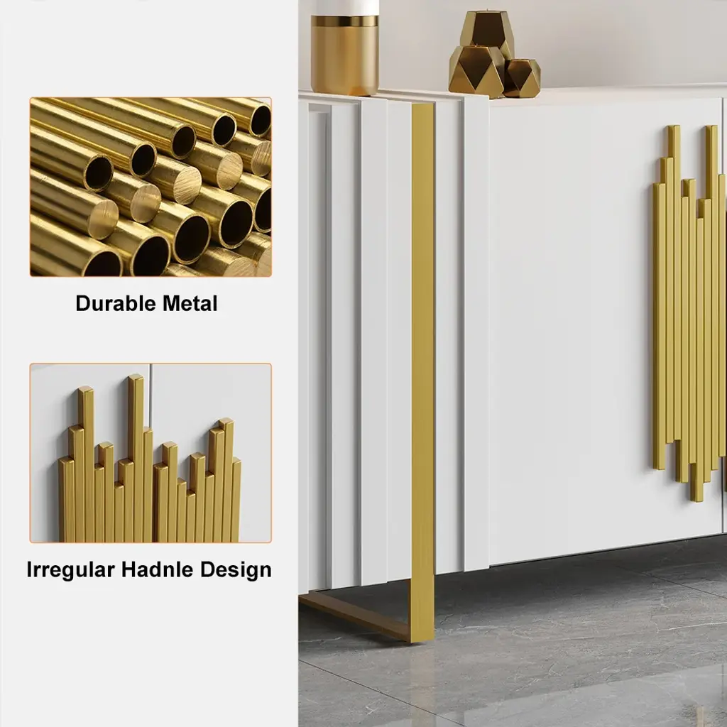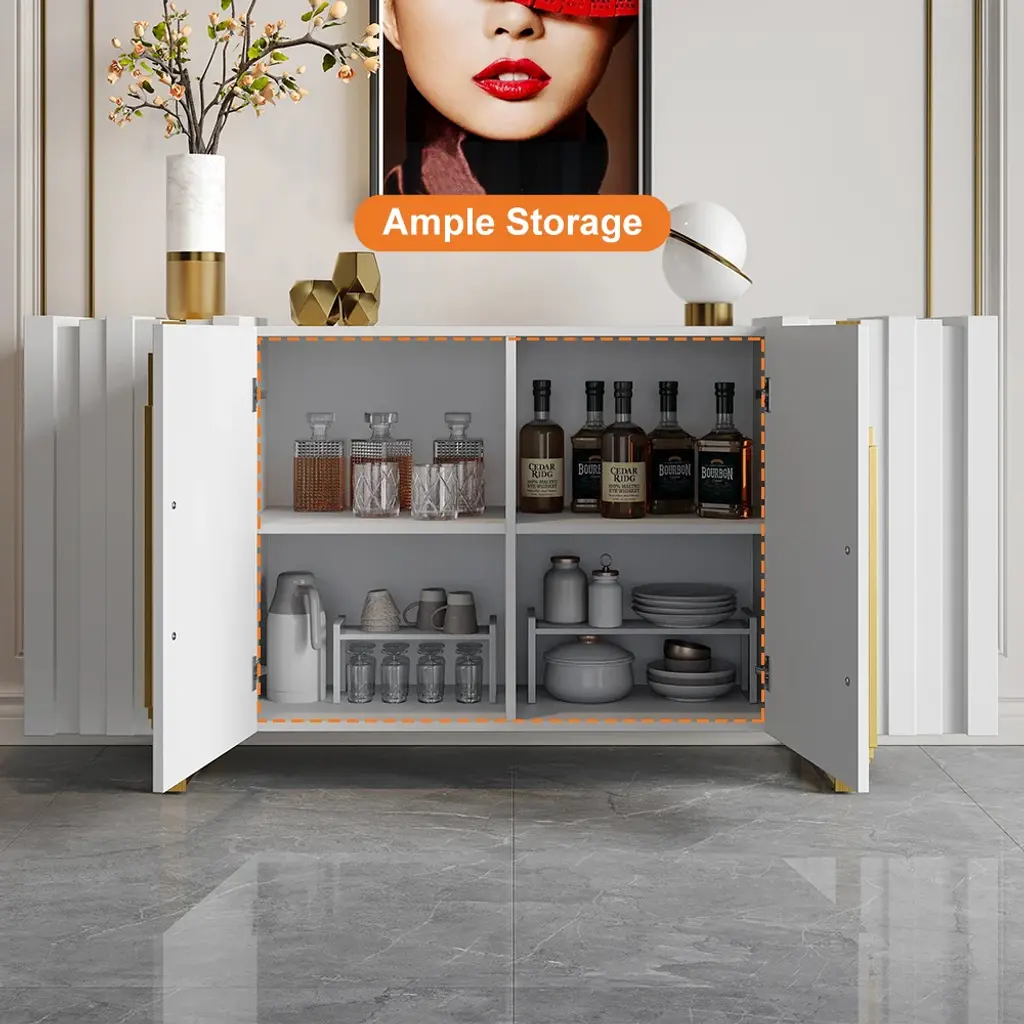 This white and gold sideboard features a layered design with vertical gold bar accents adding striking visual rhythm. Crafted from durable MDF with golden stainless steel handles and legs, it combines modern sophistication with practical function. Two doors conceal two shelves, offering organized storage for dining essentials.